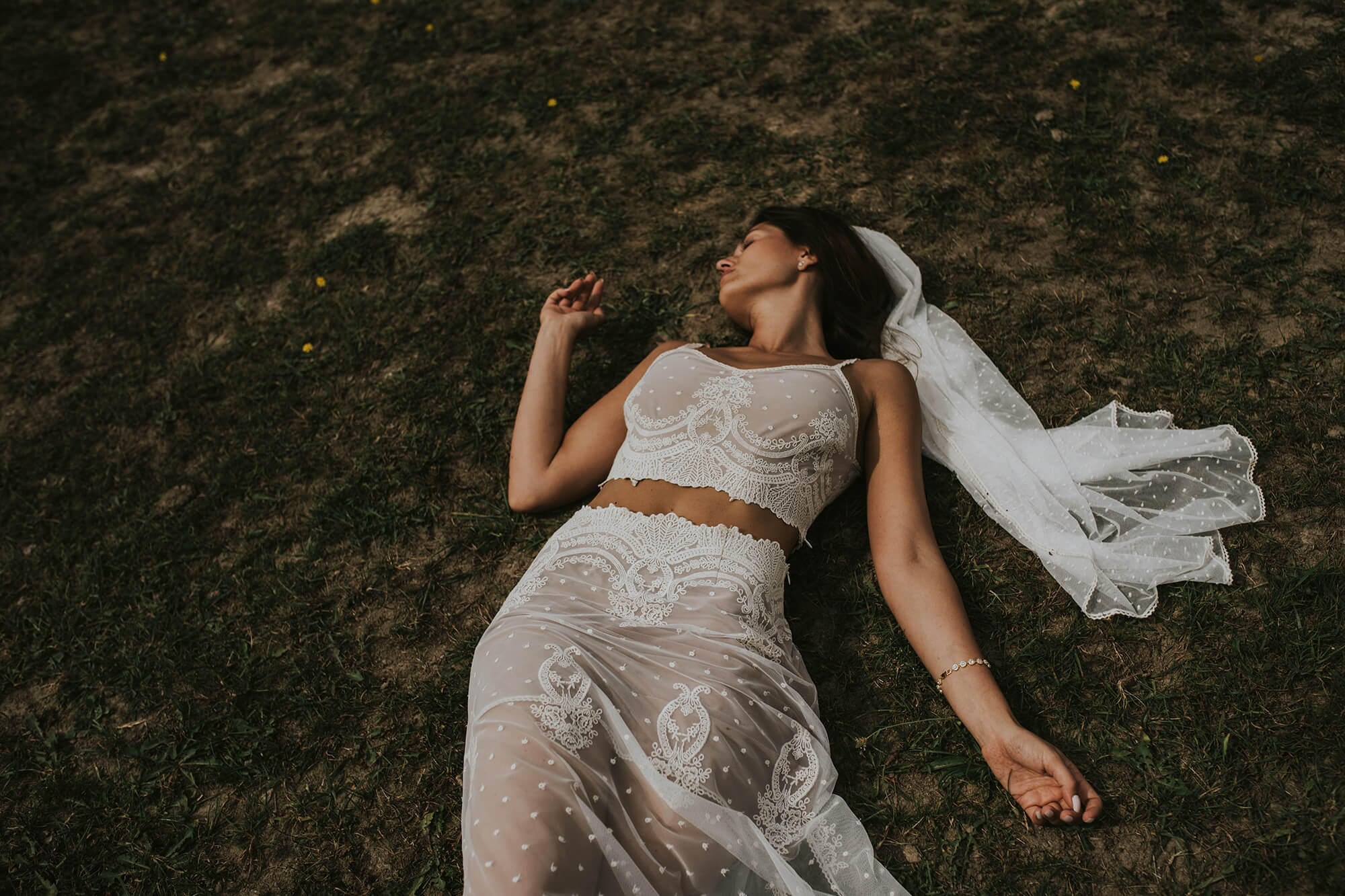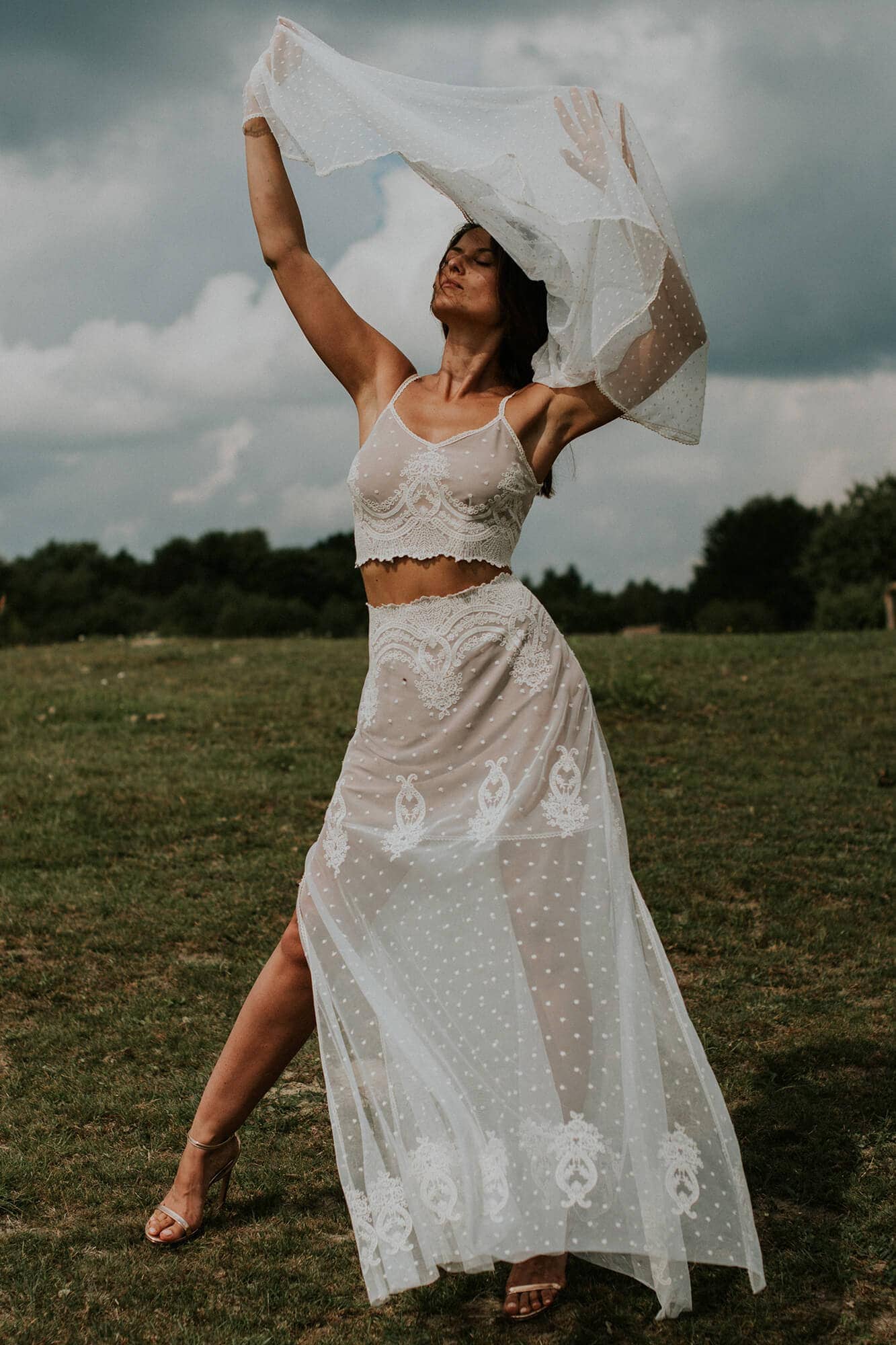 Beżowe suknie ślubne stanowią piękne tło dla wielu typów urody. Są idealną bazą, która podkreśla ich wyjątkowość i niepowtarzalne cechy. Ten unikalny model z kolekcji Barcelona został uszyty z beżowej bawełnianej koronki, która została rozmieszczona na cielistej elastycznej podszewce. Dwuczęściowa suknia ślubna to propozycja idealnie wpisująca się w klimat ślubów organizowanych w stylu boho czy rustykalnym. Świetnie sprawdzi się podczas plenerowych ślubów albo skromnych ceremonii w urokliwych miejscach. Jeśli jednak marzy Ci się styl vintage i chcesz, aby Twoja suknia ślubna zyskała jeszcze bardziej ślubny charakter to możesz śmiało połączyć ją z inną wyjątkową propozycją z kolekcji Barcelona – lekką, zwiewną, tiulową suknią w drobne kropeczki, którą znajdziesz pod numerem 14. W dniu ślubu poza oszałamiającym wyglądem ważna jest też Twoja wygoda. Do topu na cienkich ramiączkach z łagodnie wyciętym dekoltem możesz śmiało założyć biustonosz – będziesz miała pewność, że przez całą ceremonię Twój biust będzie odpowiednio podtrzymany i wyeksponowany. Dół sukni, czyli spódnica ma po obu stronach rozporki przez co jest nie tylko wygodna, ale też seksowna. Pod spodem znajduje się krótka podszewka w kolorze cielistym. Dwuczęściowa suknia ślubna to wyjątkowo praktycznie rozwiązanie – przede wszystkim bez wprowadzania większych zmian możesz założyć ją na wiele okazji, a nie tylko w dniu Twojego ślubu. Wystarczy, że zestawisz top albo spódnicę z zupełnie innym elementem swojej garderoby, a cała stylizacja zyska zupełnie nowe oblicze. Top możesz na przykład połączyć z obszerną narzutką przyozdobioną frędzlami i będzie pięknie prezentował się podczas wakacji w egzotycznym miejscu, a spódnica może towarzyszyć Ci podczas oficjalnych uroczystości. Koronki możesz w łatwy sposób zafarbować i nadać temu ślubnemu zestawowi zupełnie nowe oblicze – Twoją kreatywność w tej kwestii ogranicza jedynie dostępna paleta barw. Beżowe suknie ślubne dają mnóstwo możliwości modyfikacji i za to je uwielbiamy!