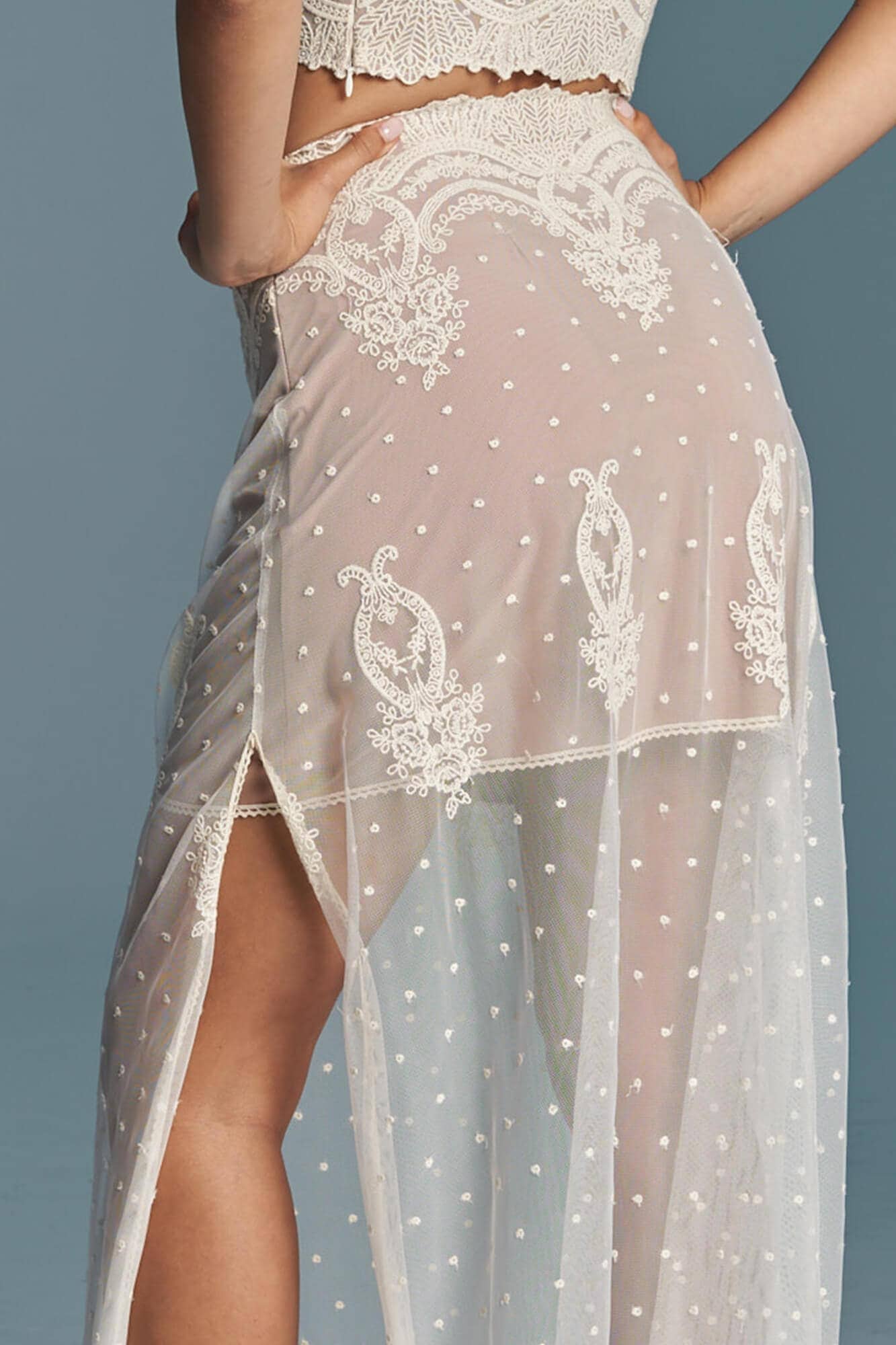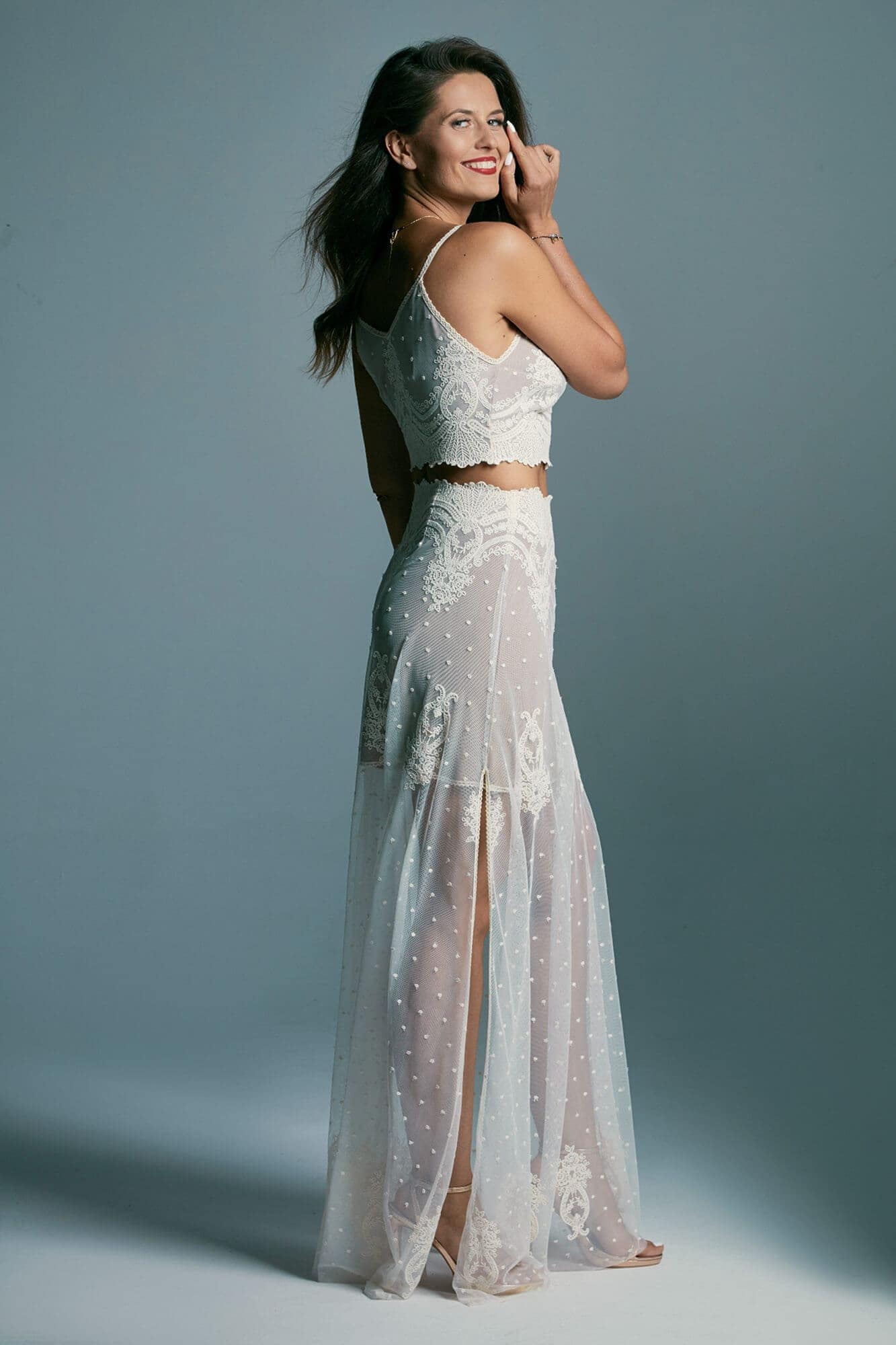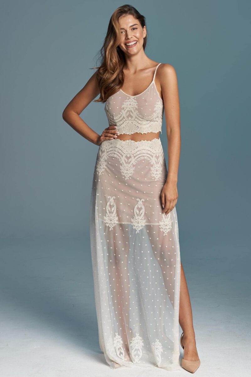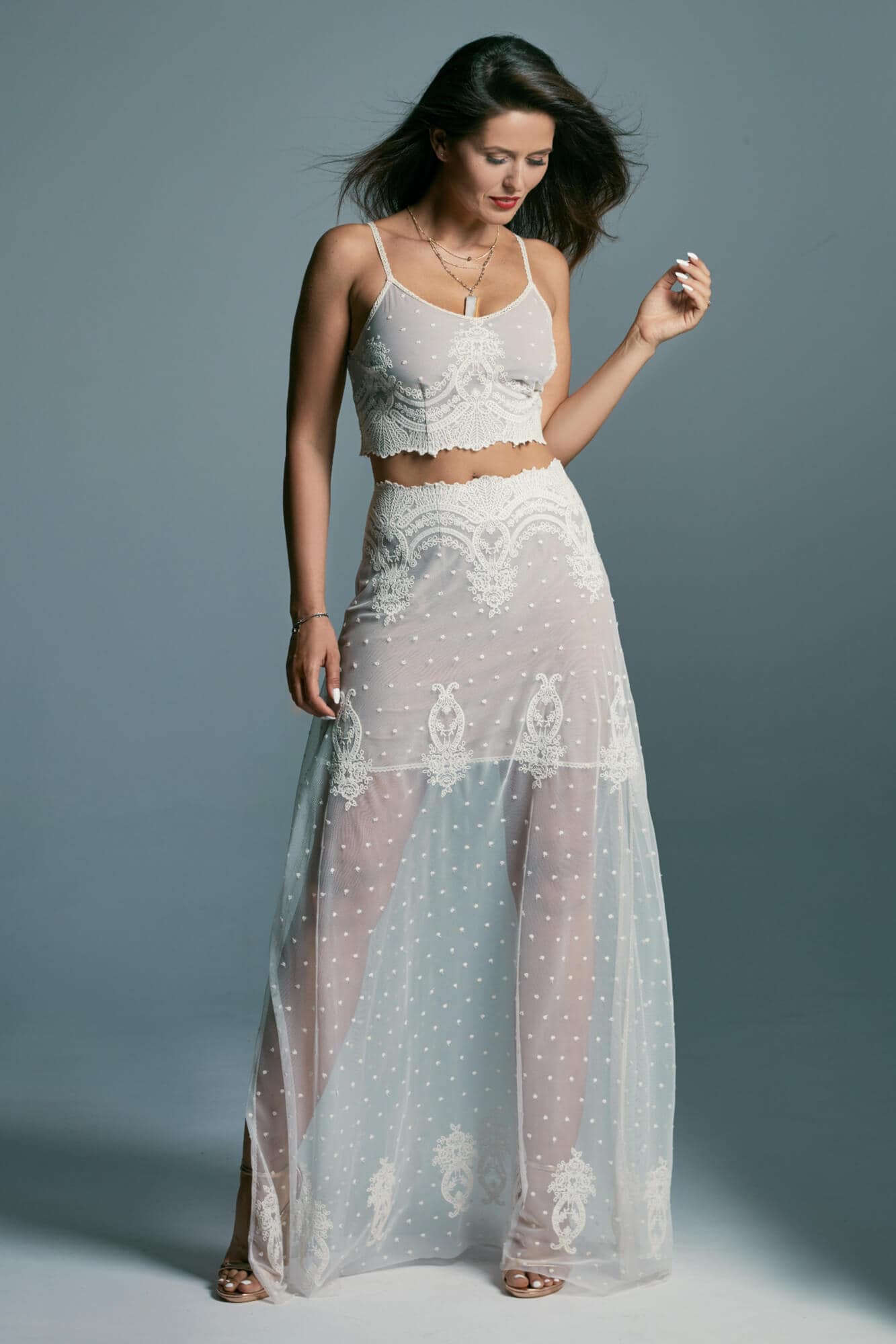 Dwuczęściowy komplet z bawełnianej koronki to idealna propozycja na ślub na plaży. Po ceremonii elementy możesz nosić jako niezależne od siebie, łącząc np. top w jeansami a spódnicę z ciężkimi butami i swetrem. Jeśli jednak wolisz nie odsłaniać brzucha czy nóg to pamiętaj, że szyjąc ten model dla Ciebie na miarę możemy połączyć elementy w całość (by powstała sukienka), zamienić krótką podszewkę w długą, zmienić kształt dekoltu, szerokość ramiączek, dodać rękawy, zmienić długość spódnicy czy kolor podszewki. Komplet możesz także połączyć z narzutką Barcelona 1.
