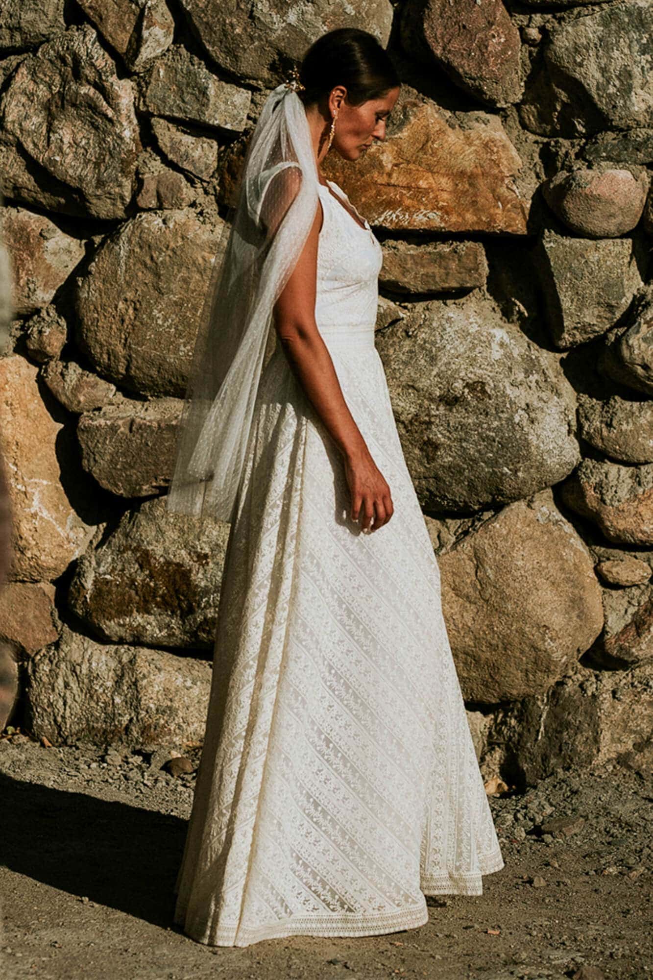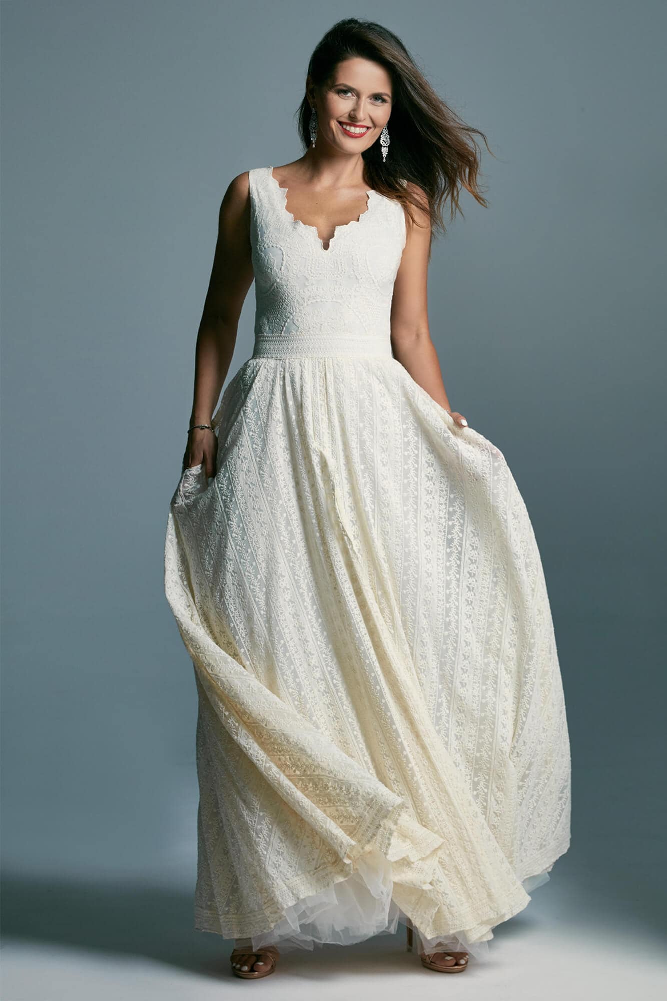 Elegancka suknia ślubna z bawełnianej, beżowej koronki, z obfitą spódnicą. Idealna propozycja dla dziewczyn, które kochają sielskie klimaty, ale jednocześnie chcą wyglądać elegancko. W oryginale suknia odsłania ramiona, spódnica mimo rozcięcia nie odsłania nóg, a podszewka jest biała – kontrastowa dla beżowej koronki. Pamiętaj jednak, że szyjąc ten model dla Ciebie na miarę możemy dodać dowolne rękawy, zmienić objętość spódnicy, dodać rozcięcie w podszewce, po to by pokazać nogi a także wymienić kolor podbicia na cielisty lub piaskowy.