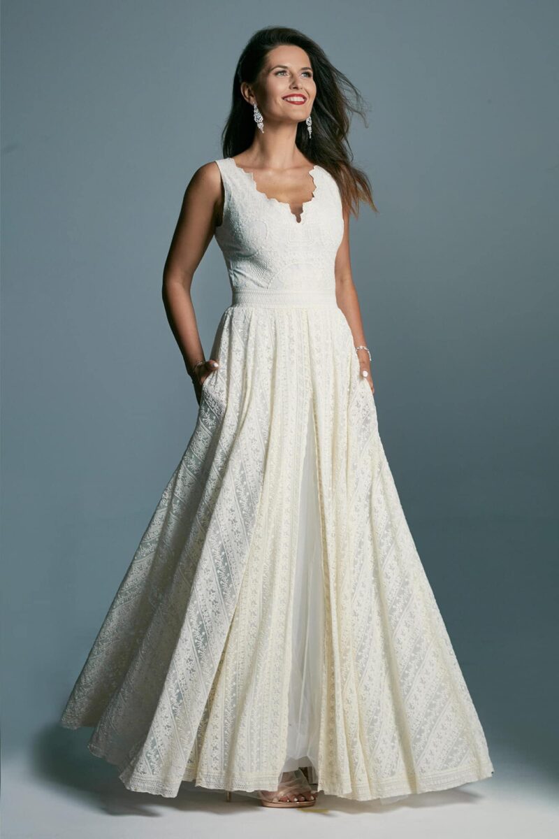 Biała suknia ślubna to dla wielu kobiet pierwsze i oczywiste skojarzenie z tym ważnym dniem w ich życiu. Jeśli dla Ciebie również, to ta propozycja na pewno Ci się spodoba. Klasyczna suknia ślubna została uszyta z bawełnianej koronki w kolorze beżowym, ułożonej miękko na białej podszewce, przyozdobionej na dole warstwą delikatnego tiulu. To propozycja dla miłośniczek klasycznej ślubnej elegancji. Z przodu znajduje się głęboki dekolt pięknie eksponujący szyję i obojczyki. Subtelne wykończenie góry bogatą krawędzią – krajką, zachwyca i przyciąga wzrok. Zastosowanie tego samego rozwiązania na plecach ma oczywisty walor wizualny, ale też praktyczny – pozwala na założenie biustonosza. To idealne rozwiązanie dla Ciebie, jeśli nie czujesz się komfortowo bez tego elementu garderoby lub nie satysfakcjonują Cię jedynie wszyte w suknię miseczki. Układ wzorów na bluzce nie jest przypadkowy – ma za zadanie modelować sylwetkę na kształt klepsydry, uznawany powszechnie za idealne proporcje sylwetki. Spódnica z koła w kształcie litery A została uszyta z koronki we wzór pasów, które w trakcie poruszania zmieniają swoje położenie i dają niesamowity efekt widoczny szczególnie podczas tańca. Szeroki pas sprawdzi się idealnie, jeśli dodatkowo chcesz podkreślić swoje wcięcie w talii. Biała suknia ślubna w nowym wydaniu to propozycja dla miłośniczek tradycyjnych rozwiązań wzbogaconych o nutę nowoczesności. Pod spodem tej klasycznej sukni ślubnej znajduje się dodatkowa warstwa cielistego tiulu, który podnosi koronkę, a jednocześnie wygląda dekoracyjnie przez rozporek z przodu, nadając klasyce modowy wymiar. Na bokach sukni znajdują się również kieszenie, które sprawiają, że zyskuje ona nowoczesny i praktyczny charakter. Kreacja została uszyta z łatwych do zabarwienia koronek, które można zafarbować na dowolny kolor – dzięki tej możliwości modyfikacji suknia może być wykorzystana także na inne wyjścia. Po ślubie możesz ją oczywiście również skrócić, dzięki czemu zyska zupełnie inny charakter – co powiesz na długość do połowy łydki?