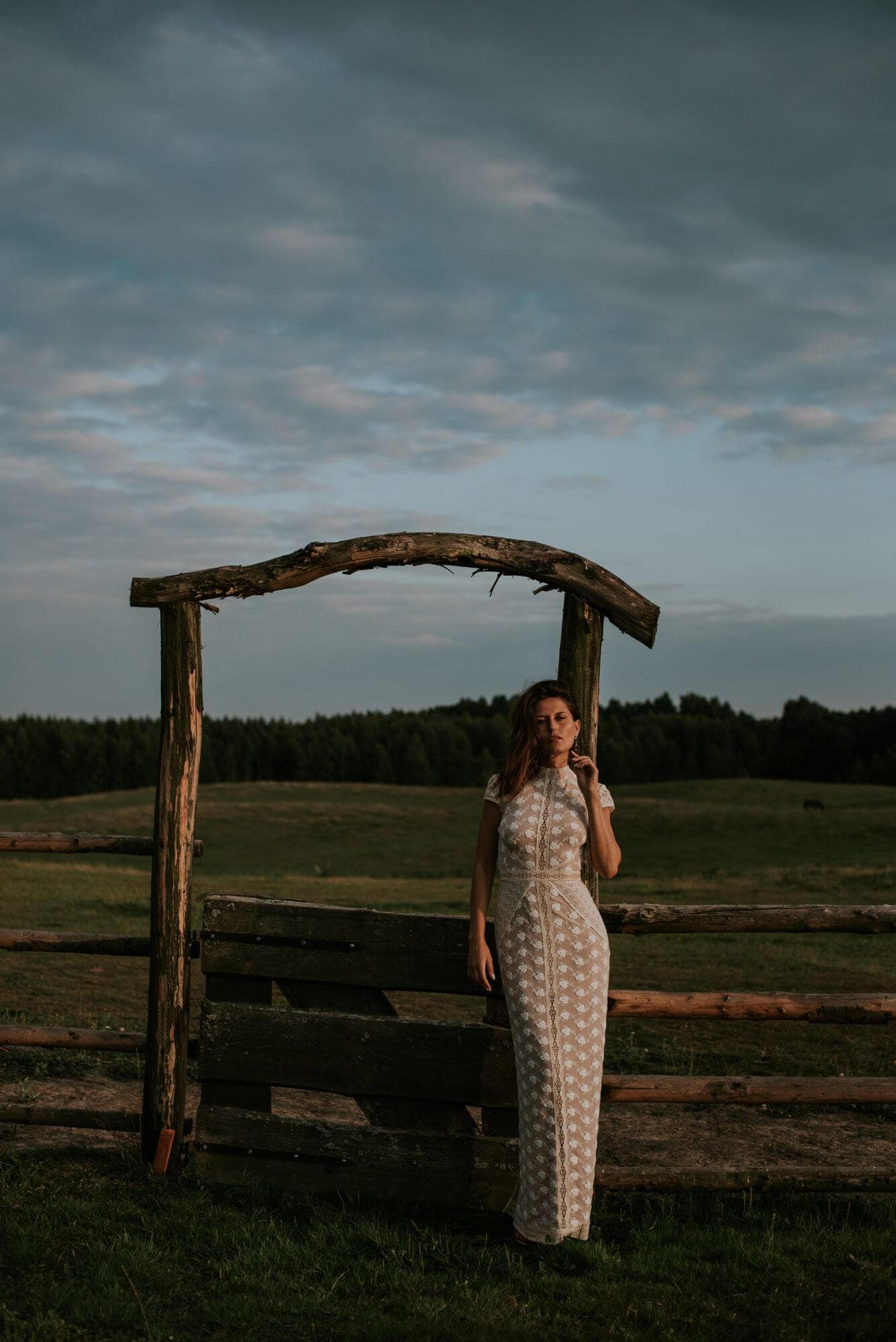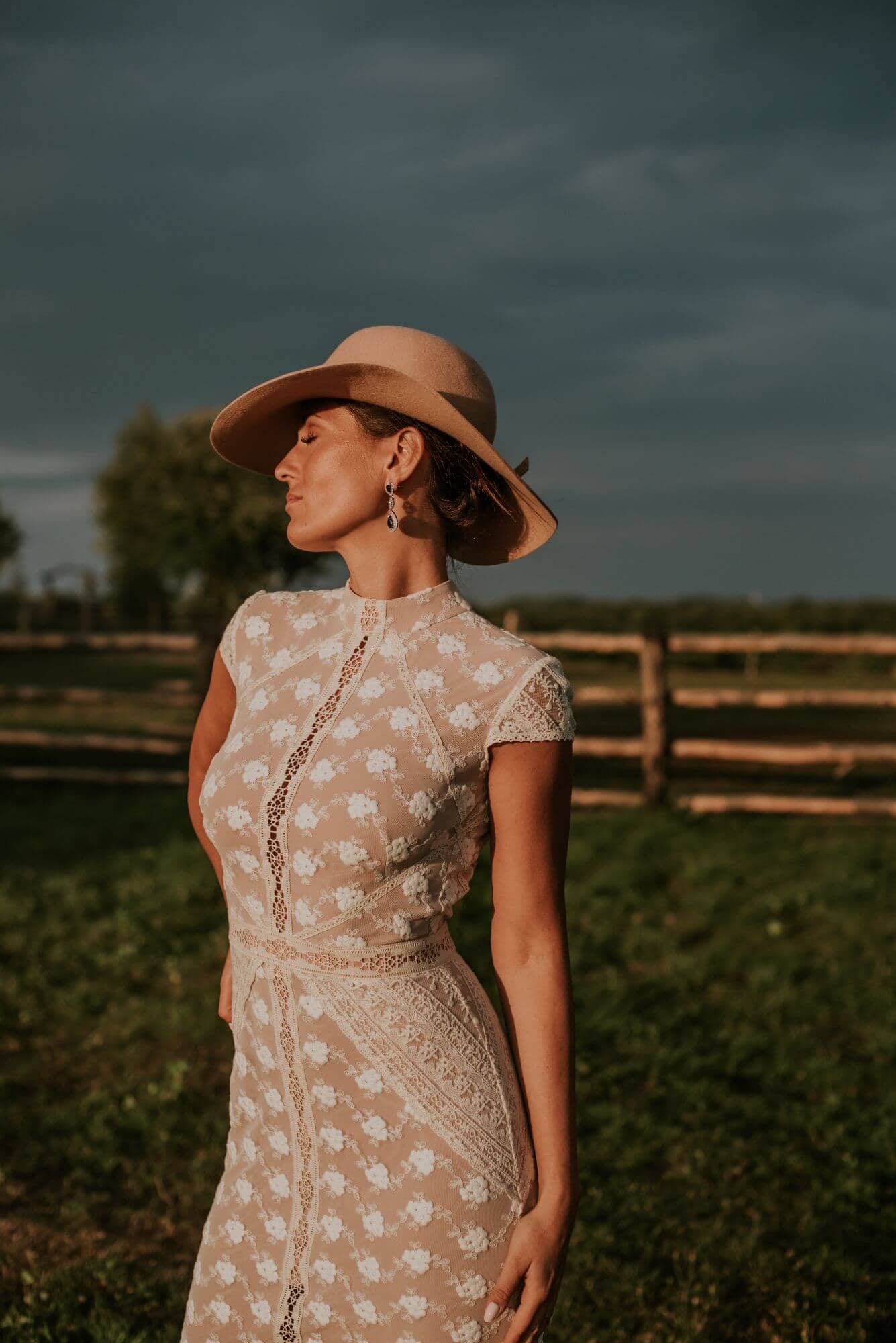 aki obraz widzisz oczami wyobraźni, gdy myślisz o stylowej, eleganckiej kobiecie rodem z poprzedniej epoki? Czy nie wpisuje Ci się w niego idealnie kreacja ślubna z kolekcji Barcelona? Ta suknia ślubna ze stójką przywołuje na myśl klasę i umiar, który jest charakterystyczny dla tradycyjnych chińskich sukien. Z myślą o zachowaniu balansu została uszyta z miękkiej bawełnianej koronki, w kolorze beżowym, dla której tło stanowi cielista, elastyczna podszewka. Ten model sukni z kolekcji Barcelona to stylowa, dopasowana suknia ślubna, która pięknie podkreśli Twoje kobiece kształty. Posiada ona delikatne rękawki, które zarysowują linię ramion oraz wyrównują proporcje sylwetki. Zastosowanie takiego rozwiązania pozwala optycznie zwęzić talię. Podkreśleniu jej wcięcia sprzyja również diagonalny układ dekoracyjnych taśm oraz zastosowanie pasa w talii. Suknia ślubna ze stójką to klasa sama w sobie. Sama suknia, chociaż jest skromna i w dużej mierze zabudowana, posiada wyjątkowy i przepiękny detal – wycięcie odkrywające plecy i to w niezwykle finezyjny, seksowny i subtelny sposób. Z tyłu spódnicy znajduje się rozporek, który eksponuje nogi oraz sprawia, że suknia pięknie układa się w ruchu. To wycięcie wpływa również korzystnie na komfort poruszania się. Dzięki temu, że suknia została uszyta z bawełnianej, miękkiej koronki to w łatwy sposób można ją zafarbować, więc jeśli tylko zechcesz, możesz zyskać pięknie barwioną kreację w dowolnym kolorze. Zależy nam, by suknia towarzyszyła Ci również w innych ważnych momentach i by zyskała nowe życie bądź mogła zostać wykorzystana na wiele innych okazji nawet w tej pierwotnej formie. Zestaw dopasowaną suknię ślubną ze swoimi ulubionym szpilkami i ruszaj na przyjęcie – klasyczne rozwiązania doskonale sprawdzają się na wiele okazji i nigdy nie przestają zachwycać.
