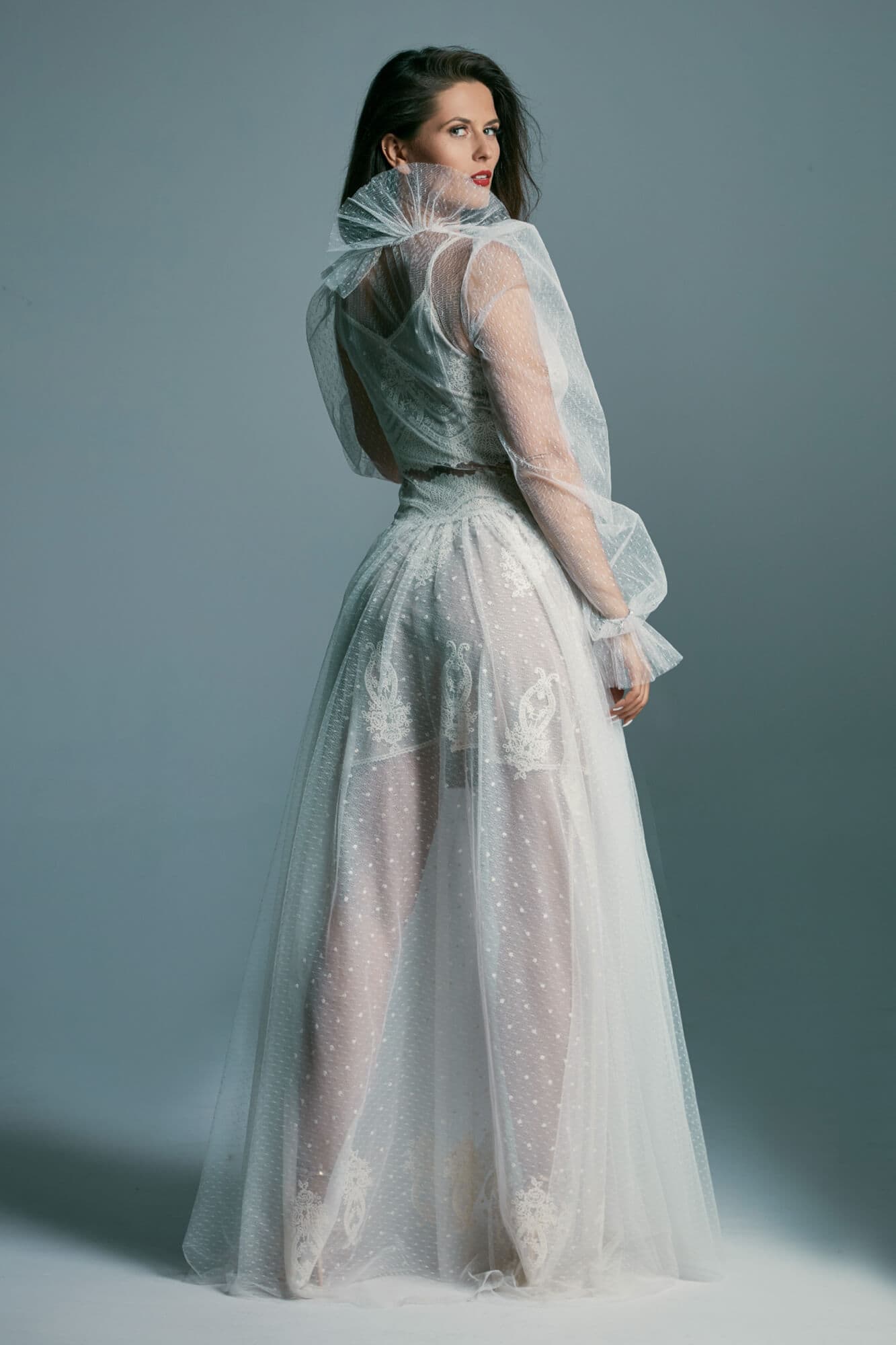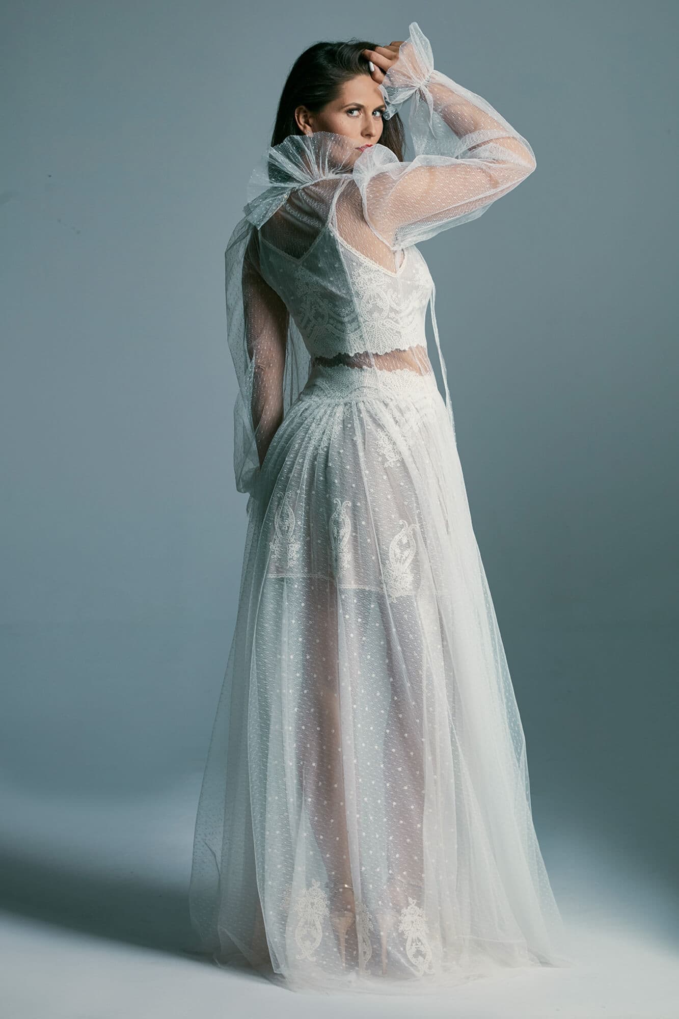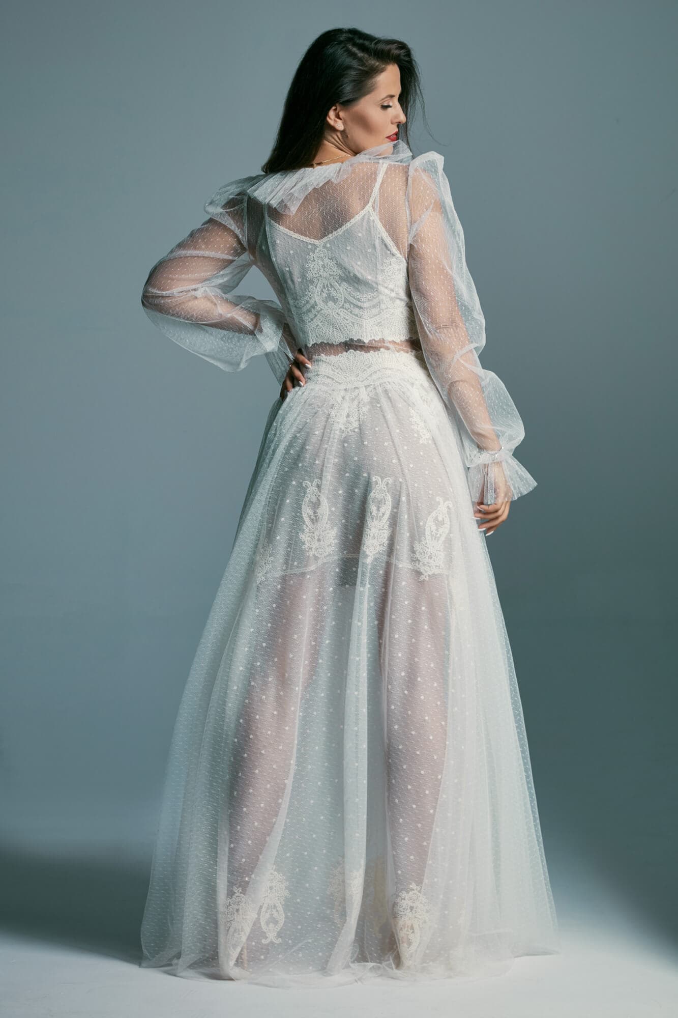 Jeśli cenisz sobie oryginalny styl i szukasz kreacji, którą będziesz mogła założyć nie tylko w dniu ślubu – to ten projekt jest właśnie dla Ciebie! Suknia ślubna retro to dwuczęściowy komplet w postaci topu i spódnicy w ciepłym beżowym odcieniu przykryty delikatną warstwą tiulu w kropeczki. Top na cieniutkich ramiączkach pięknie podkreśla linię biustu i eksponuje talię. Komplet w połączeniu ze spódnicą, która posiada krótką podszewkę w kolorze ciepłego beżu, zjawiskowo akcentuje i wydłuża całą sylwetkę. Dodatkowym i niesamowicie oryginalnym elementem całej stylizacji jest tiul posiadający bufiaste rękawy nawiązujące do minionych epok, który delikatnie przysłania dwuczęściową suknię nadając jej lekkości i subtelnej finezji w niebanalnym guście. Gęsto umarszczony kołnierz z możliwością zawiązania nadaje sukni ślubnej retro nieco teatralnego i wytwornego charakteru. To nieszablonowe połączenie warstw, oprócz zachwycającego wizerunku, zapewnia pełen komfort i wygodę. Nietuzinkowa kreacja podkreśli wyjątkowy i odważny styl każdej Panny Młodej i świetnie sprawdzi się nie tylko podczas uroczystości ślubnych, ale i podczas wielu innych okazji. Ten wyjątkowy zestaw można wykorzystać na różne sposoby: zarówno jako całość przy eleganckich, wystawnych, wieczorowych imprezach lub pojedynczo w codziennych stylizacjach.