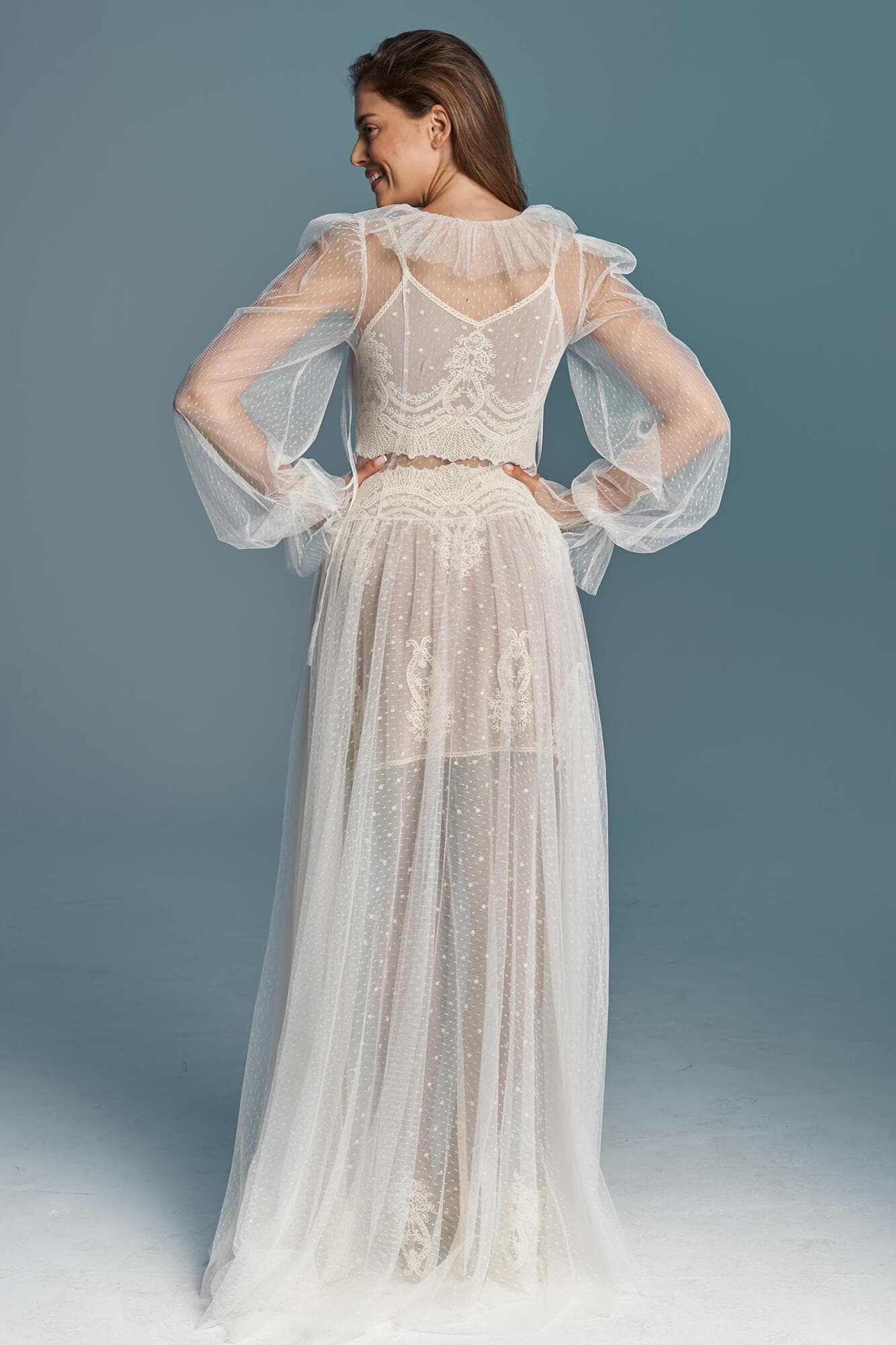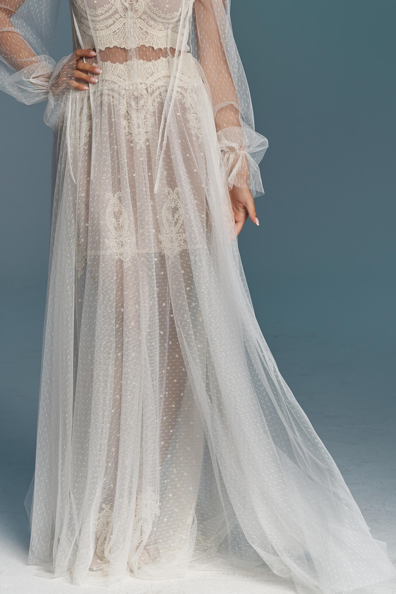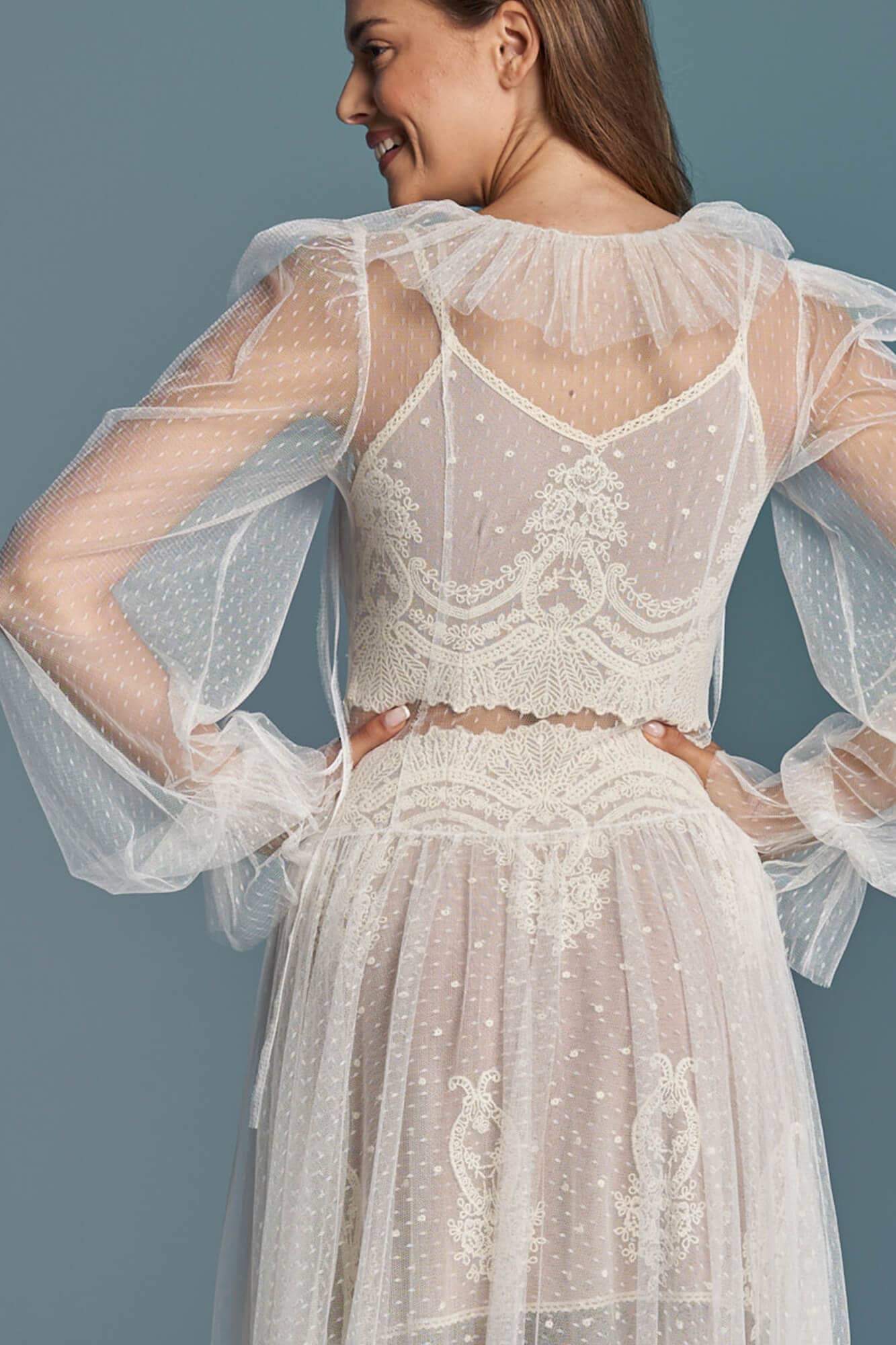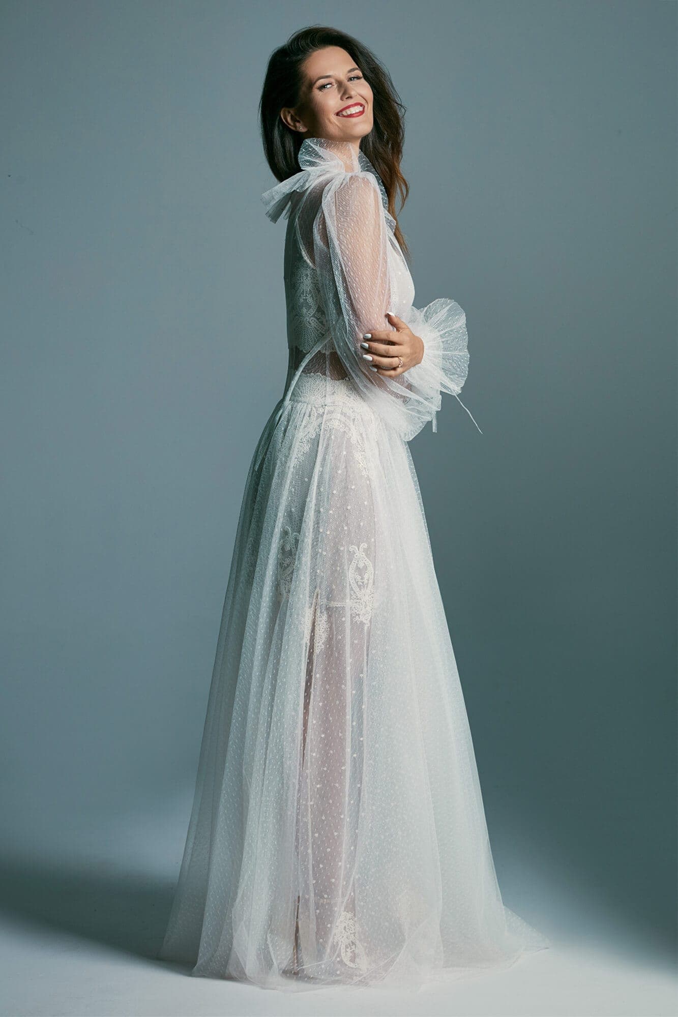 Jeśli cenisz sobie oryginalny styl i szukasz kreacji, którą będziesz mogła założyć nie tylko w dniu ślubu – to ten projekt jest właśnie dla Ciebie! Suknia ślubna retro to dwuczęściowy komplet w postaci topu i spódnicy w ciepłym beżowym odcieniu przykryty delikatną warstwą tiulu w kropeczki. Top na cieniutkich ramiączkach pięknie podkreśla linię biustu i eksponuje talię. Komplet w połączeniu ze spódnicą, która posiada krótką podszewkę w kolorze ciepłego beżu, zjawiskowo akcentuje i wydłuża całą sylwetkę. Dodatkowym i niesamowicie oryginalnym elementem całej stylizacji jest tiul posiadający bufiaste rękawy nawiązujące do minionych epok, który delikatnie przysłania dwuczęściową suknię nadając jej lekkości i subtelnej finezji w niebanalnym guście. Gęsto umarszczony kołnierz z możliwością zawiązania nadaje sukni ślubnej retro nieco teatralnego i wytwornego charakteru. To nieszablonowe połączenie warstw, oprócz zachwycającego wizerunku, zapewnia pełen komfort i wygodę. Nietuzinkowa kreacja podkreśli wyjątkowy i odważny styl każdej Panny Młodej i świetnie sprawdzi się nie tylko podczas uroczystości ślubnych, ale i podczas wielu innych okazji. Ten wyjątkowy zestaw można wykorzystać na różne sposoby: zarówno jako całość przy eleganckich, wystawnych, wieczorowych imprezach lub pojedynczo w codziennych stylizacjach.