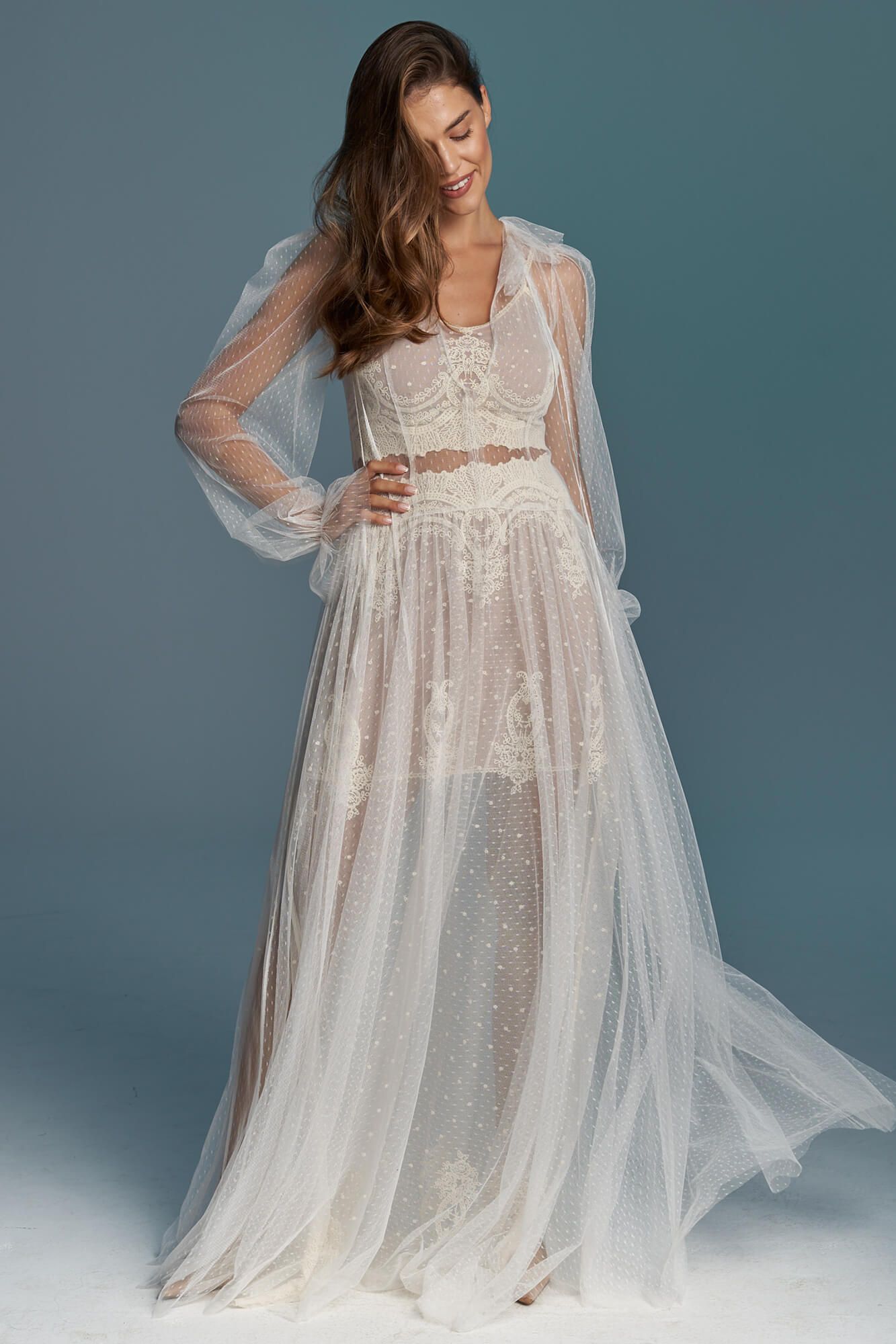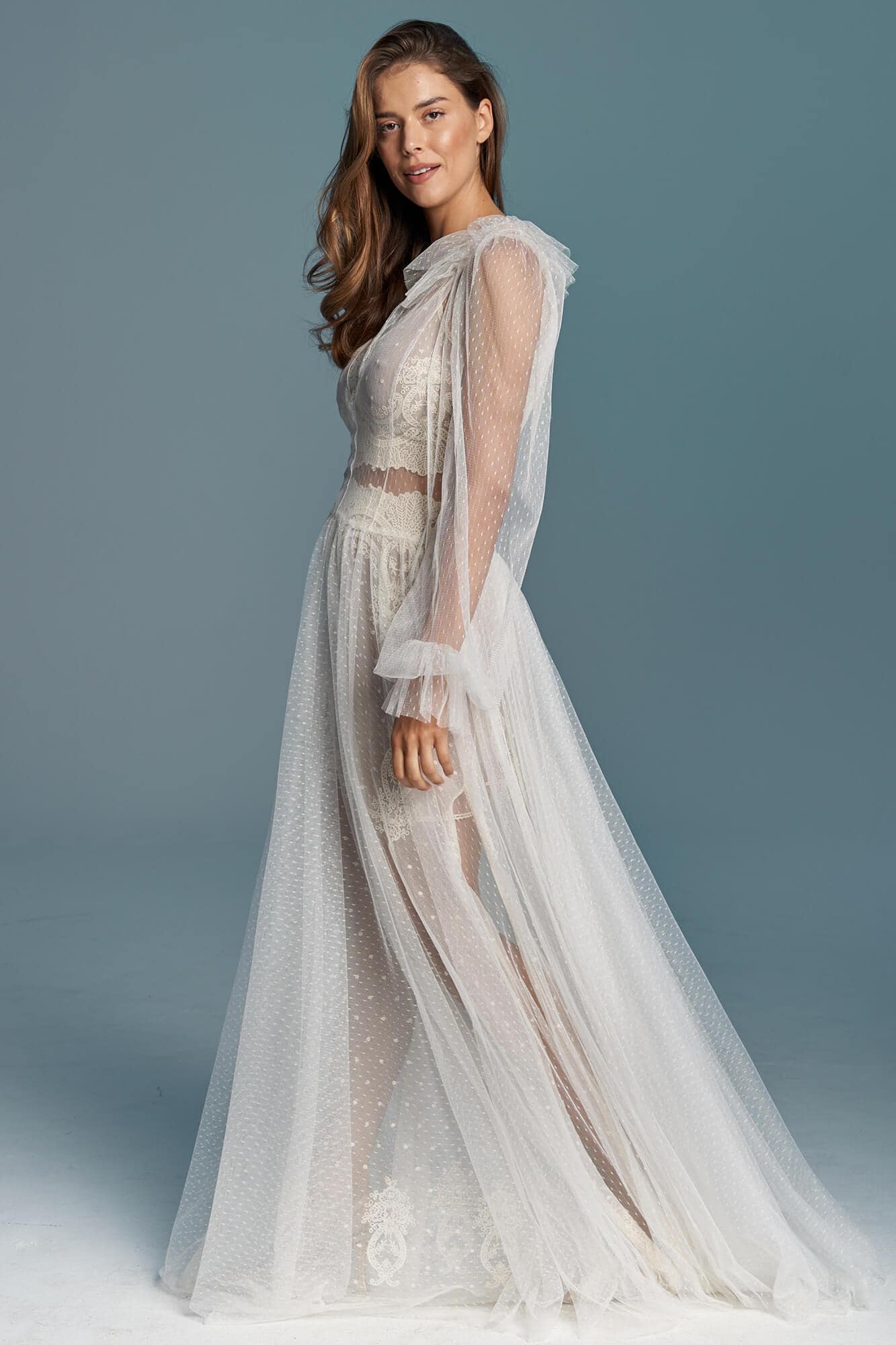 Dwuwarstwowa suknia ślubna to połączenie koronkowego kompletu Barcelona 7 z tiulową warstwą wierzchnią Barcelona 1. Tak jak w obu tych modelach osobno, tak w wariancie łączonym możesz zmieniać wszystko! Od kształtu i długości rękawów, poprzez kształt dekoltów, po długość i objętość spódnic. Możesz także zmienić kolor podszewki z cielistej na piaskową lub białą i długość z krótkiej na długą.