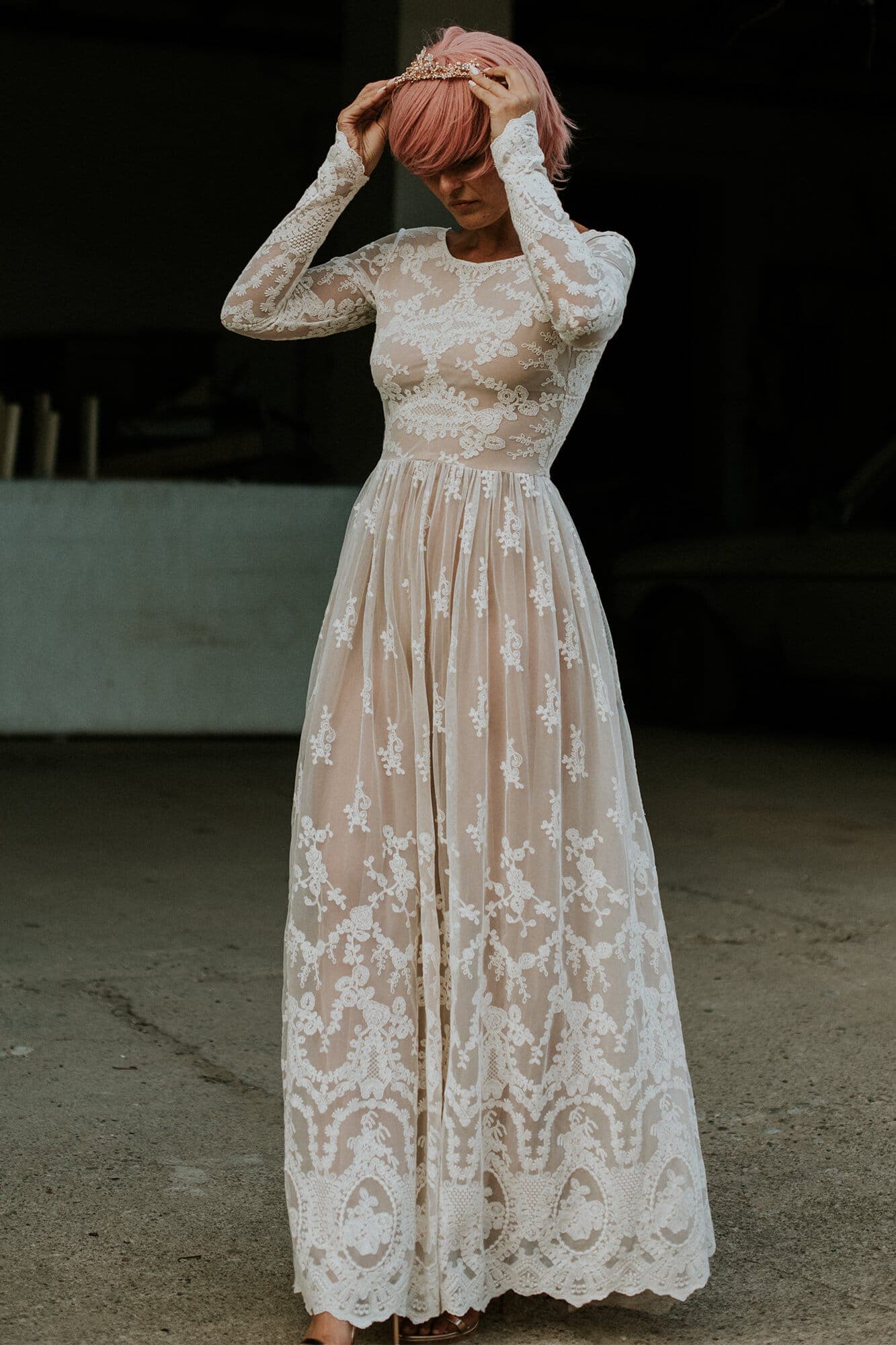 Najładniejsze suknie ślubne powstają z najbliższych sercu inspiracji. Wyważona suknia ślubna z długim rękawem w całości pokryta bawełnianą koronką w odcieniu beżu to propozycja dla miłośniczek klasyki i zdobień w stylizacjach. Piękne i bogate wykończenia wykonane z dbałością o najdrobniejsze szczegóły zachwycą nawet najbardziej wymagającą Pannę Młodą.