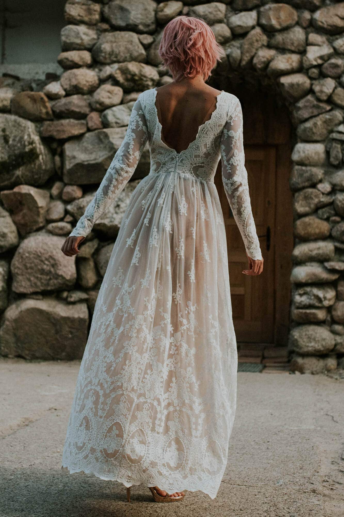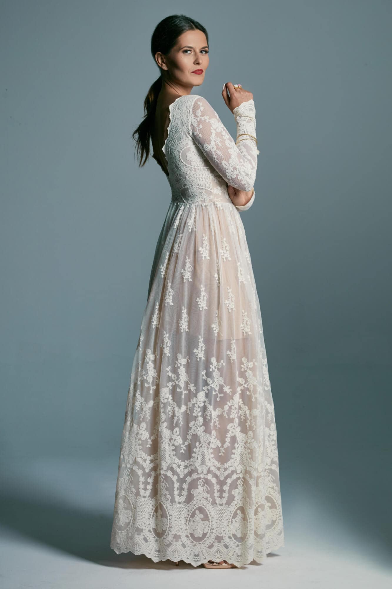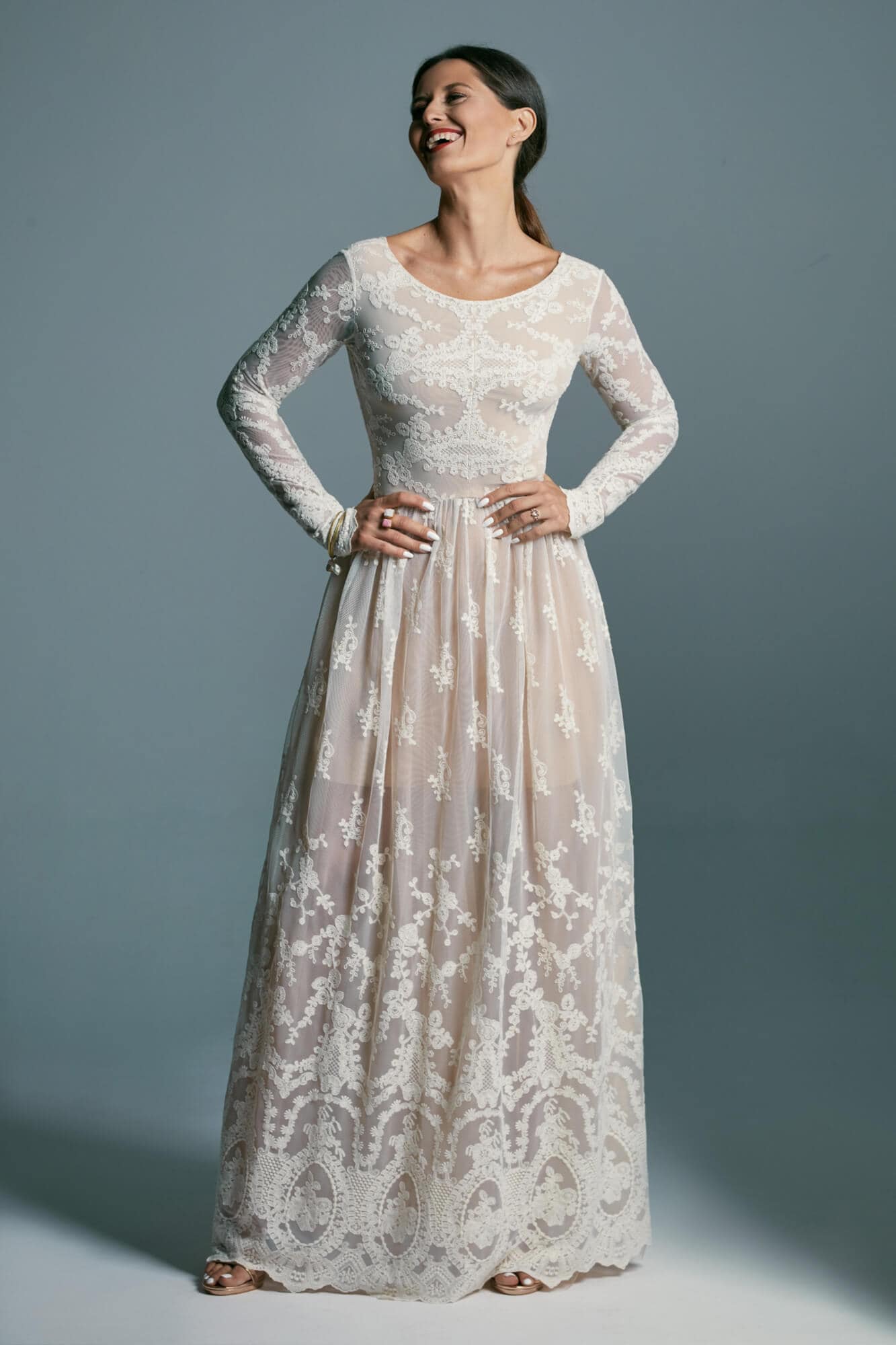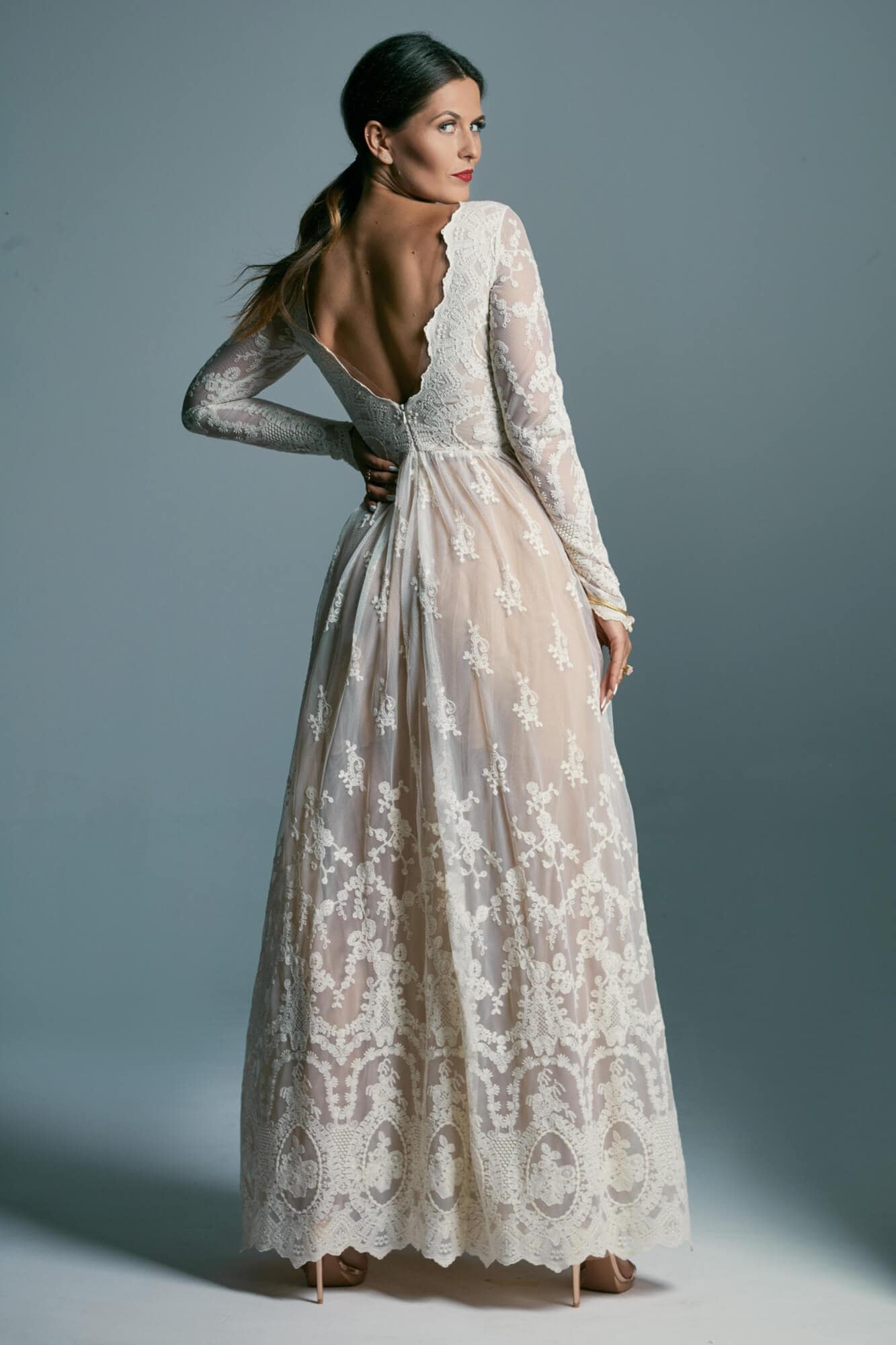 Styl rustykalny ma w sobie pewną tajemnicę i magię. Jest w nim coś, co wzbudza ciekawość i nie pozwala przejść obojętnie obok. Rustykalna suknia ślubna z kolekcji Barcelona przejawia to nieuchwytne „coś” w swojej prostocie. Zupełnie zabudowana z dekoltem w łódkę tworzy skromną i wyważoną stylizację, lecz bardzo głęboki, pięknie wykończony dekolt na plecach nadaje jej seksapilu, a także w nieoczywisty sposób podkreśla i wysmukla talię. Ten akcent to zalotne mrugnięcie okiem i delikatne przełamanie stonowanego looku. Wykonana z wysokiej jakości beżowej bawełnianej koronki kreacja to propozycja dla kobiet, które spośród wielu modeli wybierają te nieoczywiste suknie ślubne – niby skromna, bo zabudowana, a jednak niesamowicie bogata z seksownym dekoltem na plecach. Elastyczna, cielista podszewka zastosowana jako tło na długości całej stylizacji pięknie współgra i komponuje się z neutralnym odcieniem koronek. Wszystko w tej sukni jest spójne i doskonale ze sobą konwersuje. Spódnica w kształcie litery A posiada pod spodem dodatkową warstwę cielistego tiulu, który unosi wzorzystą koronkę i nadaje sukni objętości Wysokiej jakości koronka jest ozdobą samą w sobie, a to bogate wykończenie sprawia, że rustykalna suknia ślubna wygląda niesamowicie wyjątkowo i gustownie. Jeśli już pozostajemy przy detalach, warto wspomnieć o jeszcze jednym ważnym akcencie – o długich rękawach z bogatym i pięknym wykończeniem przy dłoniach, które dodaje całości romantycznego i majestatycznego charakteru. Ta suknia to kwintesencja wdzięku i romantyczności zamknięta w stonowanych barwach skromnej kreacji.