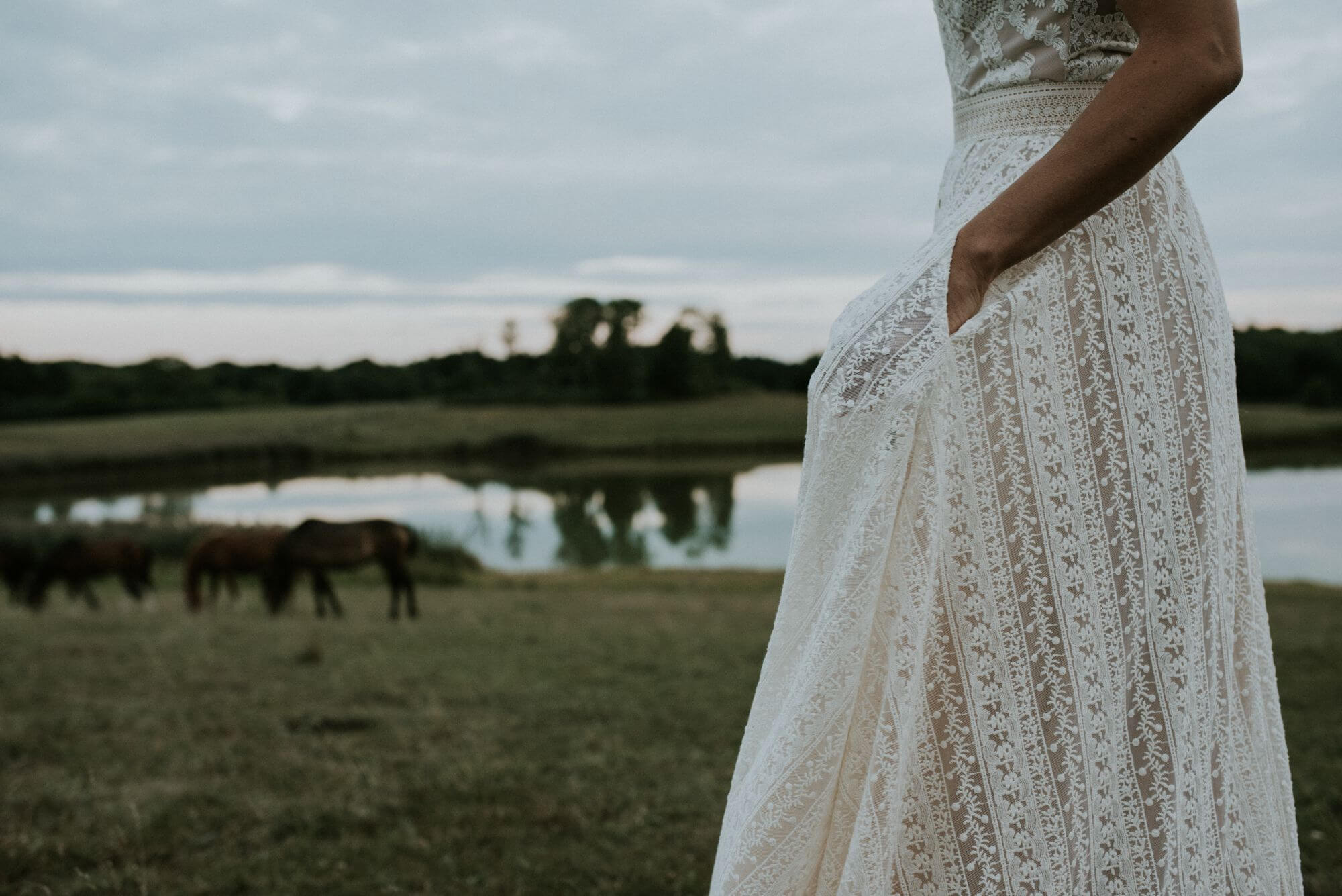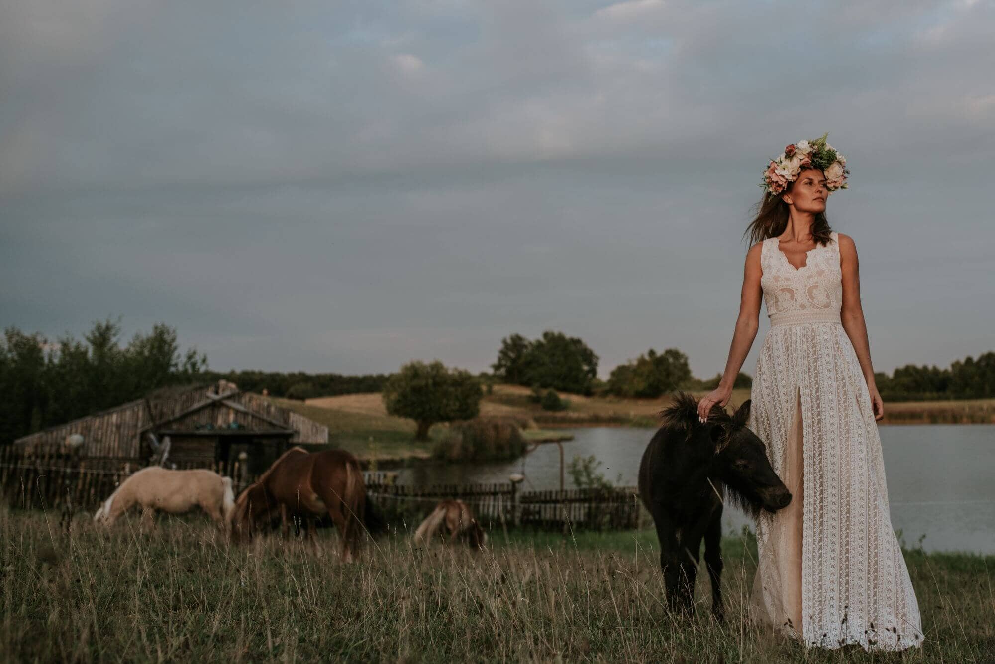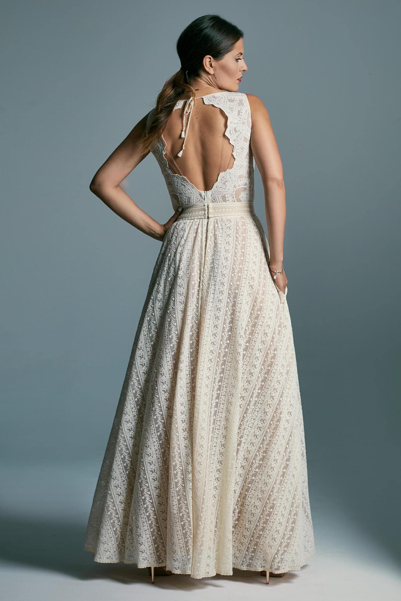 Boho suknia ślubna z bawełnianej, beżowej koronki, z obfitą spódnicą. Idealna propozycja dla dziewczyn, które kochają sielskie klimaty, ale jednocześnie chcą wyglądać elegancko. W oryginale suknia odsłania ramiona, plecy są wycięte, podszewka jest cielista, kontrastowa dla beżowej koronki a spódnica – mimo rozcięcia – nie odsłania nóg. Pamiętaj jednak, że szyjąc ten model dla Ciebie na miarę możemy dodać dowolne rękawy, zmienić objętość spódnicy, dodać rozcięcie w podszewce, po to by pokazać nogi, wymienić kolor podbicia na biały lub piaskowy czy przebudować plecy tak, by dało się założyć biustonosz.