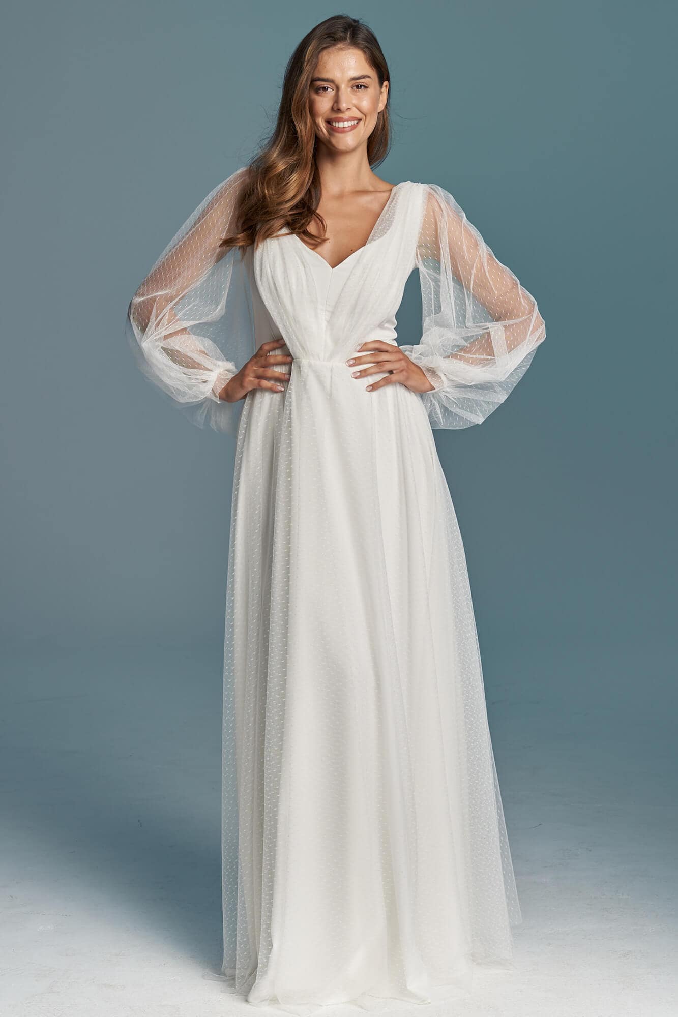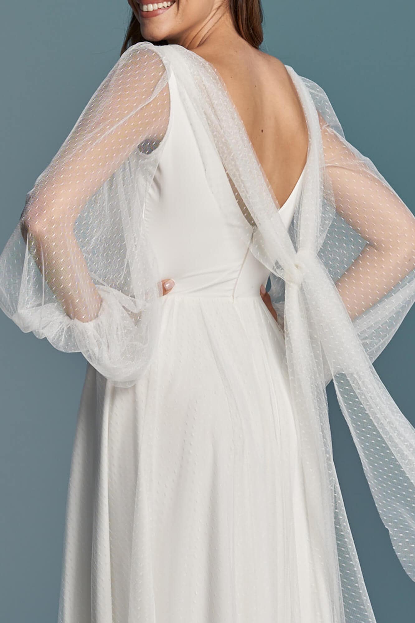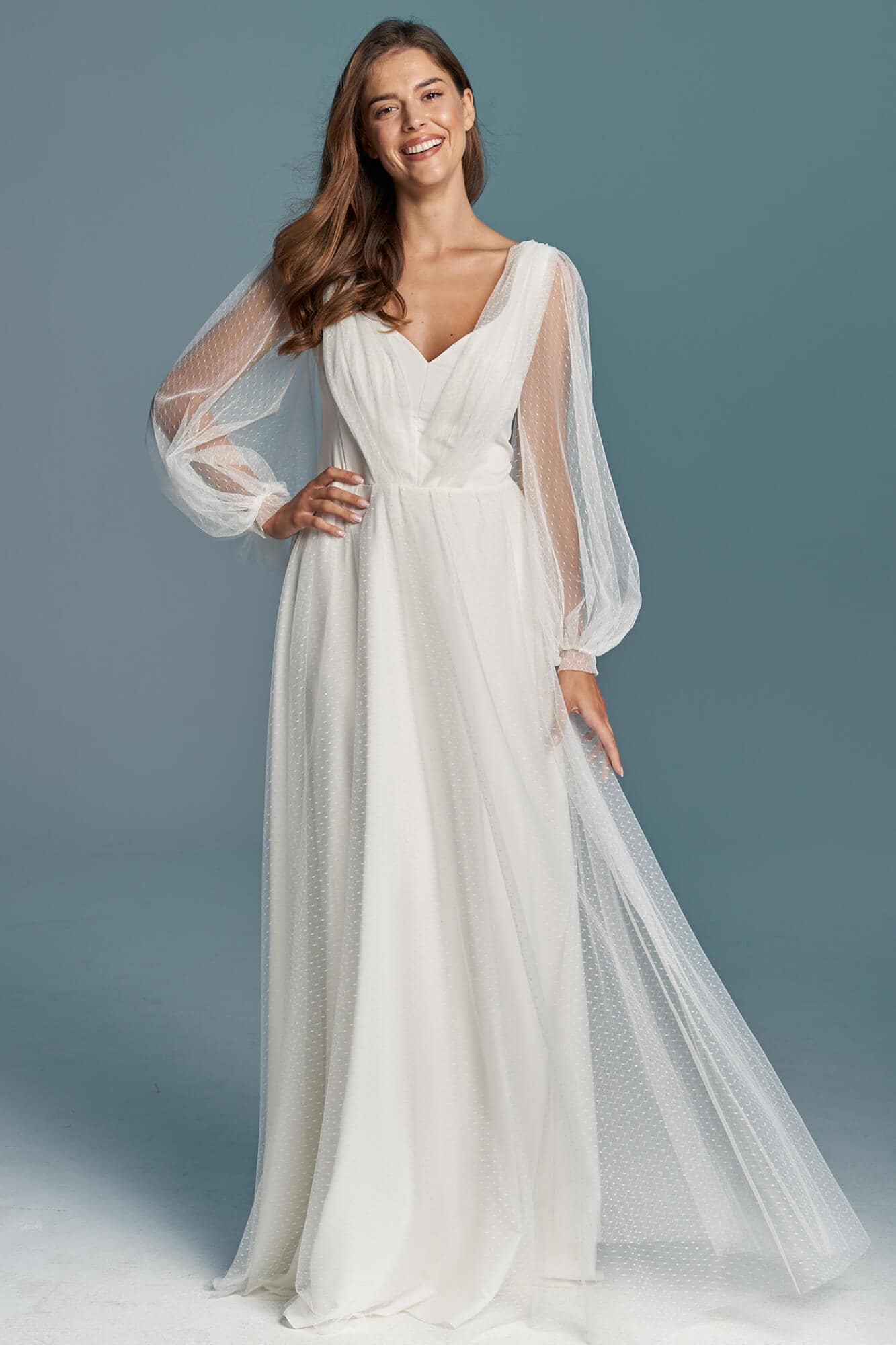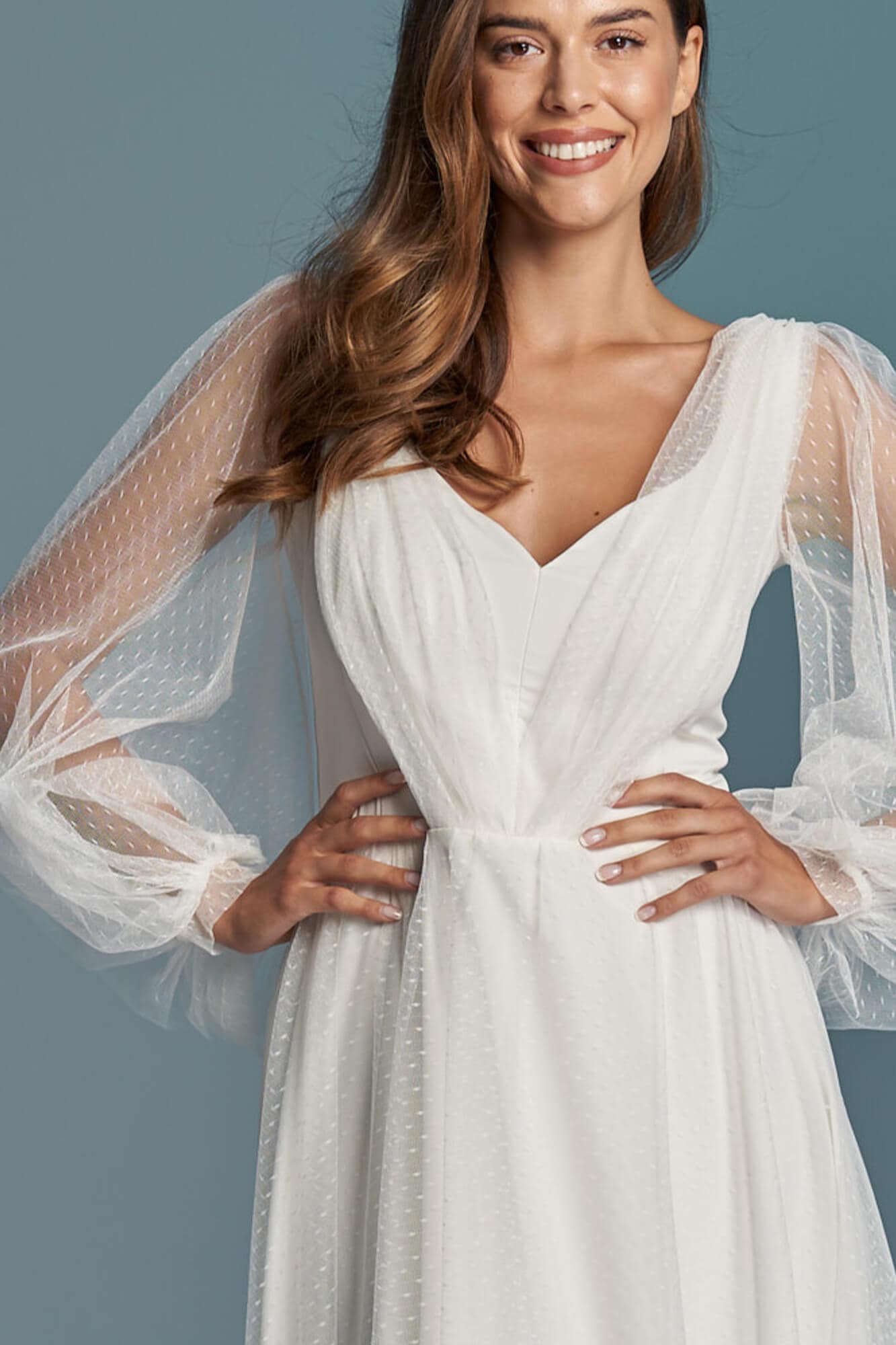 Gładka suknia ślubna z szyfonu pokryta mgiełką z tiulu w kropeczki to wariant dla skromnych Panien Młodych, ceniących sobie prostotę i elegancję. Spódnica ma kształt literki A, dekolt V a rękawy są długie i bufiaste. Szyjąc ten model dla Ciebie na miarę możemy – na Twoje życzenie – zmienić kształt każdego elementu! Spódnica może być znacznie większa lub mniejsza, można w niej też zrobić rozporek na nogę. Rękaw może być węższy, krótszy lub może go nie być wcale. Dekolt może mieć inny kształt i głębokość, a szarfę na plecach można usunąć lub zastąpić frędzlami.