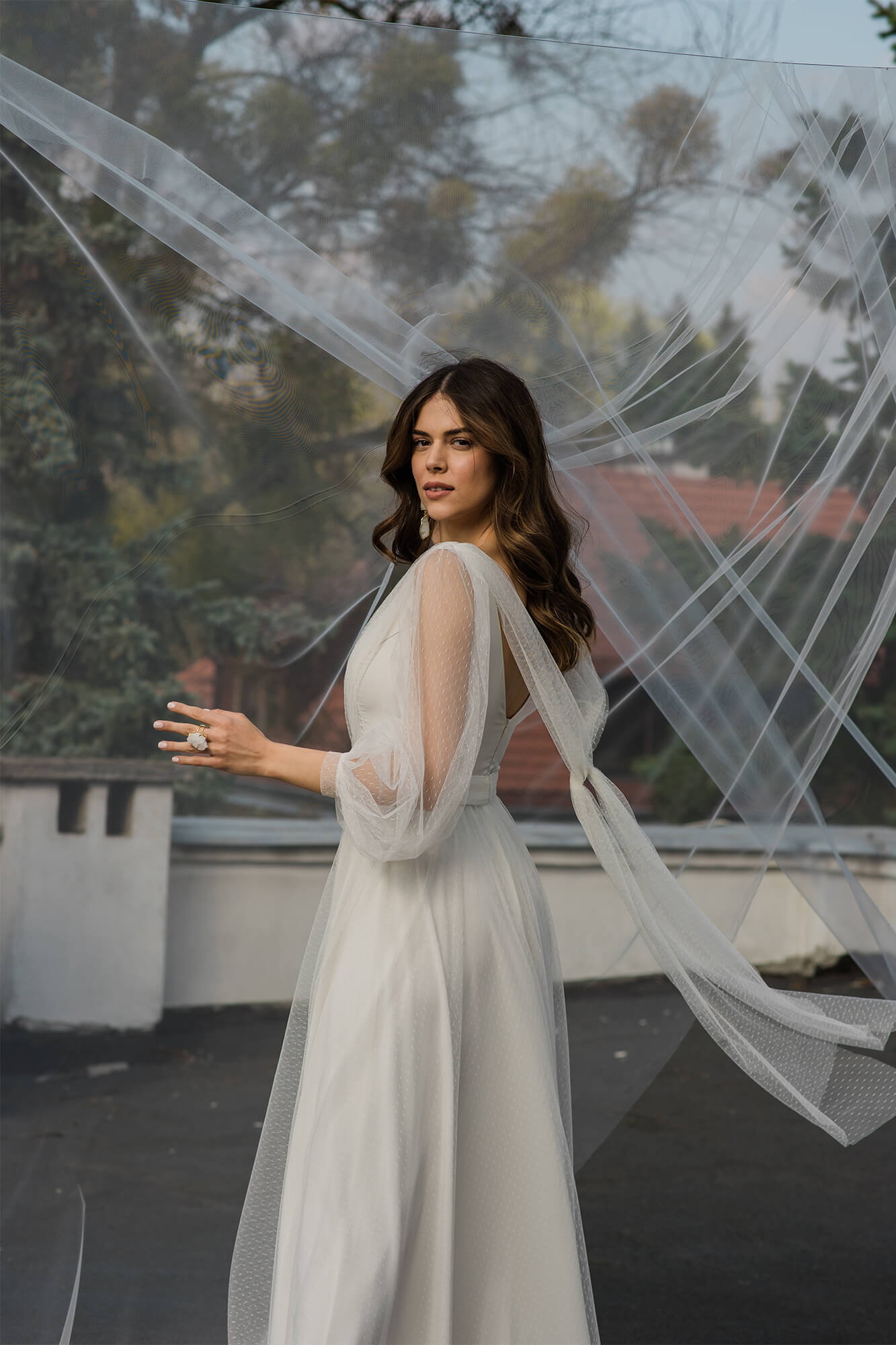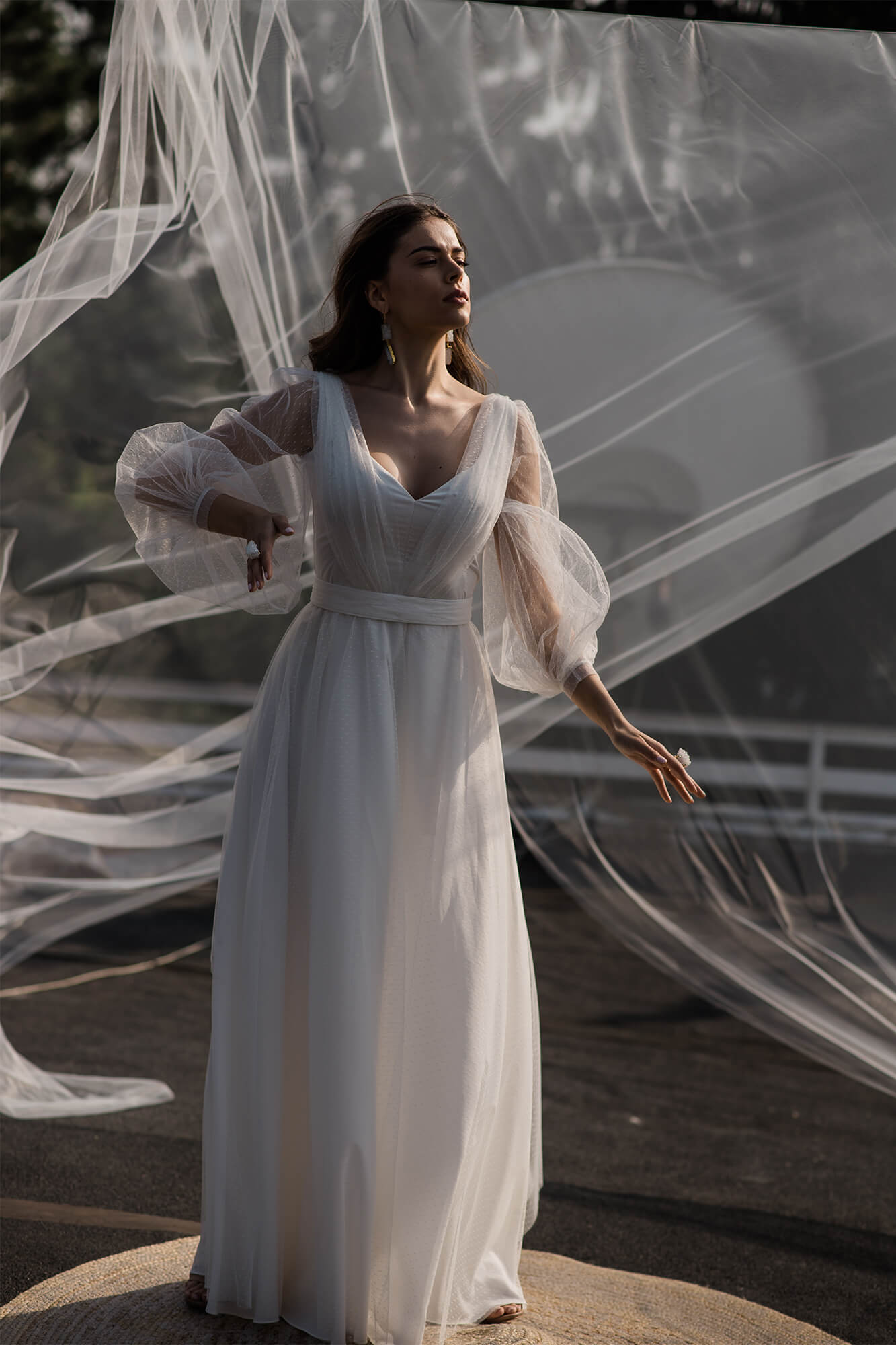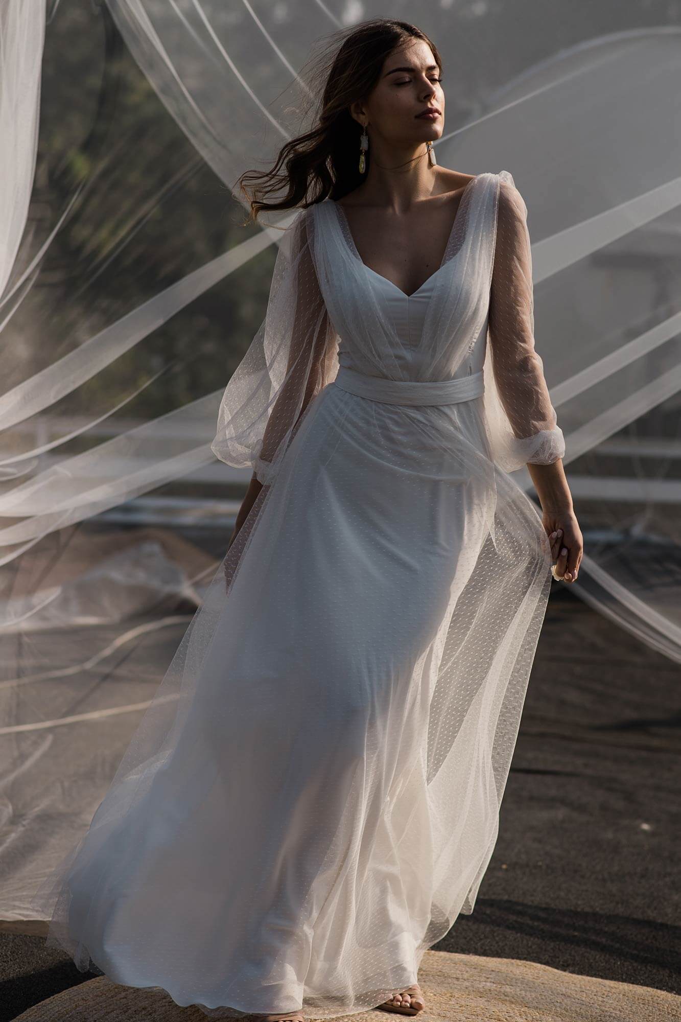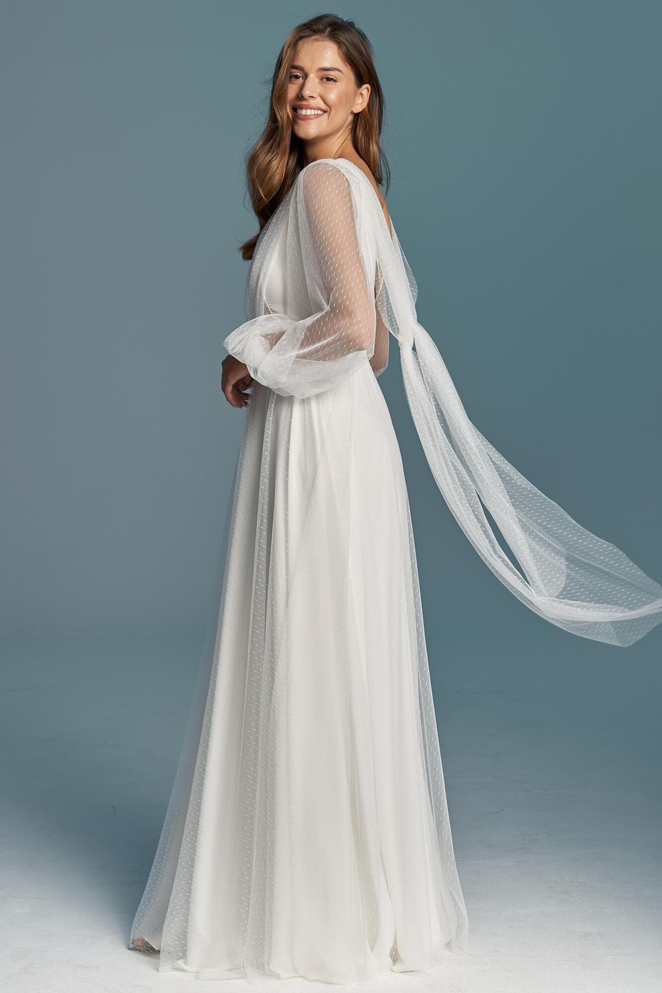 Gładka suknia ślubna z szyfonu pokryta mgiełką z tiulu w kropeczki to wariant dla skromnych Panien Młodych, ceniących sobie prostotę i elegancję. Spódnica ma kształt literki A, dekolt V a rękawy są długie i bufiaste. Szyjąc ten model dla Ciebie na miarę możemy – na Twoje życzenie – zmienić kształt każdego elementu! Spódnica może być znacznie większa lub mniejsza, można w niej też zrobić rozporek na nogę. Rękaw może być węższy, krótszy lub może go nie być wcale. Dekolt może mieć inny kształt i głębokość, a szarfę na plecach można usunąć lub zastąpić frędzlami.