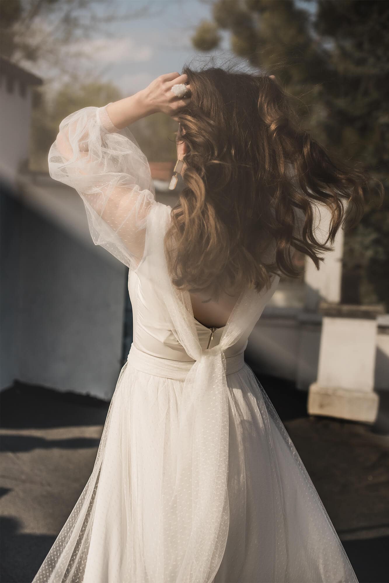 Ta suknia to model wyjściowy - możemy w niej zmienić praktycznie wszystko! Pogłębić lub spłycić dekolt, zmienić jego wykończenie, kształt, dodać lub odjąć falbankę czy frędzle. Rękawy mogą być dłuższe lub krótsze, mieć inny kształt niż te na zdjęciu. Może też nie być ich wcale. Tiul w spódnicy można dodać (lub odjąć) na wierzchu, albo pod spodem. Podszewka może być długa lub krótka w odcieniach bieli i beżu. Rozcięcie na nogę i tren można dodać lub usunąć praktycznie w każdym modelu.