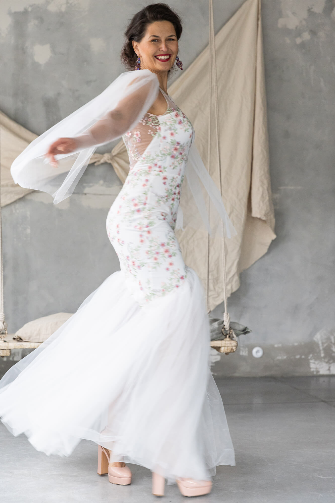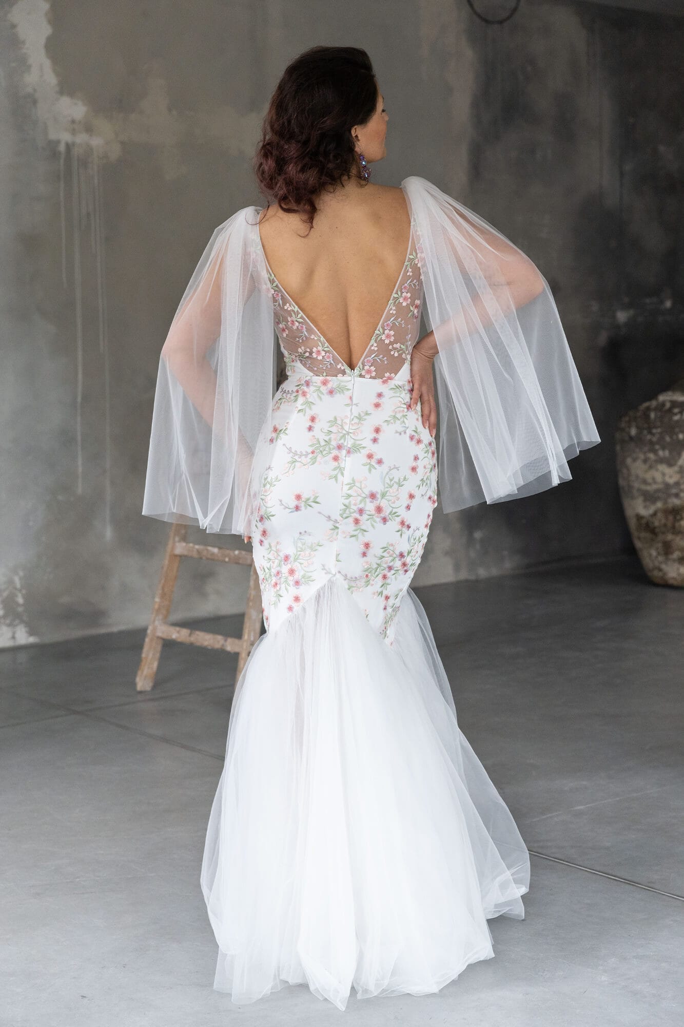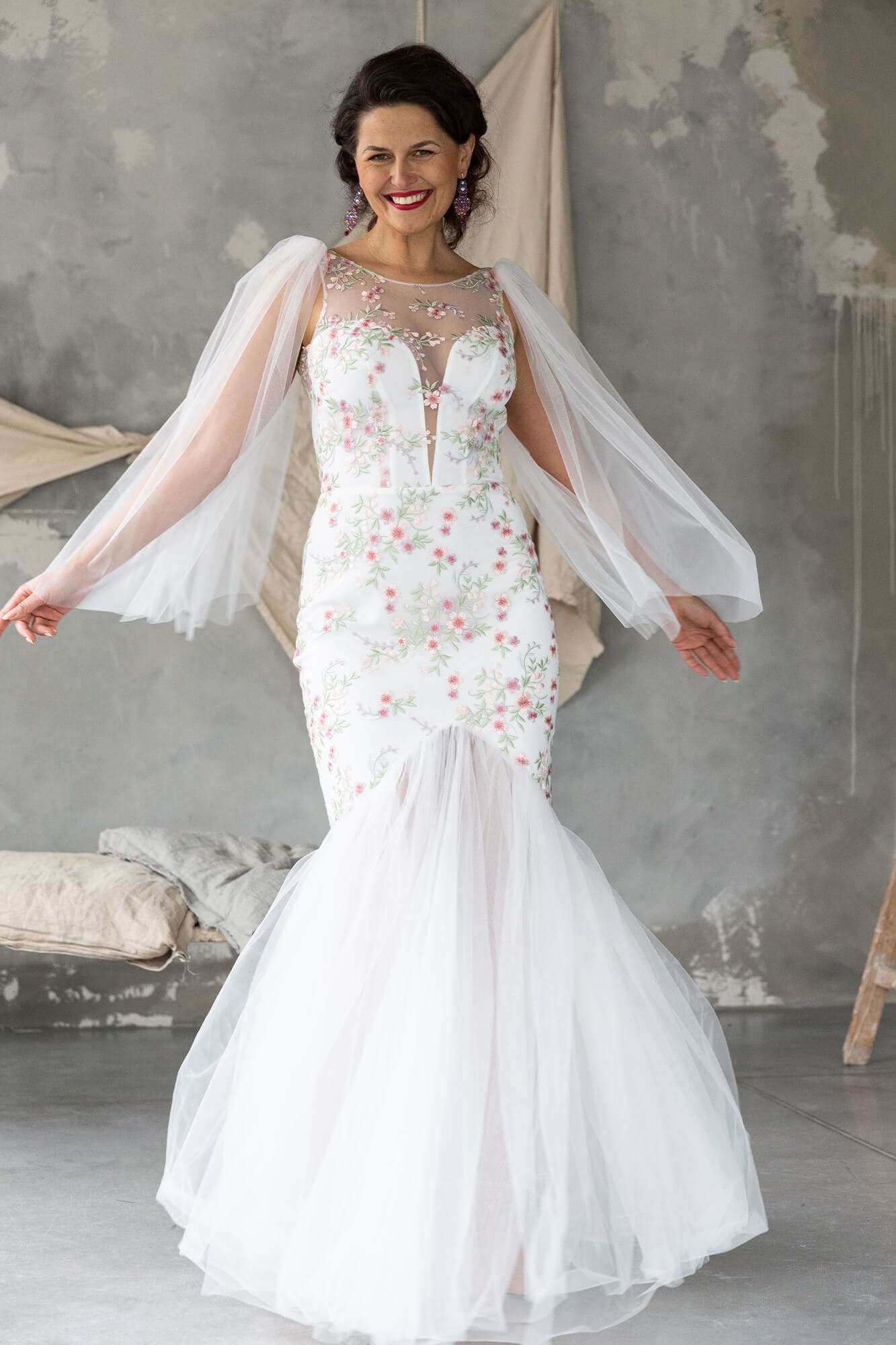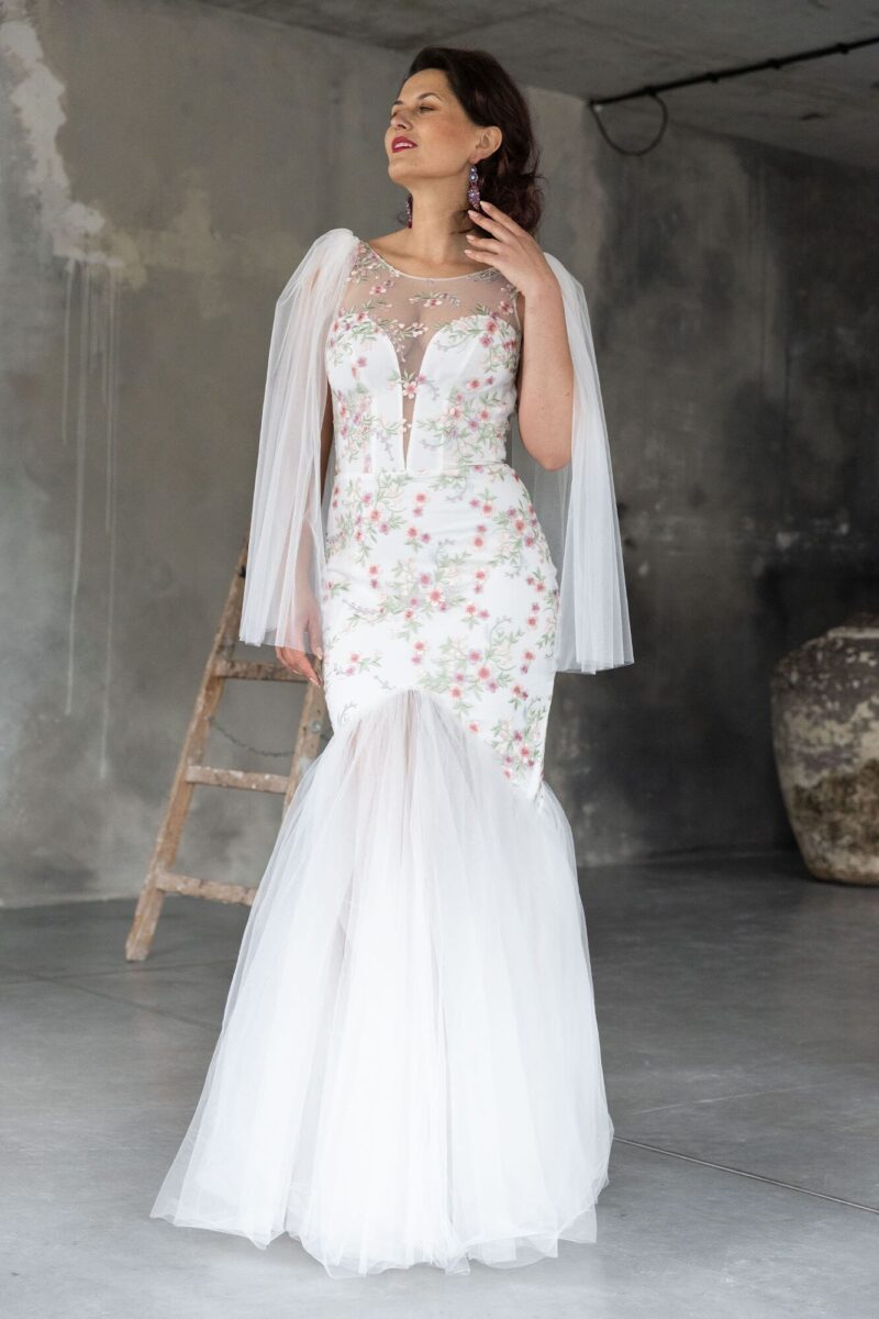 Ta suknia to model wyjściowy - możemy w niej zmienić praktycznie wszystko! Pogłębić lub spłycić dekolt, zmienić jego wykończenie, kształt, dodać lub odjąć falbankę czy frędzle. Rękawy mogą być dłuższe lub krótsze, mieć inny kształt niż te na zdjęciu. Może też nie być ich wcale. Tiul w spódnicy można dodać (lub odjąć) na wierzchu, albo pod spodem. Podszewka może być długa lub krótka w odcieniach bieli i beżu. Rozcięcie na nogę i tren można dodać lub usunąć praktycznie w każdym modelu.