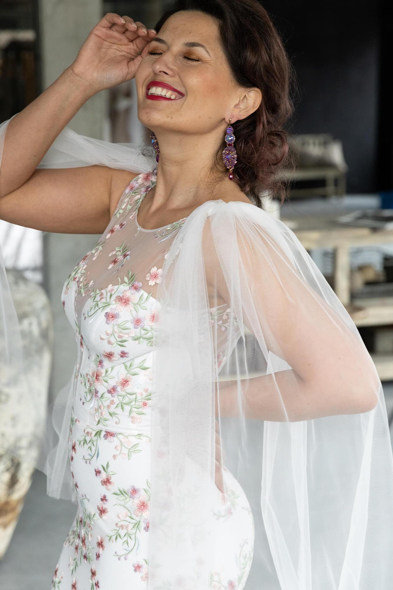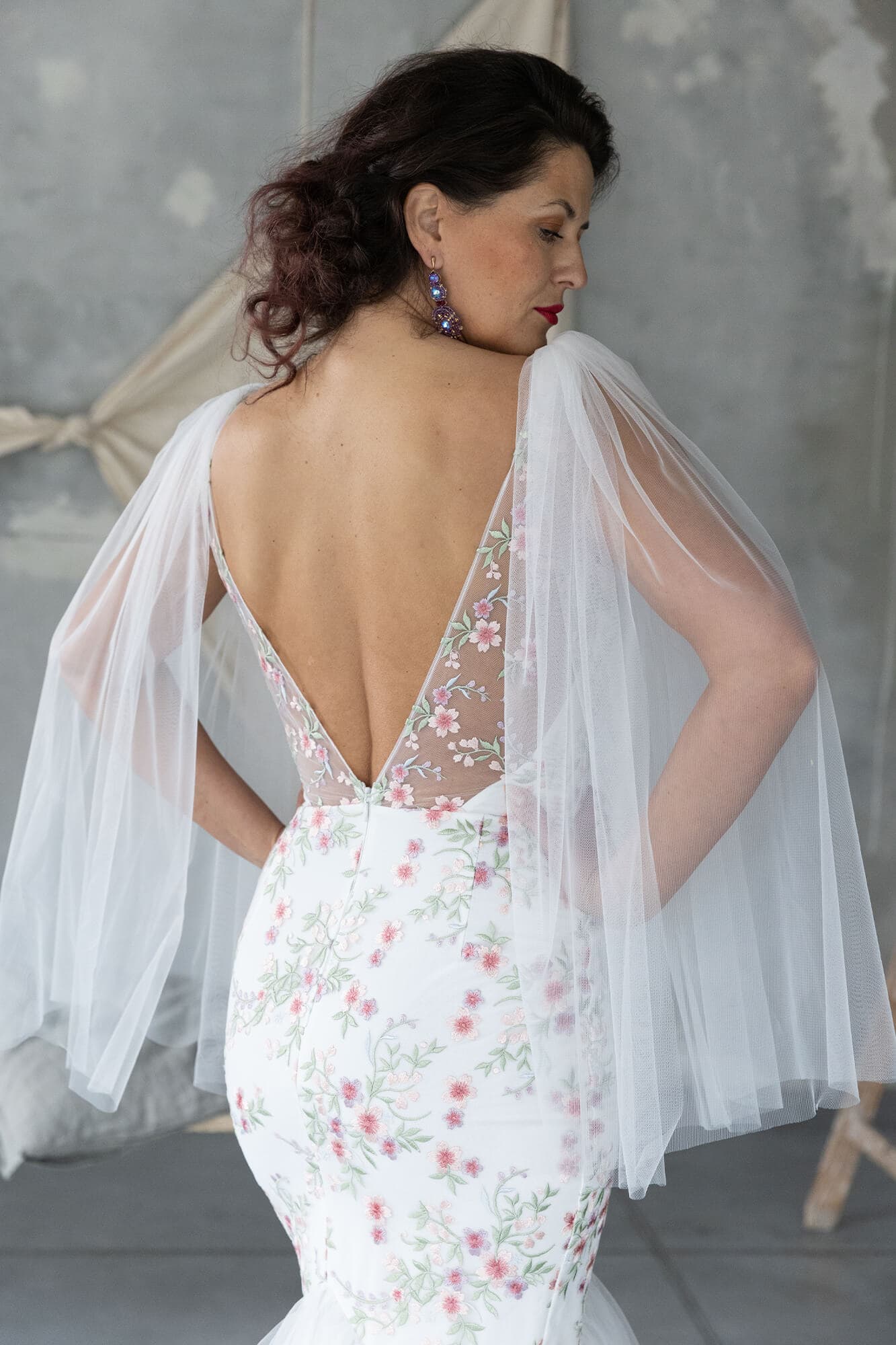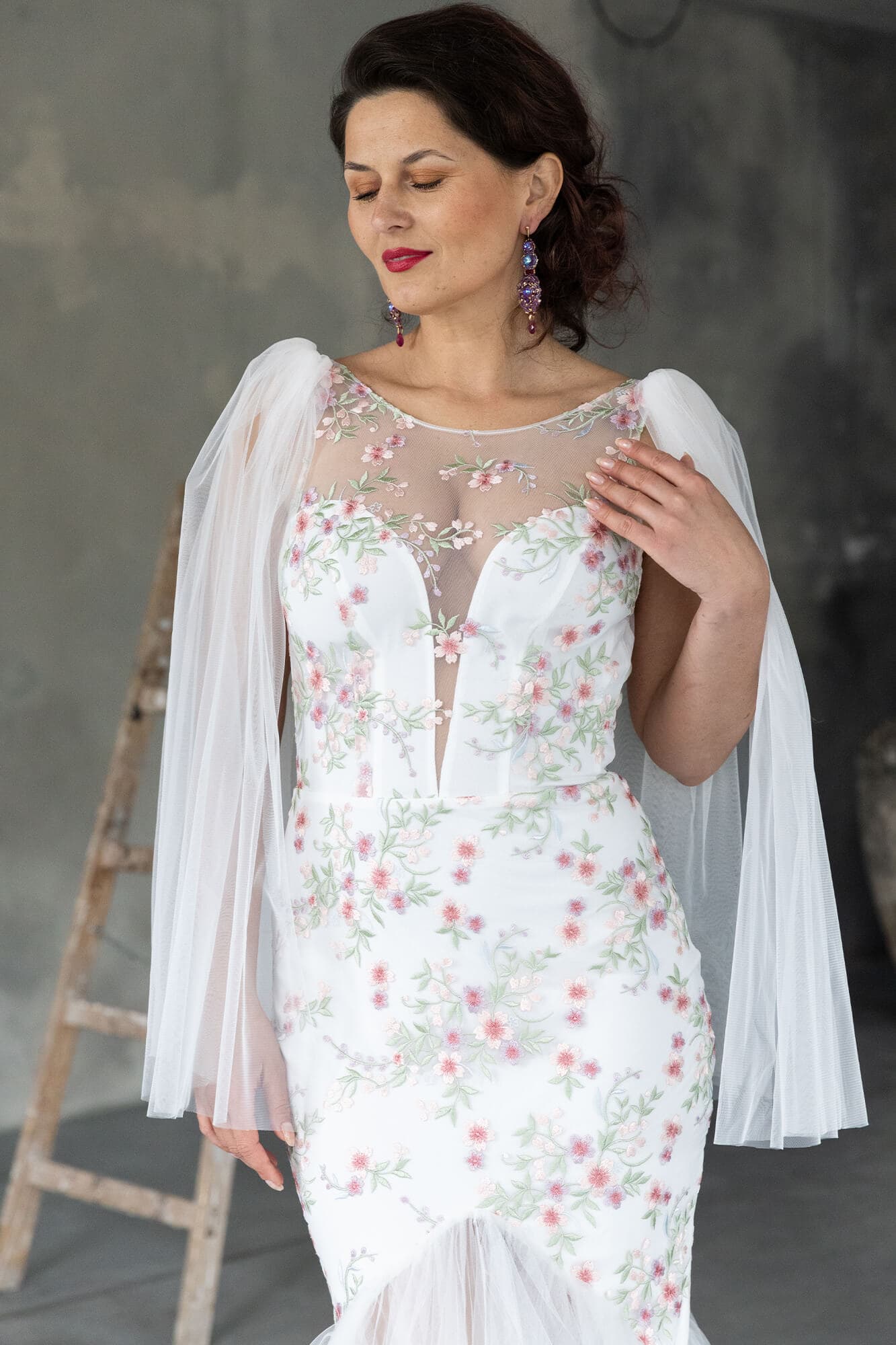 Ta suknia to model wyjściowy - możemy w niej zmienić praktycznie wszystko! Pogłębić lub spłycić dekolt, zmienić jego wykończenie, kształt, dodać lub odjąć falbankę czy frędzle. Rękawy mogą być dłuższe lub krótsze, mieć inny kształt niż te na zdjęciu. Może też nie być ich wcale. Tiul w spódnicy można dodać (lub odjąć) na wierzchu, albo pod spodem. Podszewka może być długa lub krótka w odcieniach bieli i beżu. Rozcięcie na nogę i tren można dodać lub usunąć praktycznie w każdym modelu.