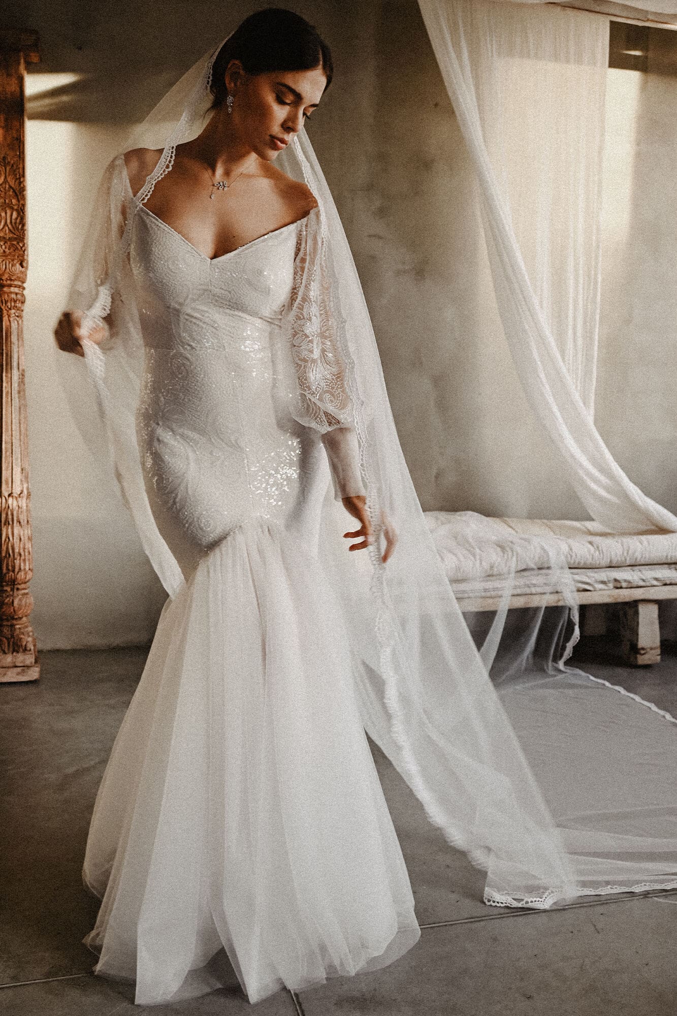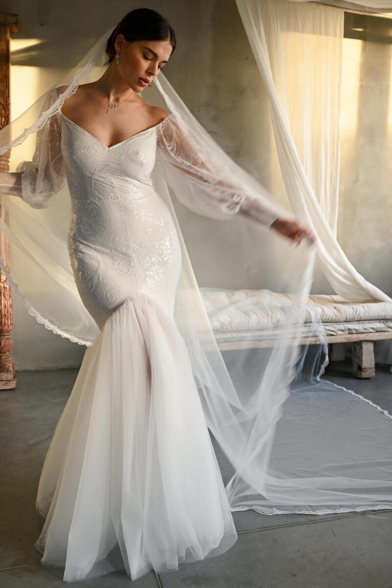 Ta suknia to model wyjściowy - możemy w niej zmienić praktycznie wszystko! Pogłębić lub spłycić dekolt, zmienić jego wykończenie, kształt, dodać lub odjąć falbankę czy frędzle. Rękawy mogą być dłuższe lub krótsze, mieć inny kształt niż te na zdjęciu. Może też nie być ich wcale. Tiul w spódnicy można dodać (lub odjąć) na wierzchu, albo pod spodem. Podszewka może być długa lub krótka w odcieniach bieli i beżu. Rozcięcie na nogę i tren można dodać lub usunąć praktycznie w każdym modelu.