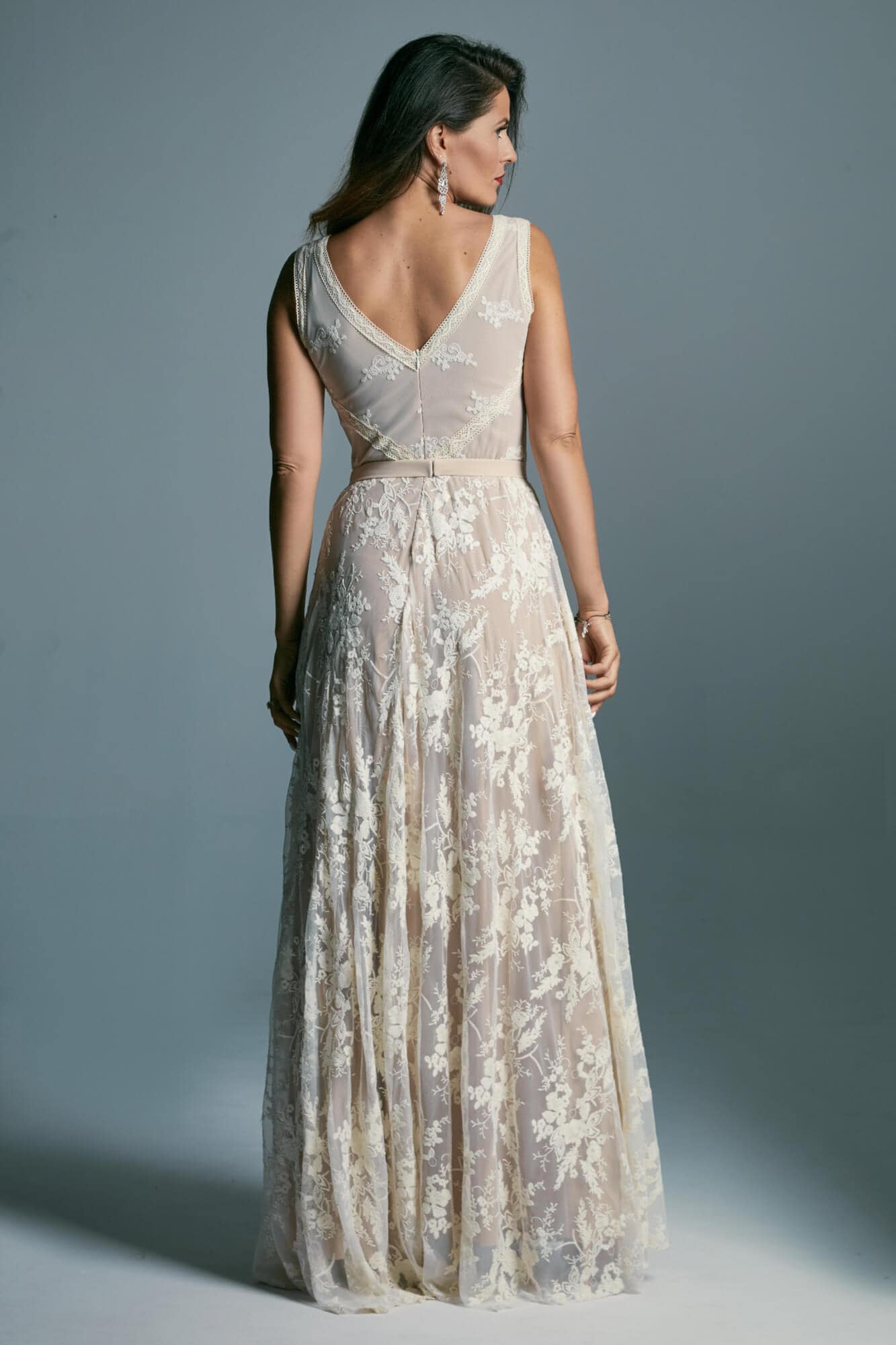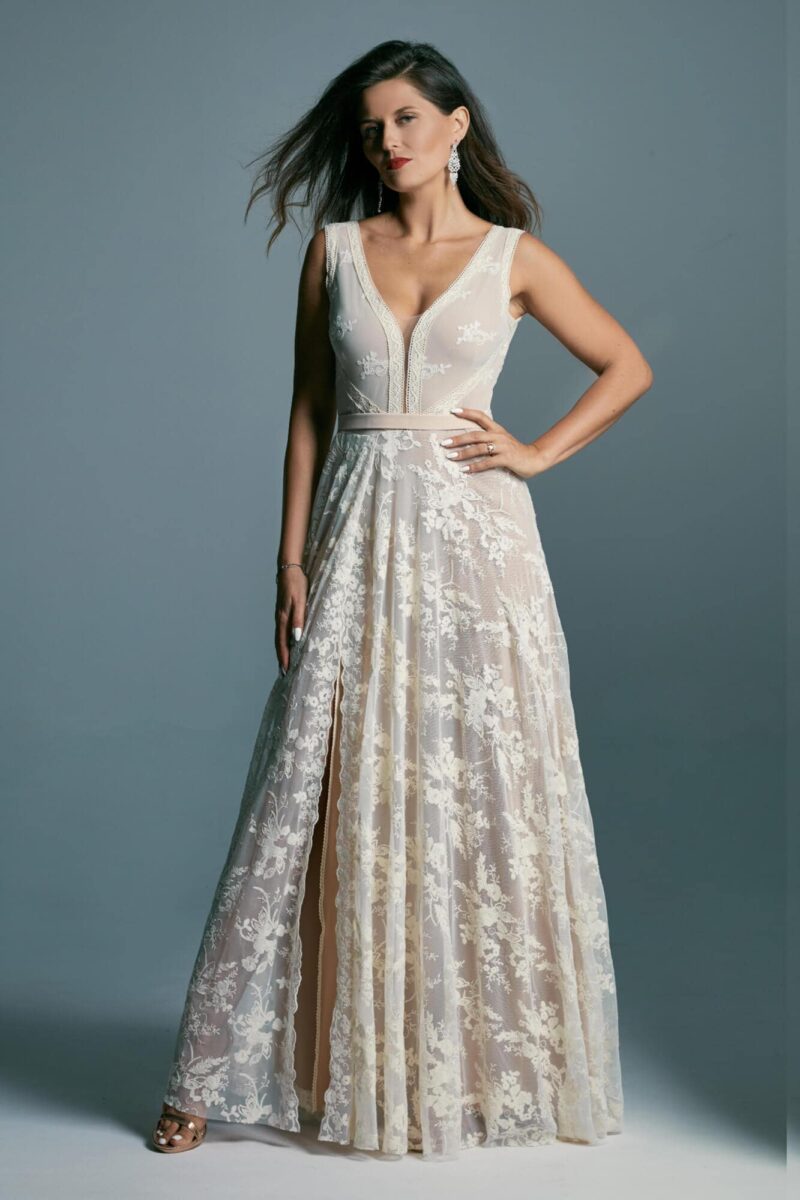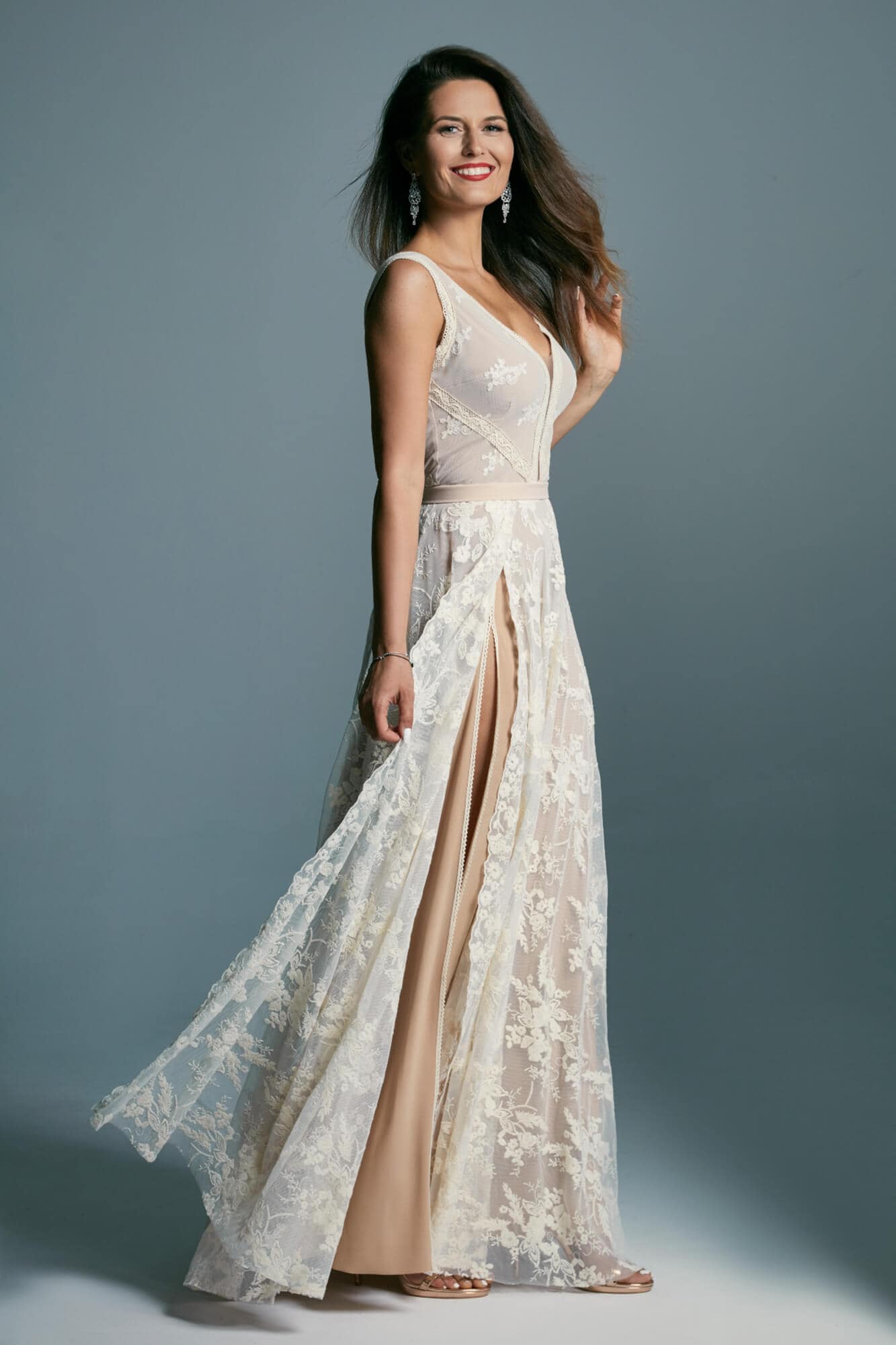 Niezwykle kobieca i romantyczna suknia ślubna w kolorze ciepłego beżu w połączeniu z pięknym, kwiatowym wzorem koronki to model zjawiskowo eksponujący atuty kobiecego ciała. Głęboki dekolt, dopasowana talia oraz rozcięcie ukazujące nogi wspaniale wysmuklają sylwetkę, tworząc zapierającą dech w piersiach całość.