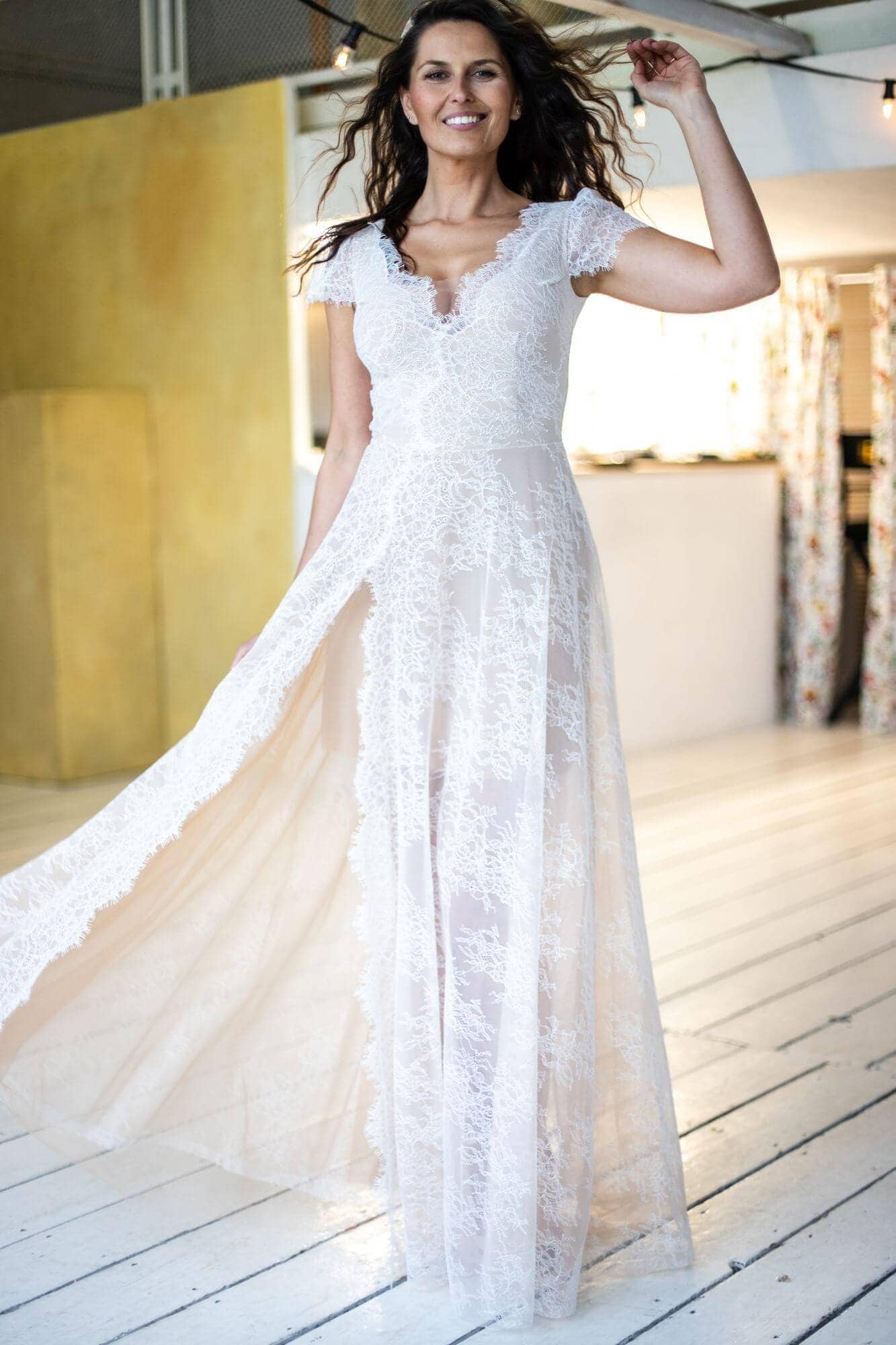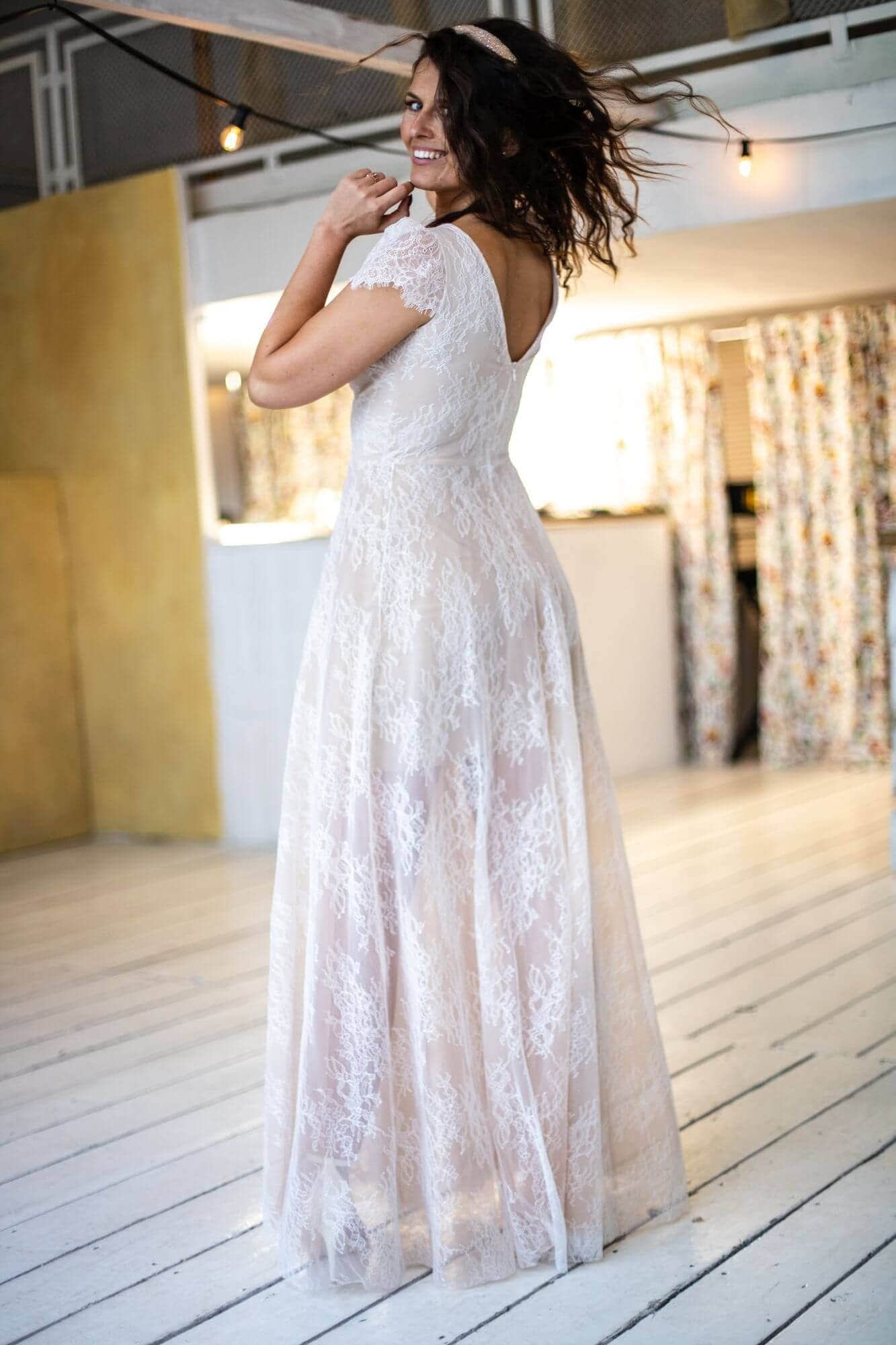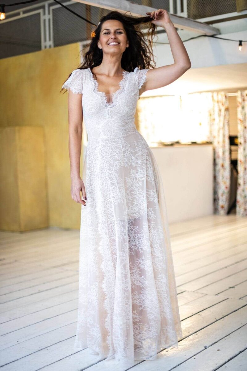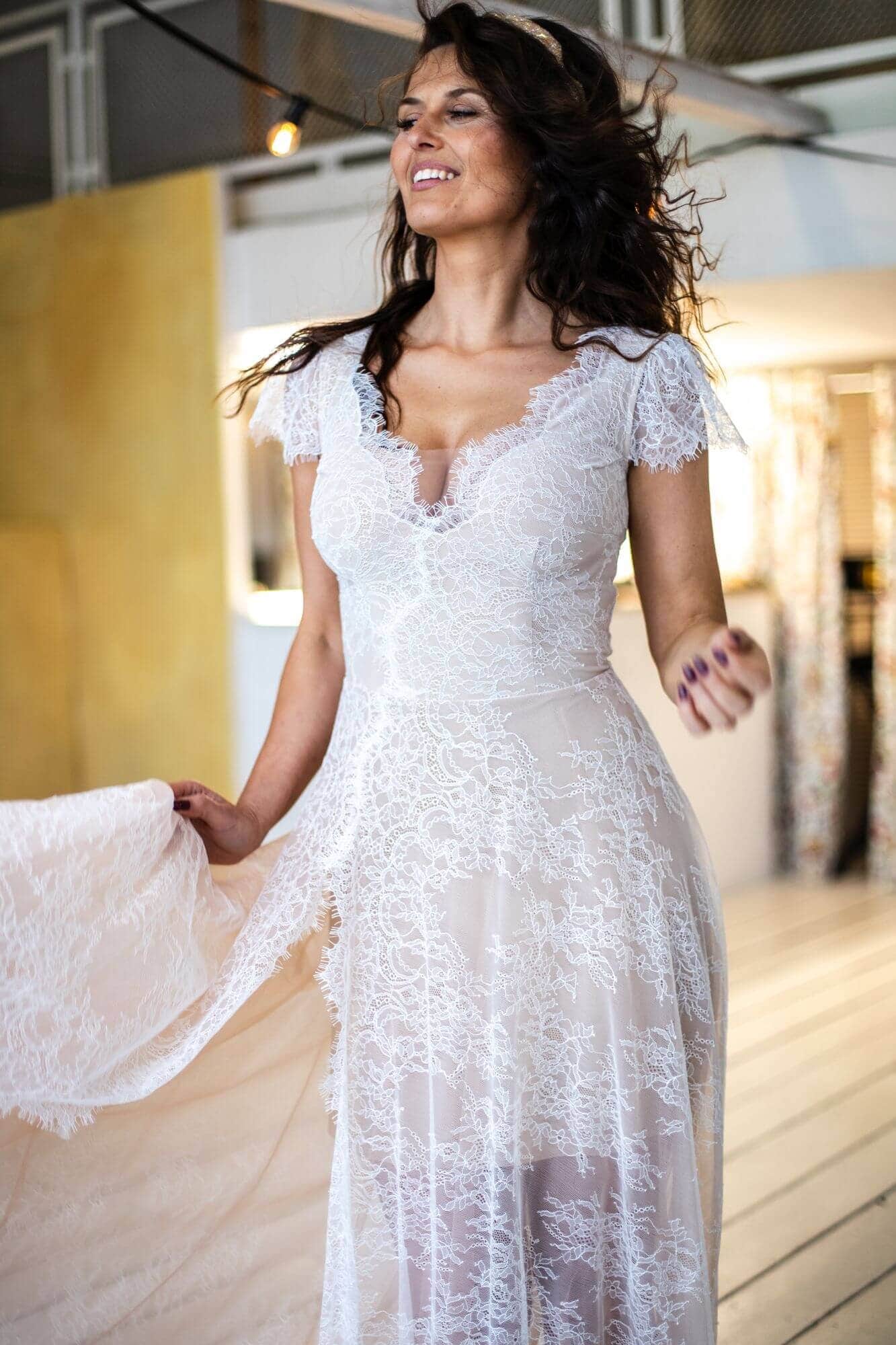 Uszyta ze sprawdzonych i przetestowanych przez nas materiałów. Używane przez nas koronki są mięciutkie, a dzięki swej lekkości cudownie układają się na sylwetce i pięknie wirują w tańcu. Ich elastyczność sprawia, że pracują z Twoim ciałem. Zapewniają komfort rosnącemu ciążowemu brzuszkowi. Praktycznie wszystkie nasze koronki są łatwe do prania w domowej pralce i niegniotące, dzięki czemu swoją suknię spokojnie możesz spakować do walizki i zabrać na romantyczną sesję poślubną.