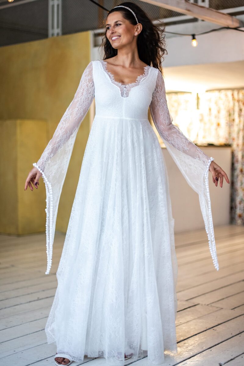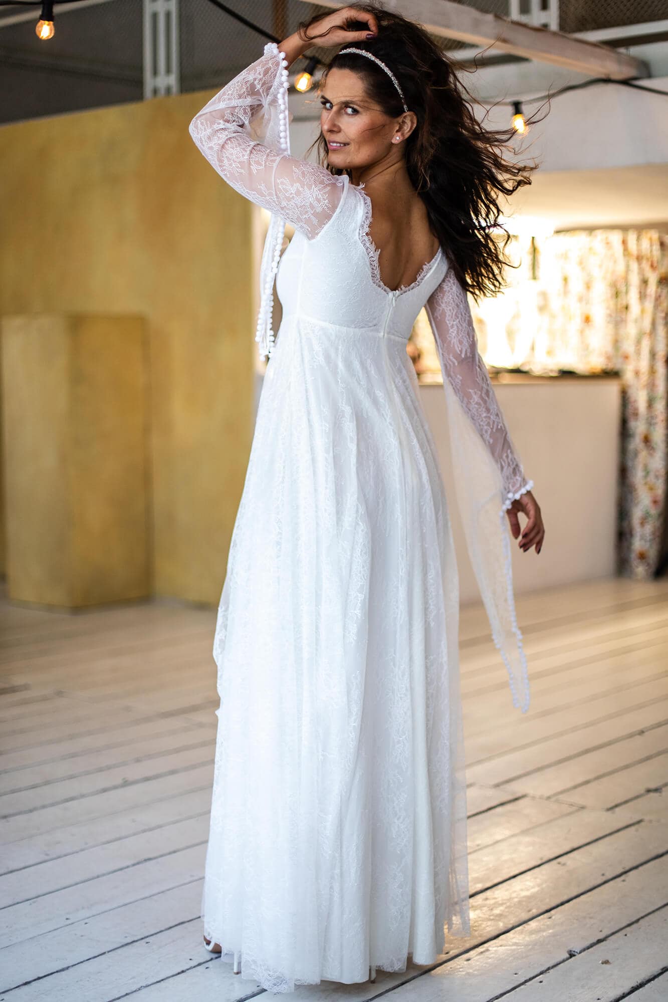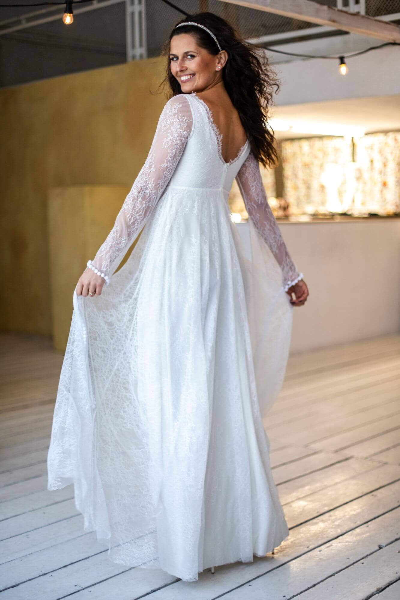 Uszyta ze sprawdzonych i przetestowanych przez nas materiałów. Używane przez nas koronki są mięciutkie, a dzięki swej lekkości cudownie układają się na sylwetce i pięknie wirują w tańcu. Ich elastyczność sprawia, że pracują z Twoim ciałem. Zapewniają komfort rosnącemu ciążowemu brzuszkowi. Praktycznie wszystkie nasze koronki są łatwe do prania w domowej pralce i niegniotące, dzięki czemu swoją suknię spokojnie możesz spakować do walizki i zabrać na romantyczną sesję poślubną.