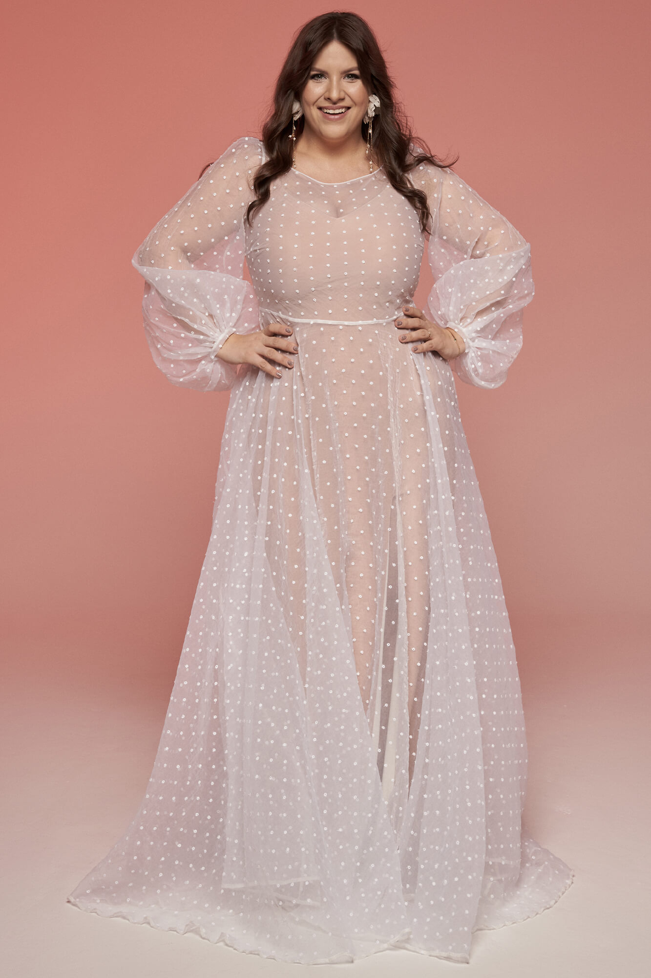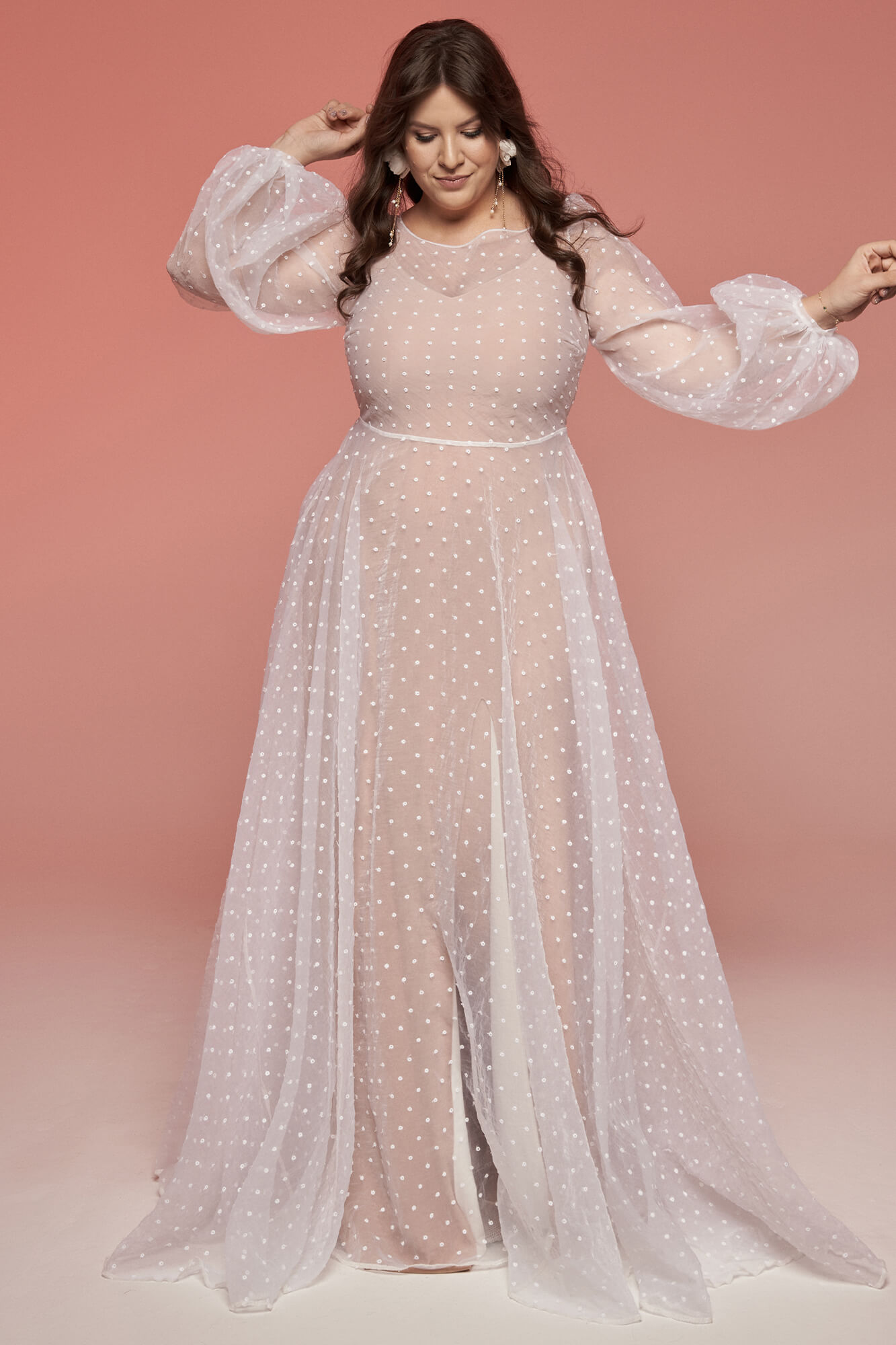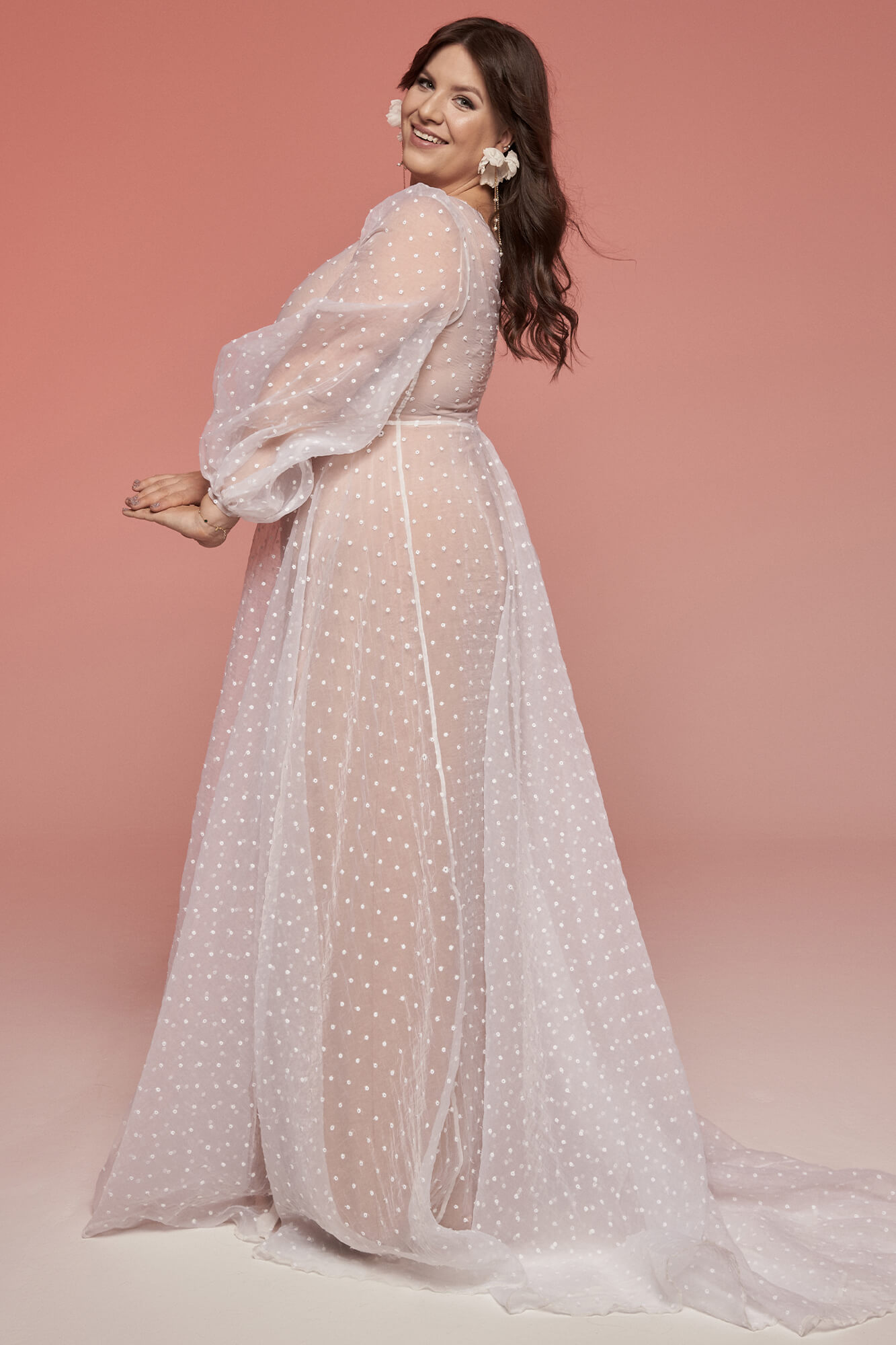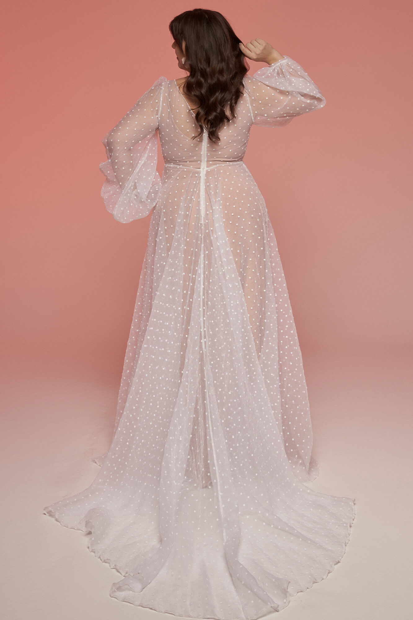 Suknia Ślubna w groszki z długim rękawem to świetna propozycja na plenerową ceremonię w chłodniejsze dni! Jeśli boisz się, że organtyna nie oddycha i długi rękaw sprawi, że poczujesz dyskomfort w tańcu to wiedz, że w dniu szycia sukni w naszej pracowni możemy go zamienić na krótki lub zastąpić frędzlami na ramionach i np. dekolcie na plecach. Podszewka we wzorze jest w kolorze cielistym i przylega do ciała, ale na Twoje potrzeby możemy ją zrobić luźną i w innym kolorze – śnieżnobiały, ecru, piaskowy, toffi. Jeśli nie lubisz dekoltów pod samą szyję możemy Ci go wyciąć na dowolną głębokość, a także zmienić mu kształt. Możemy także dodać rozcięcie na nogę i zlikwidować tren, aby suknia była bardziej wygodna do tańca.