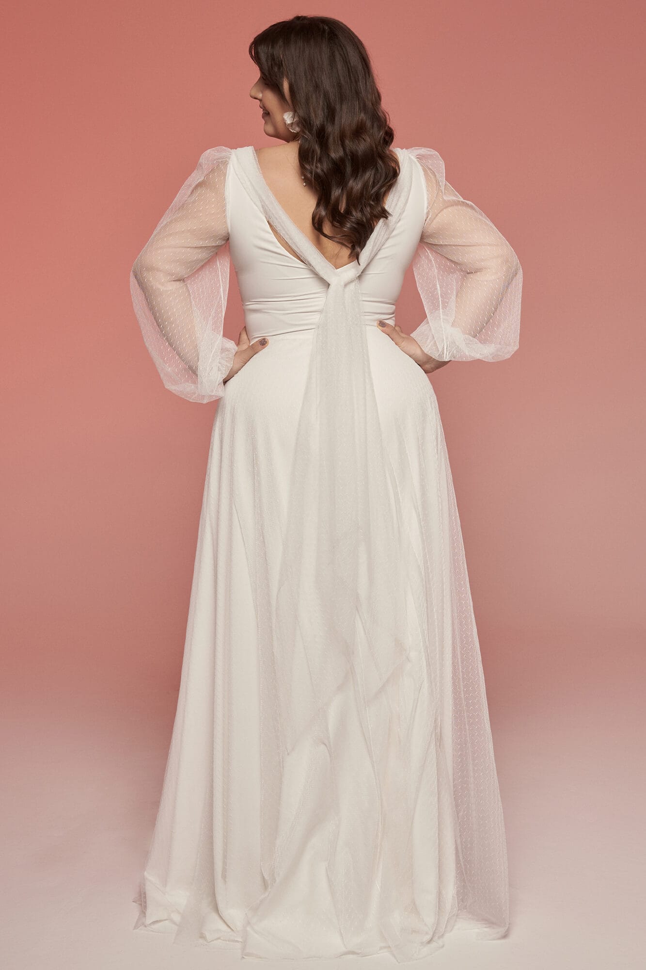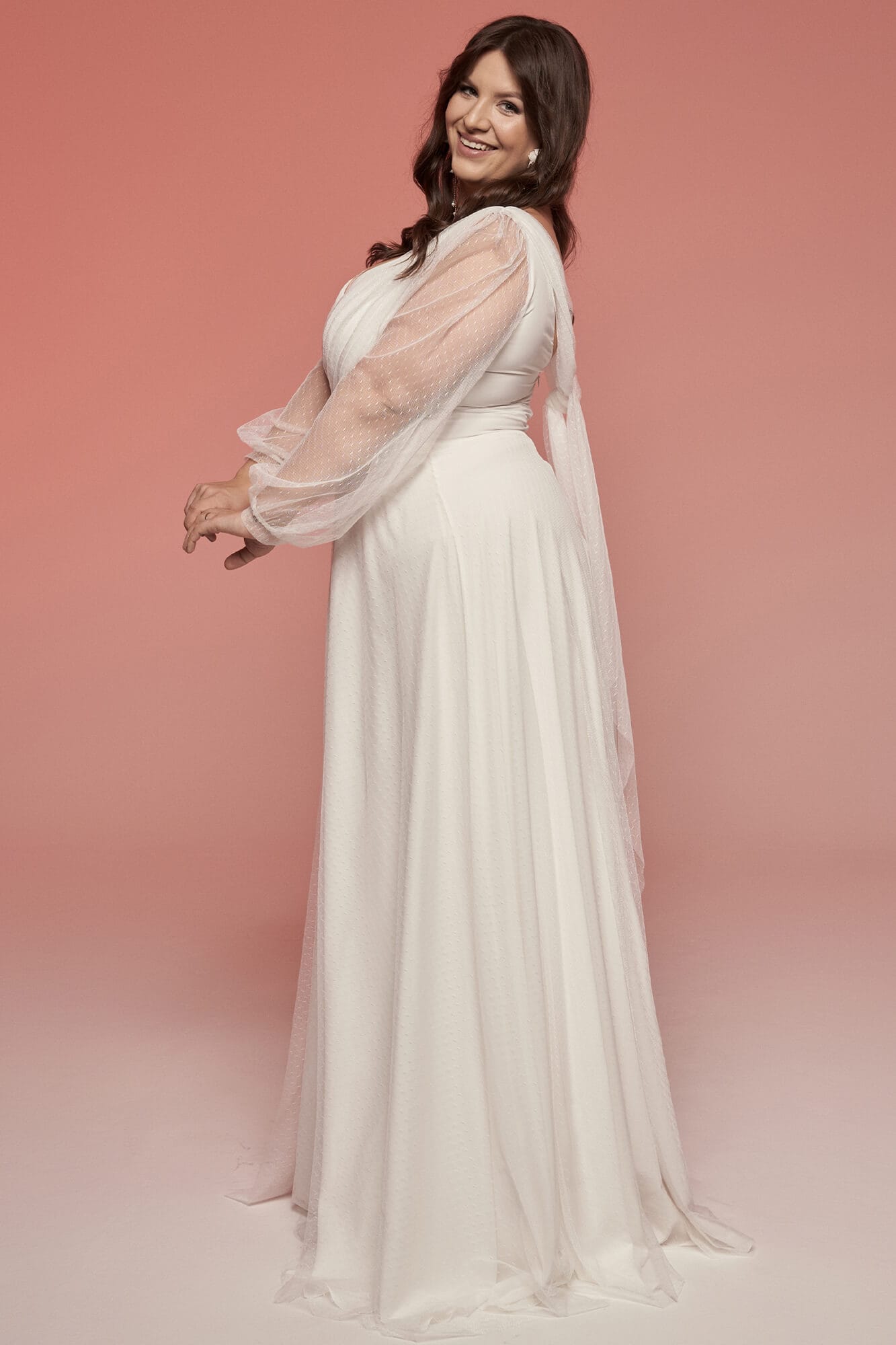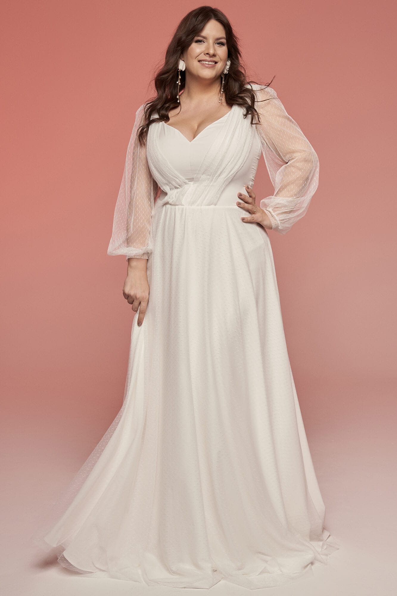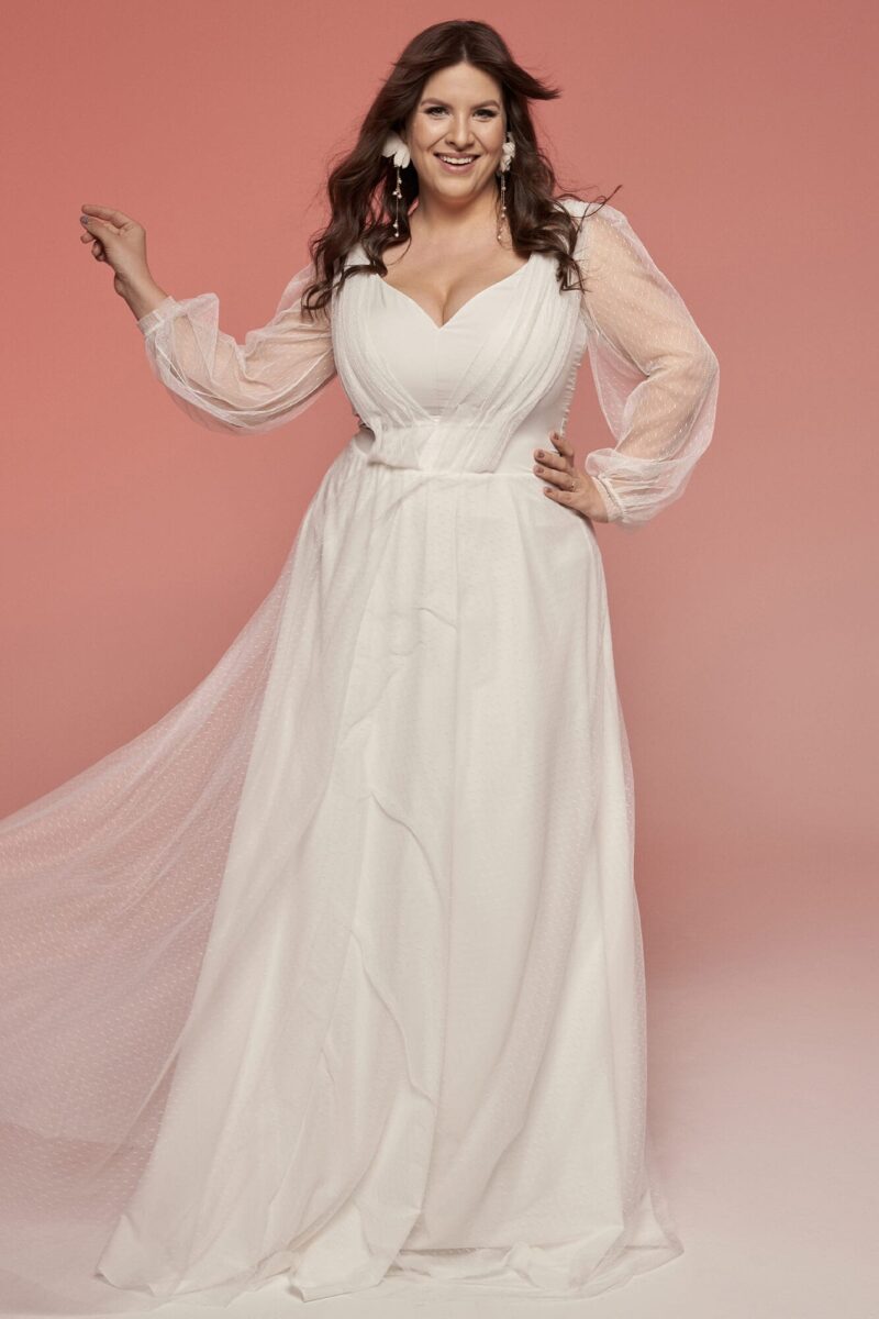 Biała, klasyczna suknia ślubna plus size wcale nie musi być nudna. Przy tak gładkich materiałach można bawić się formą. I tak oto w tym modelu mamy niesamowicie zmysłowy dekolt w kształcie serduszka, bufiaste, zwiewne rękawy zakończone wąskimi mankietami oraz delikatne drapowania na biuście. Spódnica sukni ślubnej z szyfonem i tiulem skrojona jest z połowy koła i delikatnie układa się w literkę A. Talia została podkreślona paskiem z warstwą udrapowanego tiulu. Z pozoru prosty dekolt na plecach zdobi nieoczywista szarfa luźno przewiązanej dzianiny tiulowej w kropeczki. Cała kreacja mimo skromnych materiałów i delikatnych wzorów wygląda bardzo strojnie i elegancko. Jeśli planujesz ślub w kościele, ale wesele już w plenerze to jest to suknia, która idealnie sprawdzi się w obu tych miejscach. Do takiej sukni ślubnej z szyfonem i tiulem pasują praktycznie wszystkie dodatki, nieważne czy postawisz na kolorowe chwosty, czy na diamenty – wpasują się one w tę stylizację idealnie. Ten model ma odcień ciepłej bieli, dzięki czemu pasuje do większości typów urody, nie musisz się więc obawiać, że będziesz wyglądała w niej blado, jeśli masz jasną karnację. Pamiętaj, że przez gładki materiał bardziej przebija faktura wszystkiego co masz pod nim, dlatego tak ważne jest, aby założyć pod spód gładką, cielistą bieliznę, która nie wrzyna się w ciało. Ogromnym atutem tej sukni są półprzezroczyste, luźne rękawy, dzięki którym Twoje ręce będą delikatnie przysłonięte, ale jednocześnie nie będzie Ci w nich zbyt gorąco podczas całonocnych tańców. Nie przytłaczają także sylwetki, wręcz przeciwnie – sprawiają, że cała stylizacja wygląda jeszcze lżej.