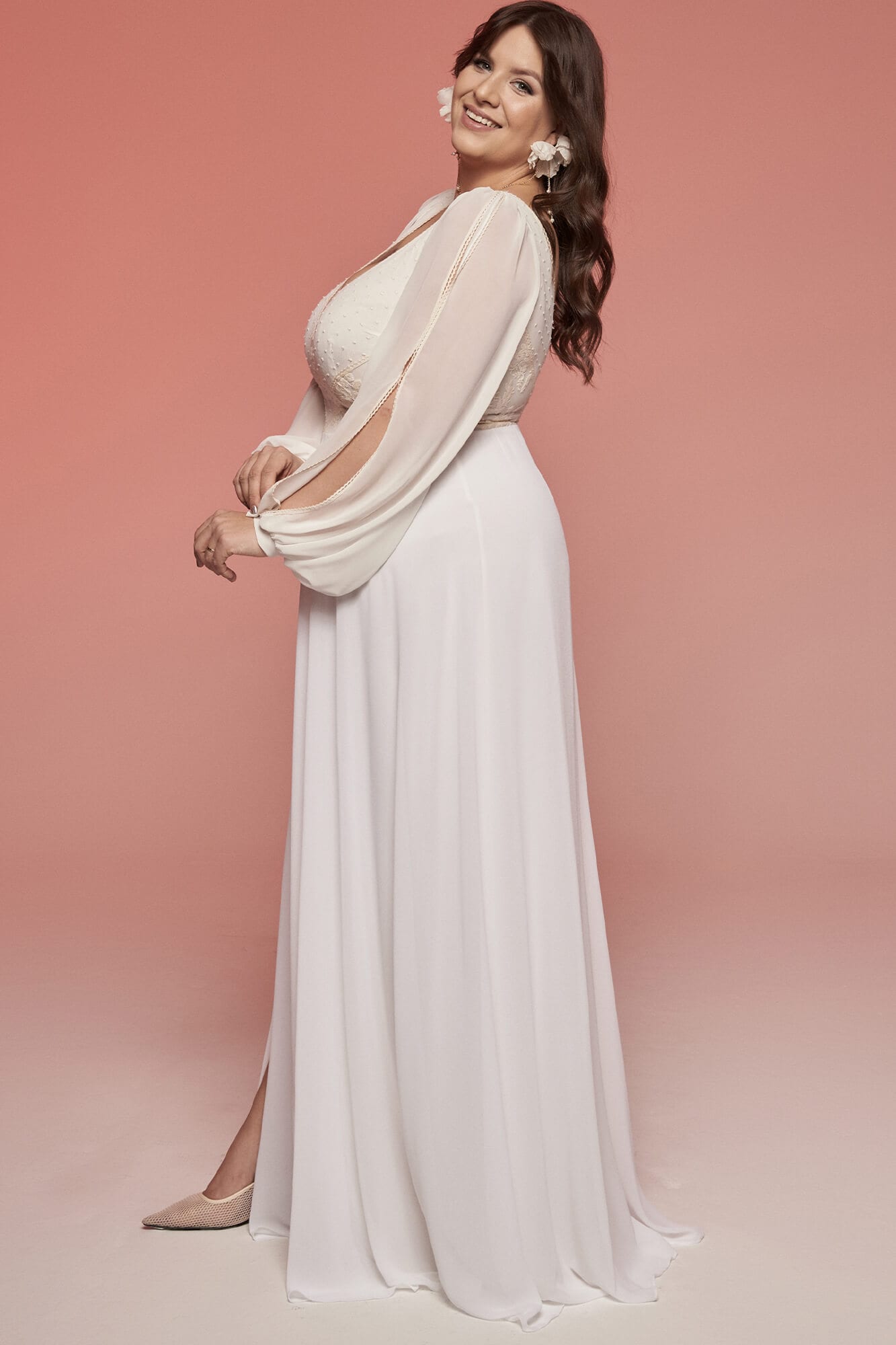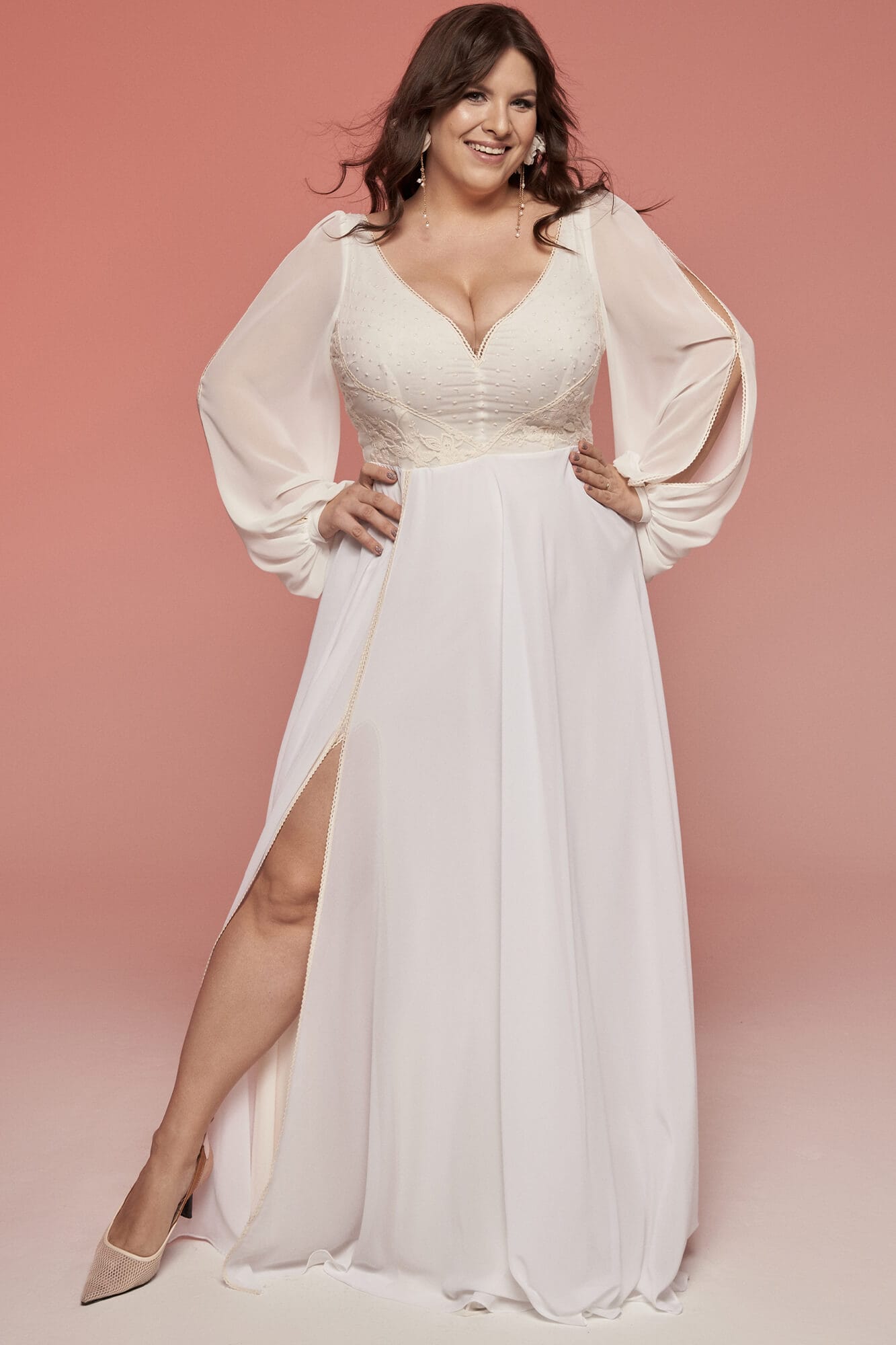 Gładka suknia ślubna z lejącego szyfonu to idealne rozwiązanie nie tylko na klasyczny ślub kościelny. Sprawdzi się również podczas plenerowego przyjęcia pośród kwitnących łąk. Delikatny szyfon unosi się przy każdym ruchu czy delikatnym podmuchu wiatru. Do takiej prostej, skromnej sukienki możesz założyć zarówno wianek, jak i strojne, błyszczące kolczyki. Mimo dosyć zabudowanej formy, ten model posiada także detale, które czynią go niezwykle kobiecym i seksownym. Dekolt ma kształt serduszka, dzięki czemu, mimo że odsłania wiele, nie wygląda wulgarnie. Rękawy delikatnie otulają ramiona, ale nie martw się, że będzie Ci w nich zbyt gorąco! Dzięki rozcięciom wierzchniej części rękawa będziesz czuła przyjemny chłód i jednocześnie wysmuklą one wizualnie Twoje ręce. Żeby nie było zbyt klasycznie, po bokach talii zostały wszyte delikatne, koronkowe wstawki w drobne kropeczki. Jest to bawełniana koronka z beżowymi haftami, która pięknie kontrastuje z białą bazą. Beżowy motyw został także powtórzony w pęknięciach rękawów oraz przy rozcięciu na nogę. Taki rozporek to świetne rozwiązanie dla kobiet, które kochają tańce do białego rana i cenią sobie swobodę ruchów. Sprawi także, że suknia ślubna z lejącego szyfonu wydaje się być jeszcze lżejsza, a cała sylwetka smuklejsza. Nie musisz się martwić o komfort w dniu ślubu – ta sukienka ślubna plus size jest nie tylko ultralekka, ale także bardzo miękka i elastyczna. Bez problemu między dniem szycia, a dniem ślubu możesz zmienić wagę o kilka kilogramów, a sukienka tego nie zauważy. : )