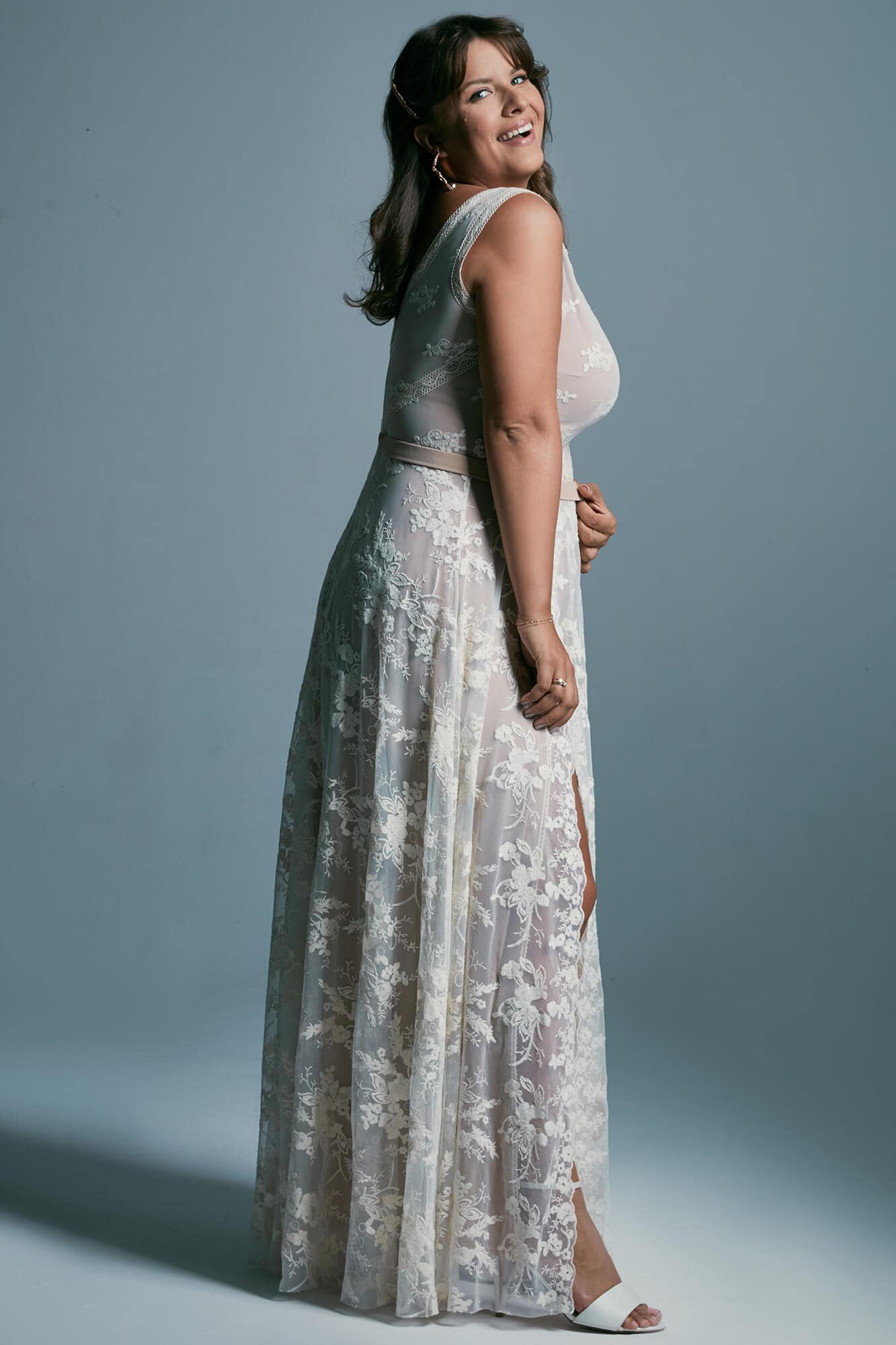 Romantyczna suknia ślubna plus size o klasycznym kroju to idealny model dla kobiet, które pragną podkreślić piękne walory swojego ciała. Beżowa kreacja to połączenie zjawiskowego fasonu z delikatną kwiatową fakturą koronki, która zachwyca swym oryginalnym i niezwykle subtelnym stylem. Dekolt sukni ślubnej plus size jest głęboko wycięty i obszyty kremową tasiemką zwężającą się i sięgającą do talii. Dzięki możliwości założenia stanika, biust jest pięknie podkreślony, a Panna Młoda ma zapewniony pełen komfort podczas poruszania się. Ta sama tasiemka zdobi też boki kreacji, która dzięki ukośnemu ułożeniu cudownie akcentuje linię piersi i wysmukla talię, pomagając przy tym ukryć drobne, ewentualne niedoskonałości. Dół projektu tworzy spódnica z niezwykle kobiecym i kokieteryjnym rozporkiem ukazującym nogę. Długie rozcięcie wydłuża całą sylwetkę zapewniając oryginalny wygląd sukni ślubnej plus size, która przepięknie prezentuje się w tańcu. Kreacja, dzięki miękkiej beżowej koronce oraz cielistej podszewce nie tylko świetnie podkreśla figurę, ale też rozświetla i ociepla karnację. Zwiewny szyk sukni nadający uroku i zmysłowego charakteru Pannie Młodej idealnie wpasuje się w każdą uroczystość – od mniejszych plenerowych imprez po wystawne i eleganckie gale.