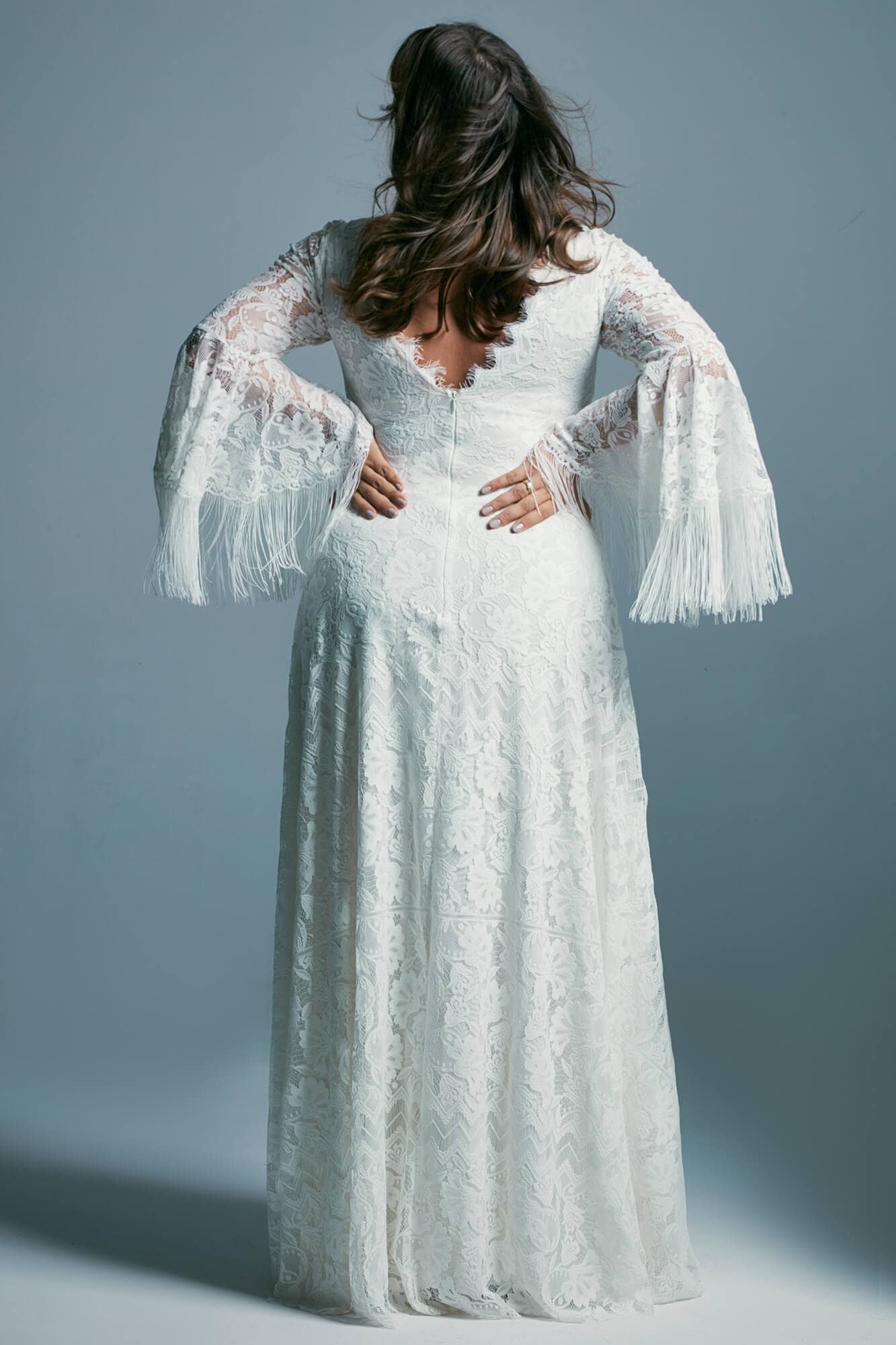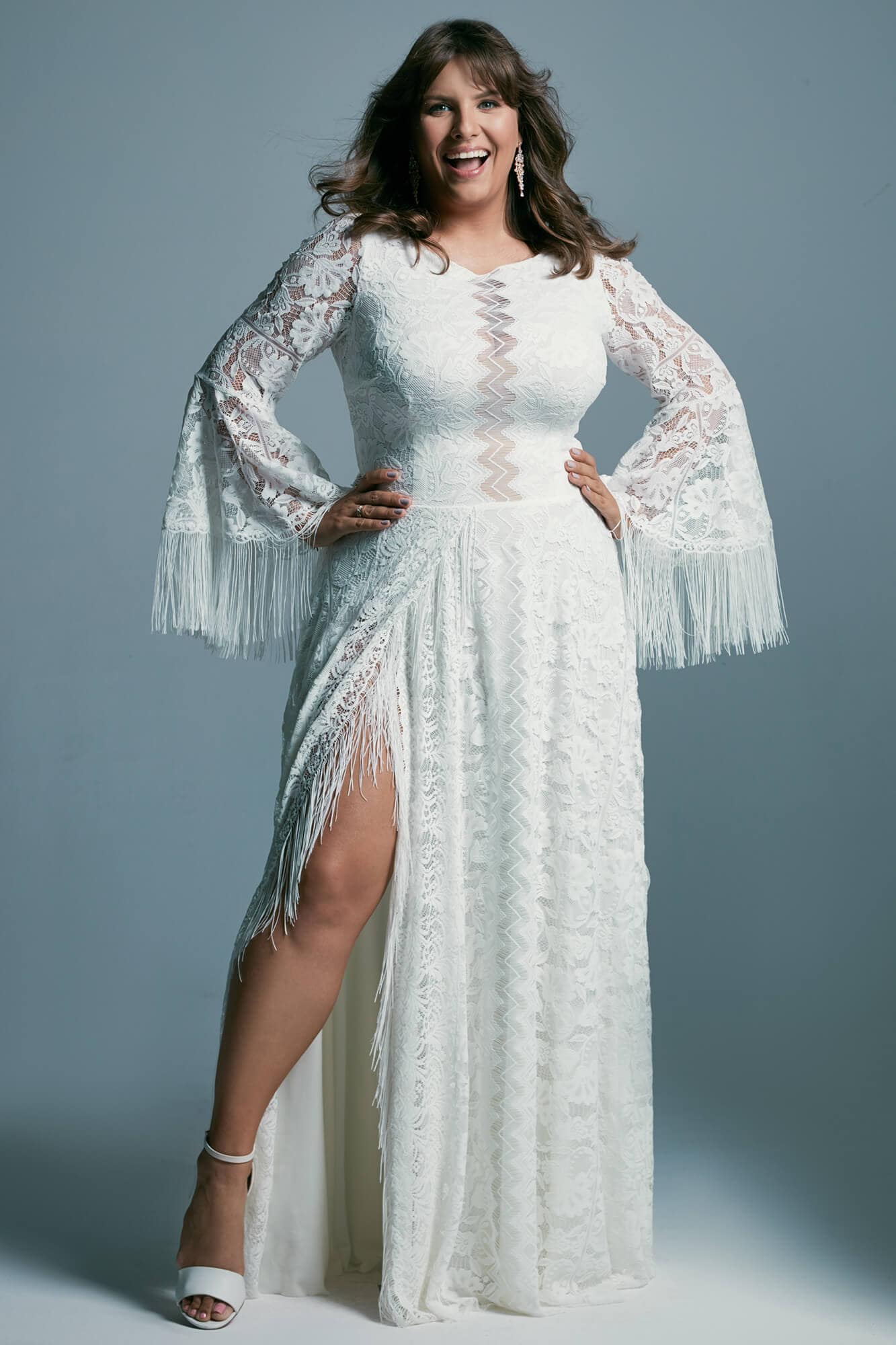 Ta suknia to model wyjściowy - możemy w niej zmienić praktycznie wszystko! Pogłębić lub spłycić dekolt, zmienić jego wykończenie, kształt, dodać lub odjąć falbankę czy frędzle. Rękawy mogą być dłuższe lub krótsze, mieć inny kształt niż te na zdjęciu. Może też nie być ich wcale. Tiul w spódnicy można dodać (lub odjąć) na wierzchu, albo pod spodem. Podszewka może być długa lub krótka w odcieniach bieli i beżu. Rozcięcie na nogę i tren można dodać lub usunąć praktycznie w każdym modelu.