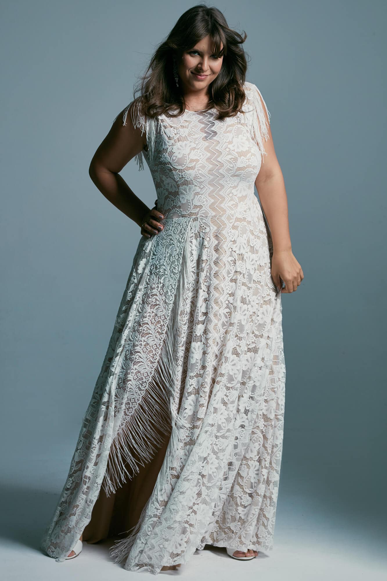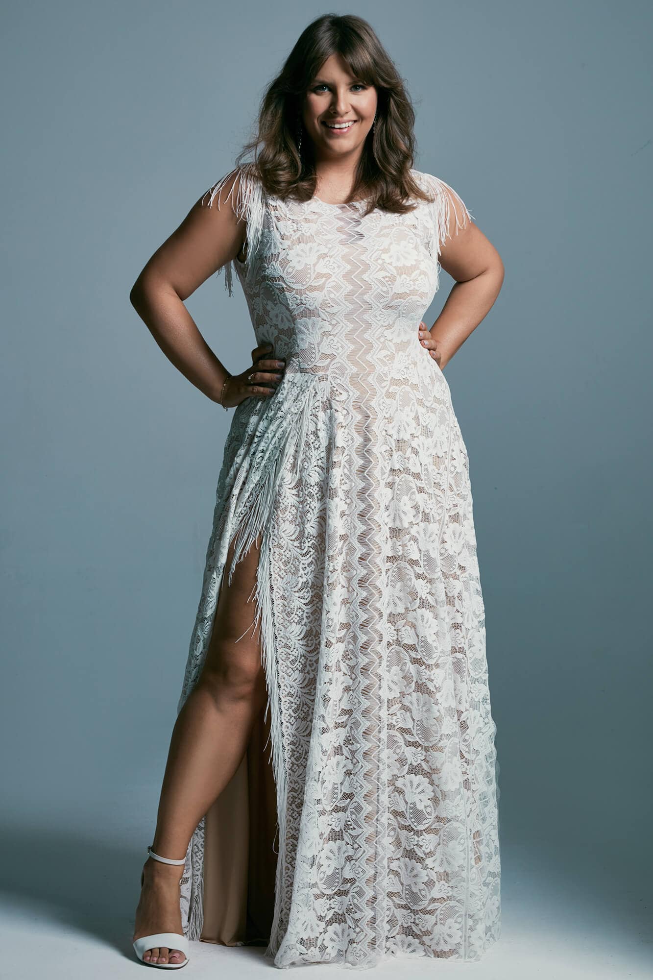 Ta suknia to model wyjściowy - możemy w niej zmienić praktycznie wszystko! Pogłębić lub spłycić dekolt, zmienić jego wykończenie, kształt, dodać lub odjąć falbankę czy frędzle. Rękawy mogą być dłuższe lub krótsze, mieć inny kształt niż te na zdjęciu. Może też nie być ich wcale. Tiul w spódnicy można dodać (lub odjąć) na wierzchu, albo pod spodem. Podszewka może być długa lub krótka w odcieniach bieli i beżu. Rozcięcie na nogę i tren można dodać lub usunąć praktycznie w każdym modelu.