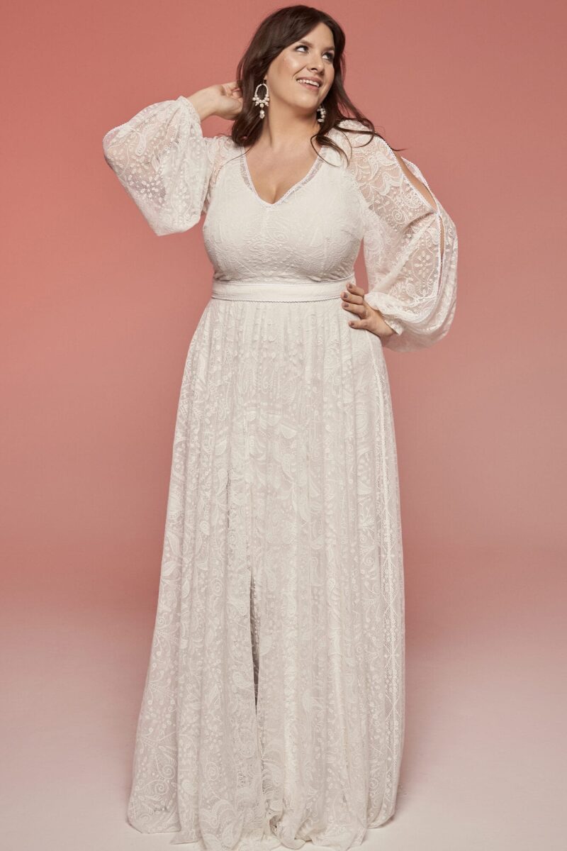 Ta suknia to model wyjściowy - możemy w niej zmienić praktycznie wszystko! Pogłębić lub spłycić dekolt, zmienić jego wykończenie, kształt, dodać lub odjąć falbankę czy frędzle. Rękawy mogą być dłuższe lub krótsze, mieć inny kształt niż te na zdjęciu. Może też nie być ich wcale. Tiul w spódnicy można dodać (lub odjąć) na wierzchu, albo pod spodem. Podszewka może być długa lub krótka w odcieniach bieli i beżu. Rozcięcie na nogę i tren można dodać lub usunąć praktycznie w każdym modelu.