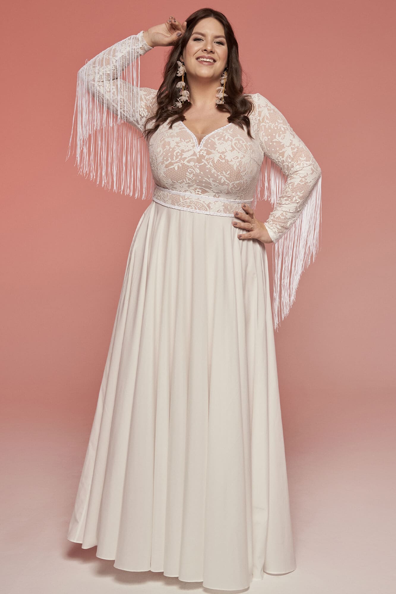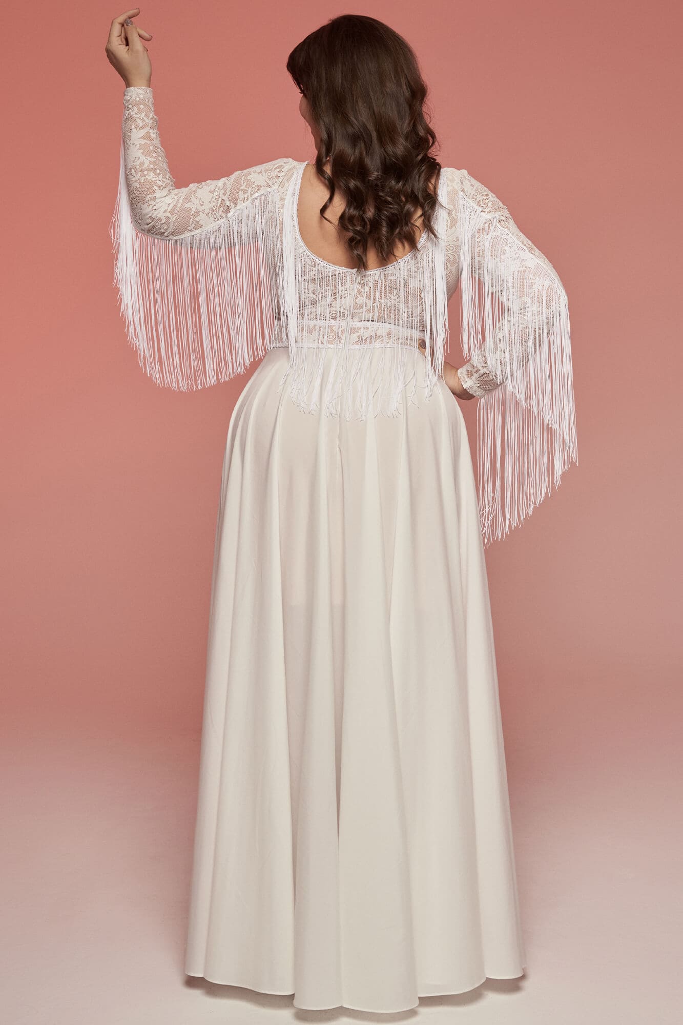 Ta suknia to model wyjściowy - możemy w niej zmienić praktycznie wszystko! Pogłębić lub spłycić dekolt, zmienić jego wykończenie, kształt, dodać lub odjąć falbankę czy frędzle. Rękawy mogą być dłuższe lub krótsze, mieć inny kształt niż te na zdjęciu. Może też nie być ich wcale. Tiul w spódnicy można dodać (lub odjąć) na wierzchu, albo pod spodem. Podszewka może być długa lub krótka w odcieniach bieli i beżu. Rozcięcie na nogę i tren można dodać lub usunąć praktycznie w każdym modelu.