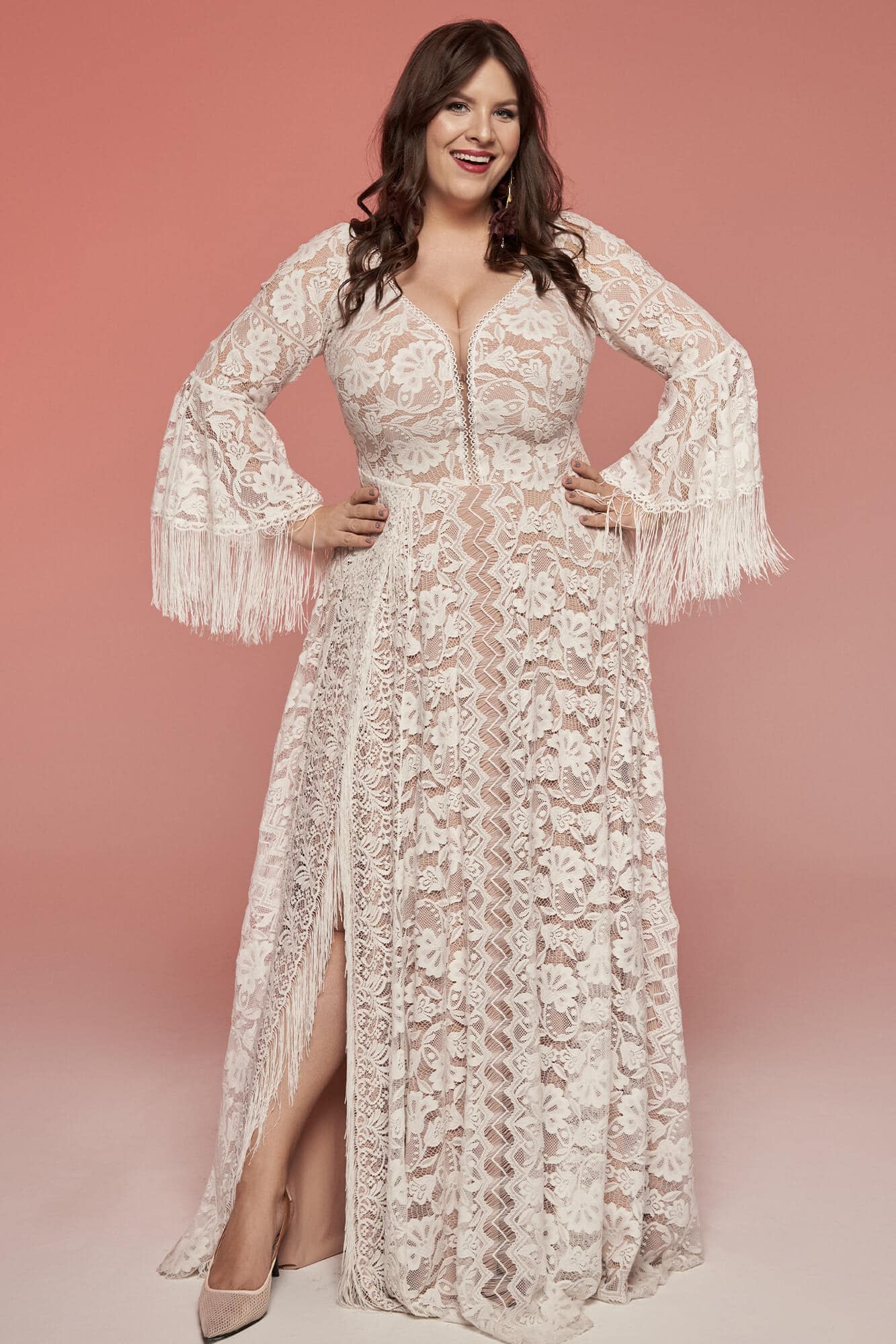 Ta suknia to model wyjściowy - możemy w niej zmienić praktycznie wszystko! Pogłębić lub spłycić dekolt, zmienić jego wykończenie, kształt, dodać lub odjąć falbankę czy frędzle. Rękawy mogą być dłuższe lub krótsze, mieć inny kształt niż te na zdjęciu. Może też nie być ich wcale. Tiul w spódnicy można dodać (lub odjąć) na wierzchu, albo pod spodem. Podszewka może być długa lub krótka w odcieniach bieli i beżu. Rozcięcie na nogę i tren można dodać lub usunąć praktycznie w każdym modelu.