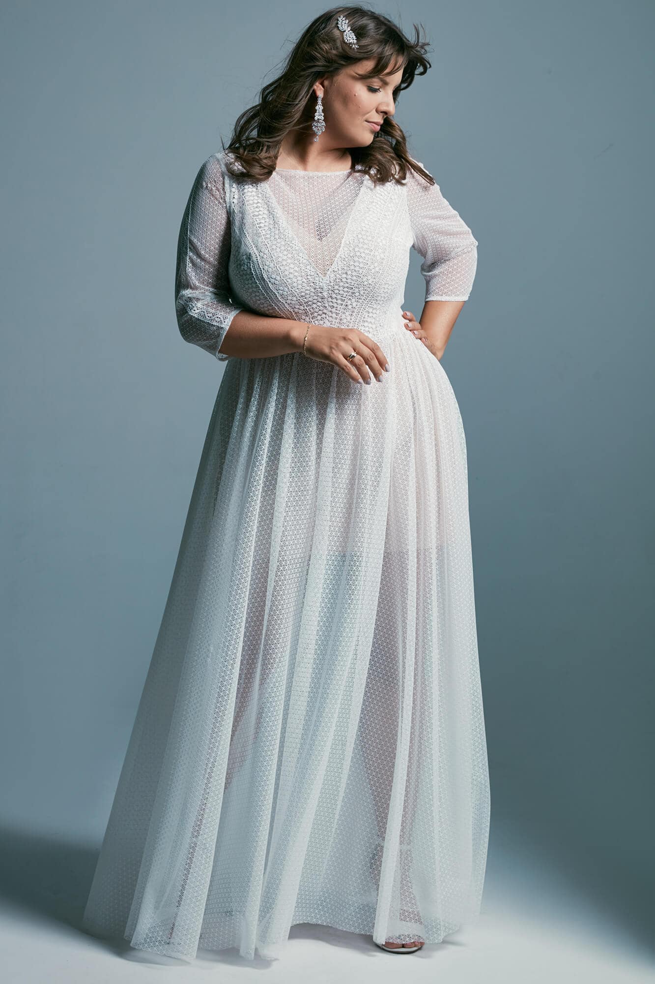 Ta suknia to model wyjściowy - możemy w niej zmienić praktycznie wszystko! Pogłębić lub spłycić dekolt, zmienić jego wykończenie, kształt, dodać lub odjąć falbankę czy frędzle. Rękawy mogą być dłuższe lub krótsze, mieć inny kształt niż te na zdjęciu. Może też nie być ich wcale. Tiul w spódnicy można dodać (lub odjąć) na wierzchu, albo pod spodem. Podszewka może być długa lub krótka w odcieniach bieli i beżu. Rozcięcie na nogę i tren można dodać lub usunąć praktycznie w każdym modelu.