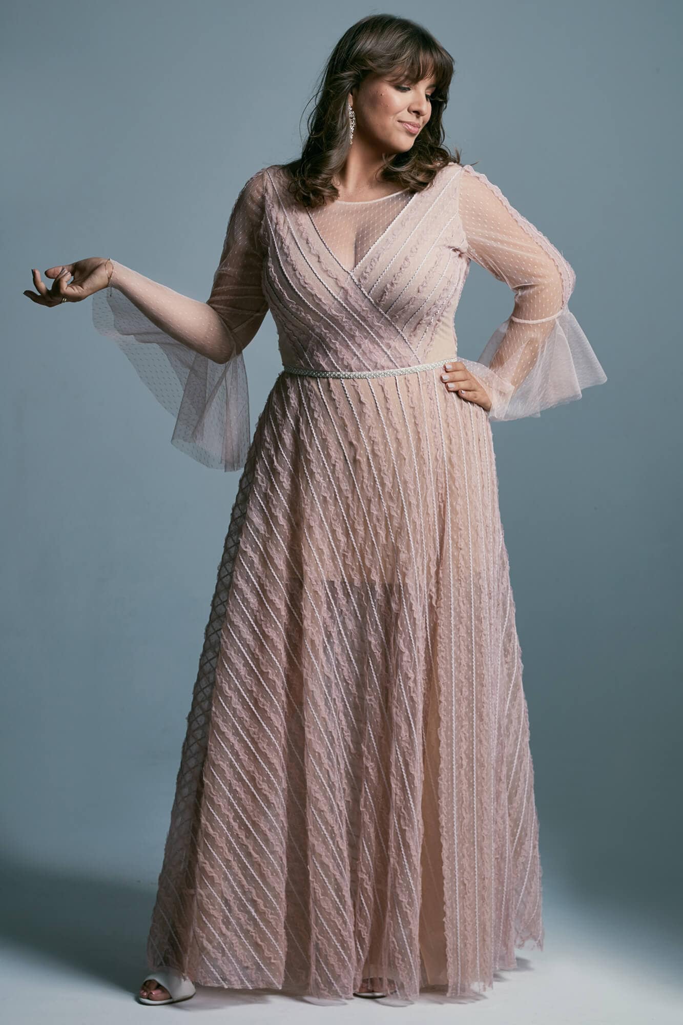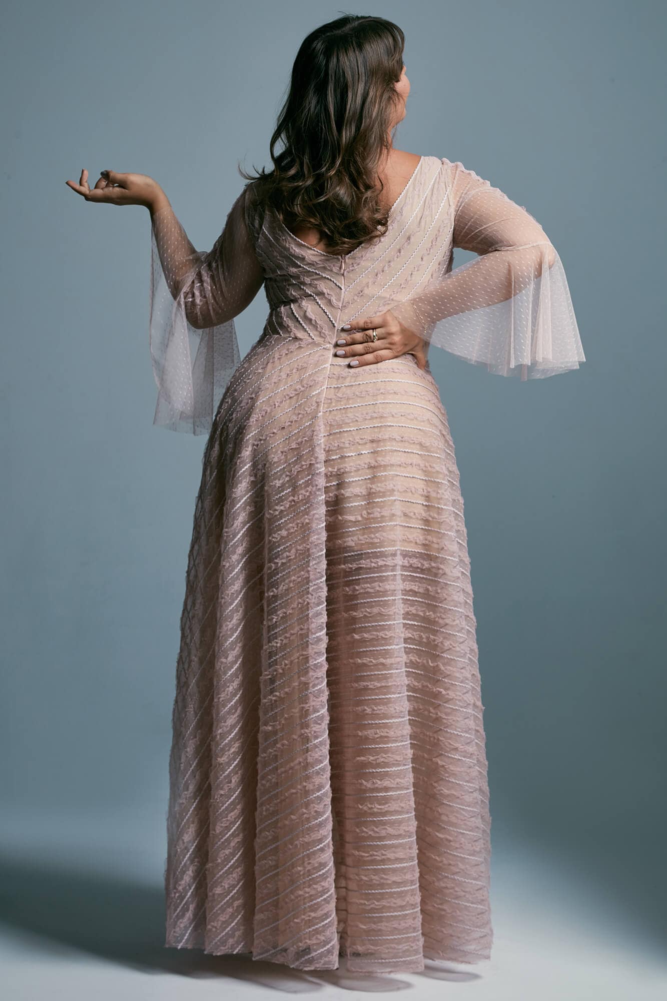 Ta suknia to model wyjściowy - możemy w niej zmienić praktycznie wszystko! Pogłębić lub spłycić dekolt, zmienić jego wykończenie, kształt, dodać lub odjąć falbankę czy frędzle. Rękawy mogą być dłuższe lub krótsze, mieć inny kształt niż te na zdjęciu. Może też nie być ich wcale. Tiul w spódnicy można dodać (lub odjąć) na wierzchu, albo pod spodem. Podszewka może być długa lub krótka w odcieniach bieli i beżu. Rozcięcie na nogę i tren można dodać lub usunąć praktycznie w każdym modelu.