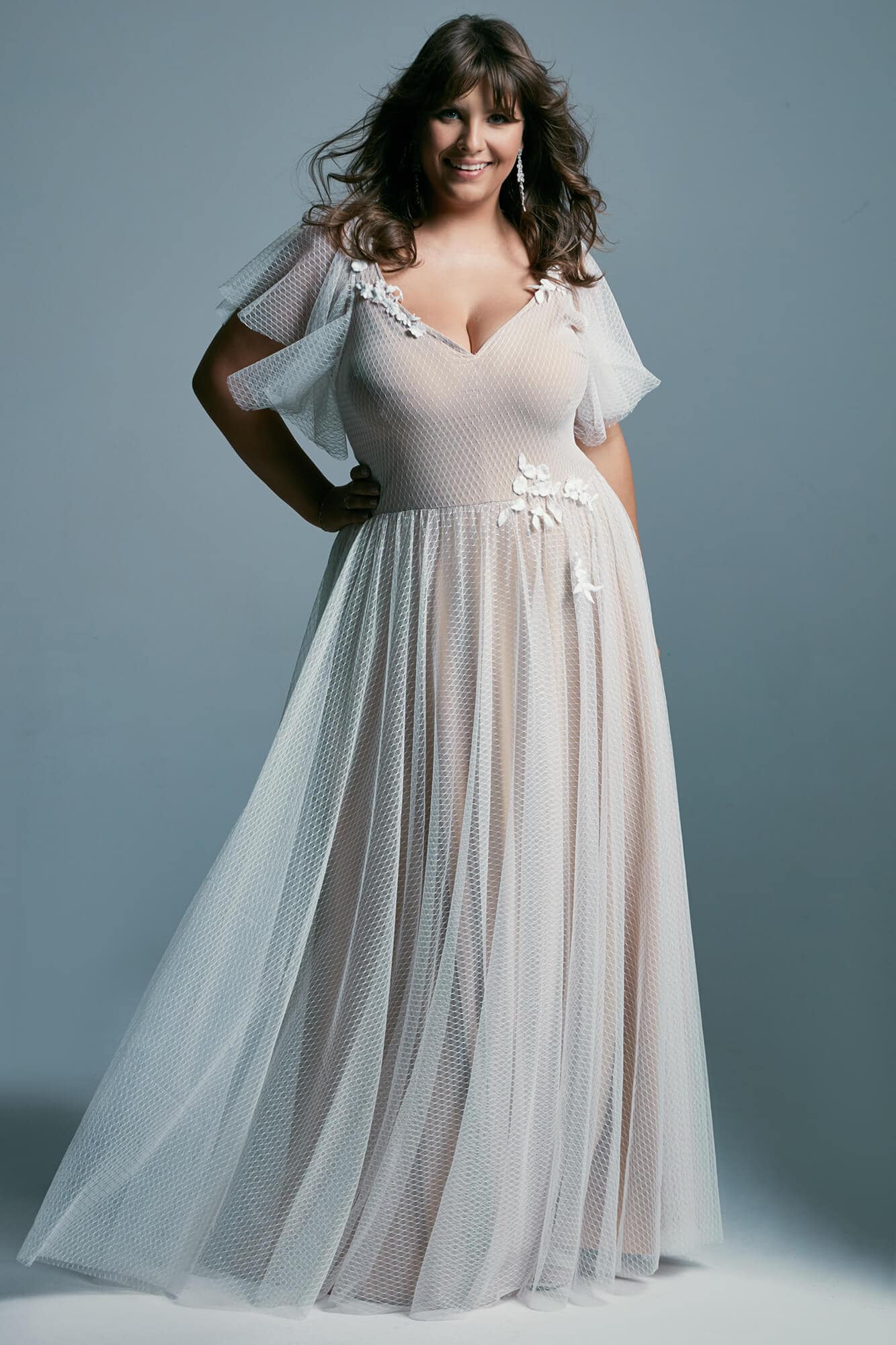 Suknia ślubna plus size z delikatnego tiulu z dziewczęcą gracją podkreśli urodę i nada romantycznego charakteru każdej Pannie Młodej. Ta delikatna, zwiewna kreacja uświetni niejedną uroczystość i wspaniale podkreśli atuty figury. Trójwymiarowe akcenty w postaci białych, koronkowych kwiatów są niczym wisienka na torcie w tym delikatnym i zmysłowym projekcie.