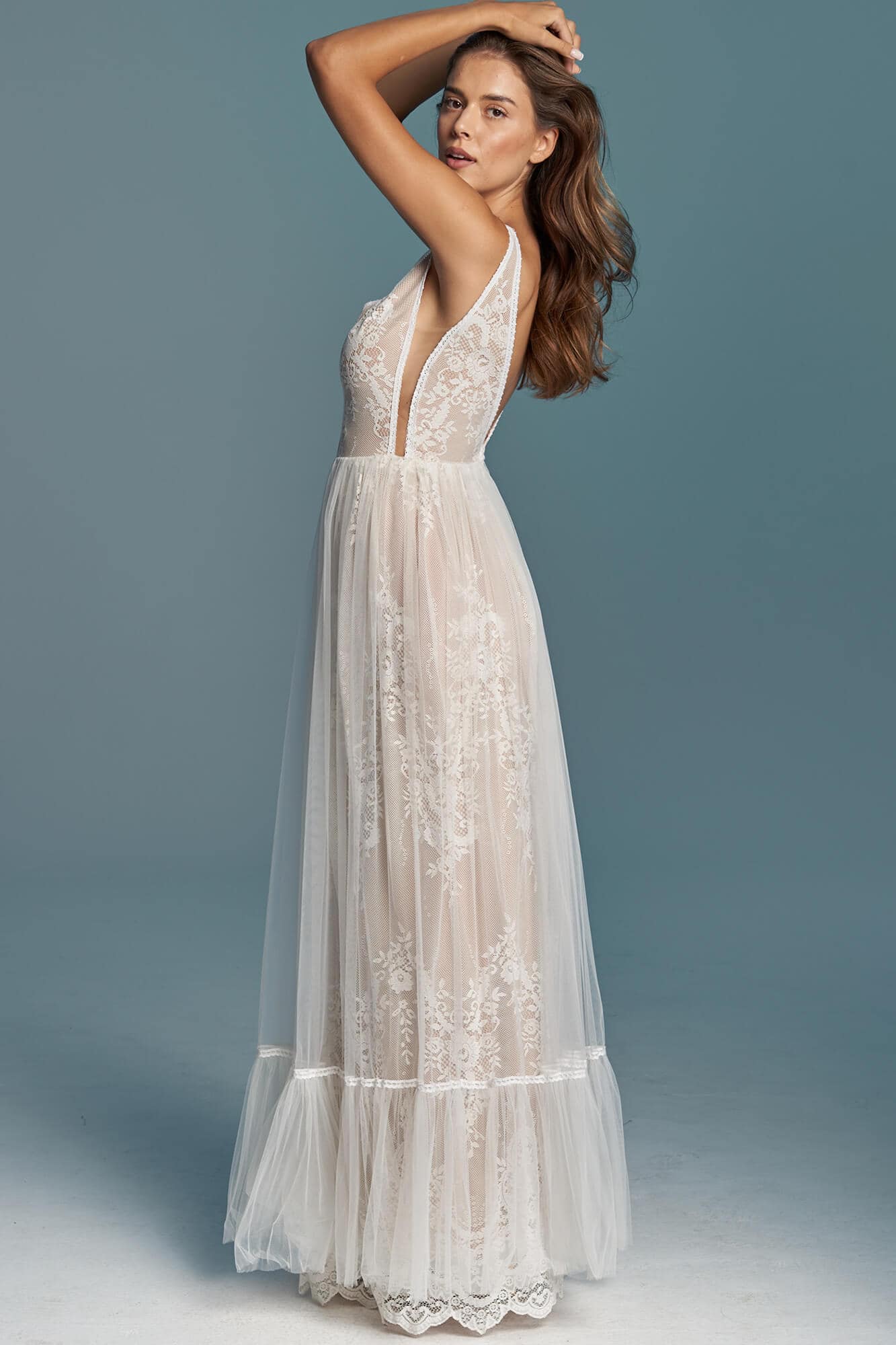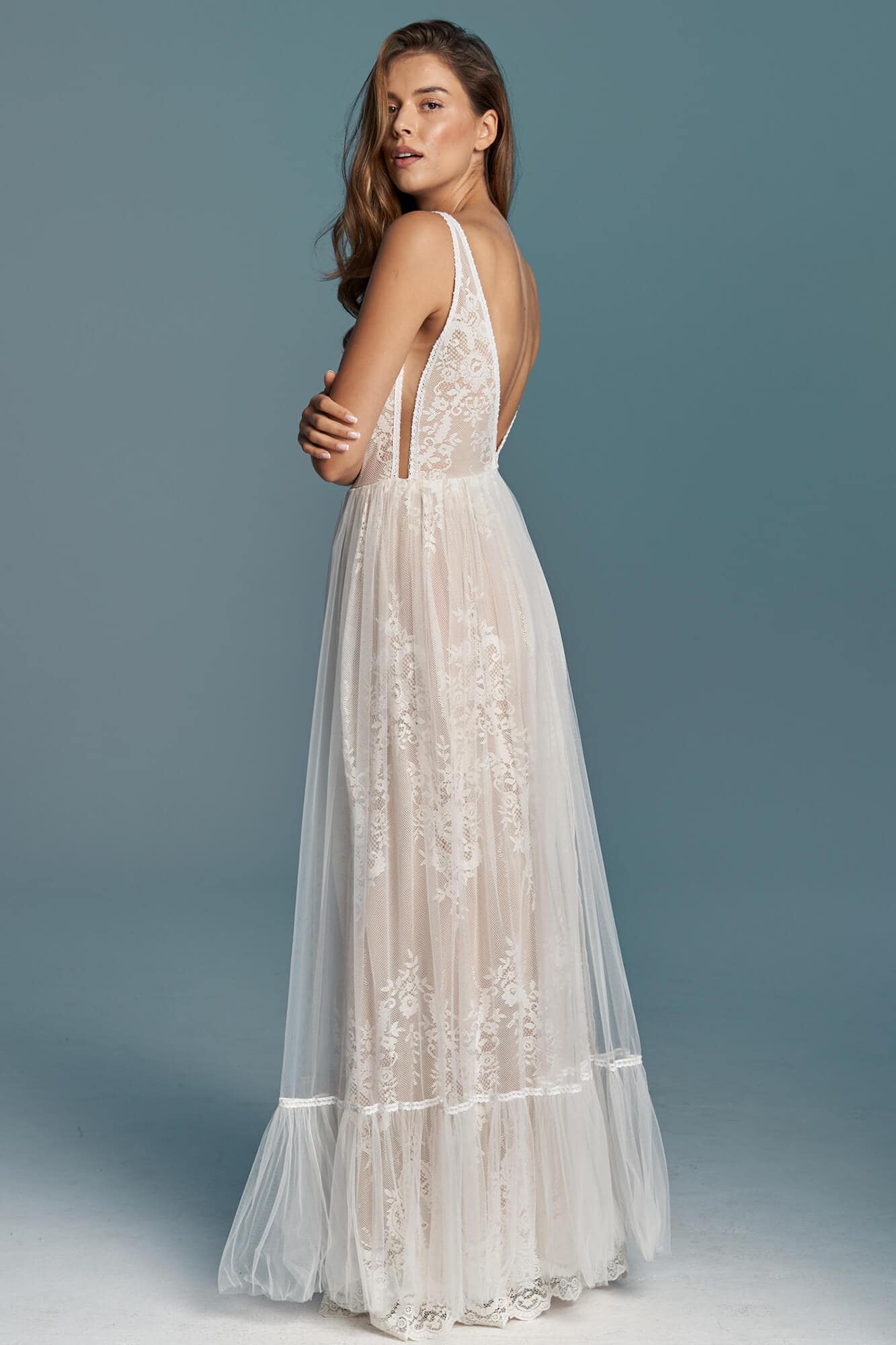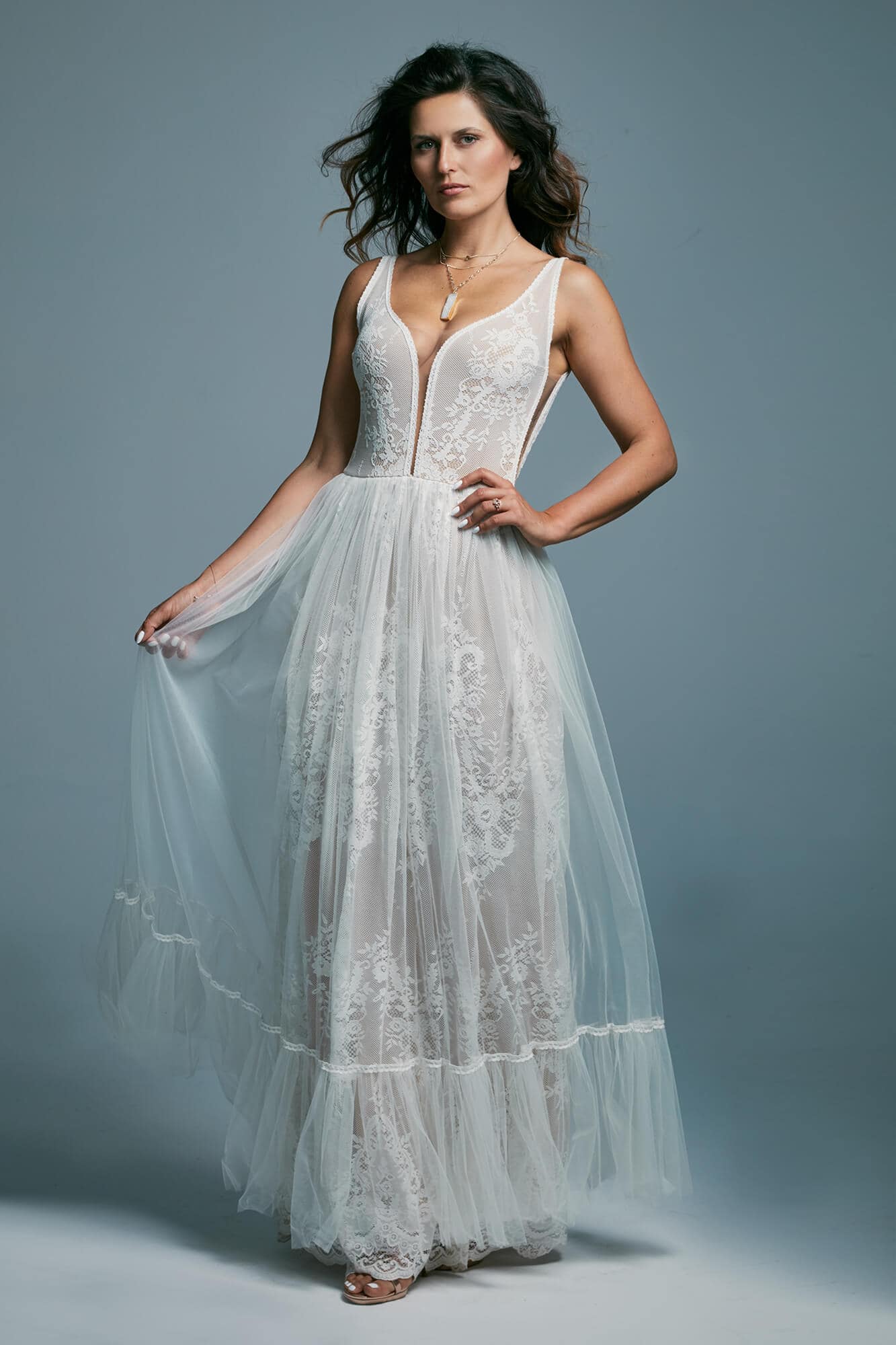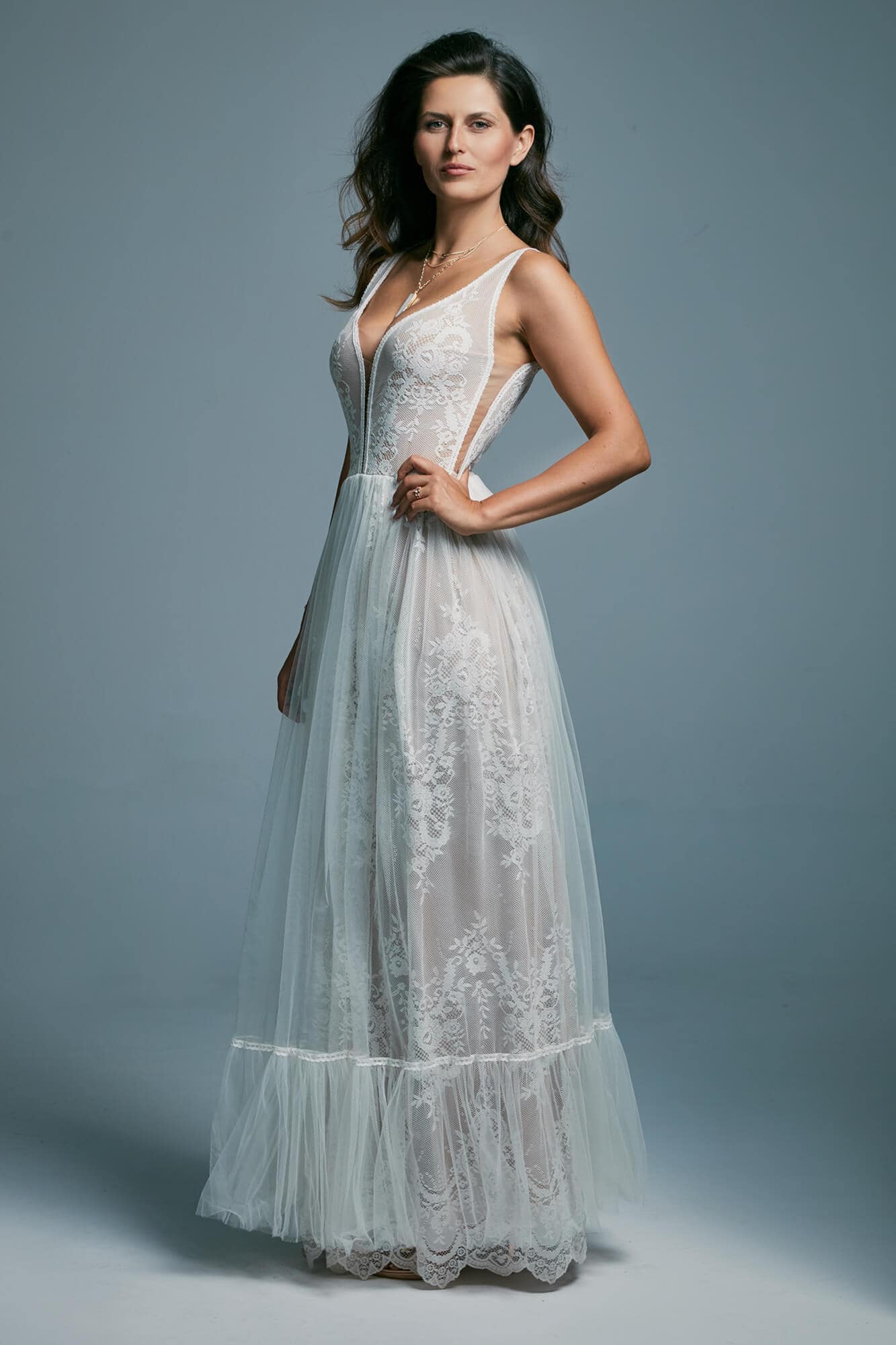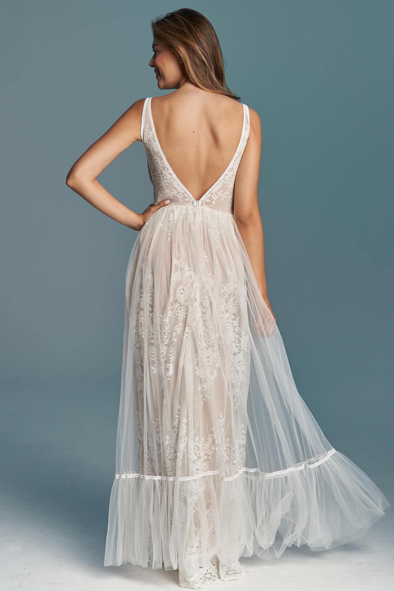 Ta suknia to model wyjściowy - możemy w niej zmienić praktycznie wszystko! Pogłębić lub spłycić dekolt, zmienić jego wykończenie, kształt, dodać lub odjąć falbankę czy frędzle. Rękawy mogą być dłuższe lub krótsze, mieć inny kształt niż te na zdjęciu. Może też nie być ich wcale. Tiul w spódnicy można dodać (lub odjąć) na wierzchu, albo pod spodem. Podszewka może być długa lub krótka w odcieniach bieli i beżu. Rozcięcie na nogę i tren można dodać lub usunąć praktycznie w każdym modelu.