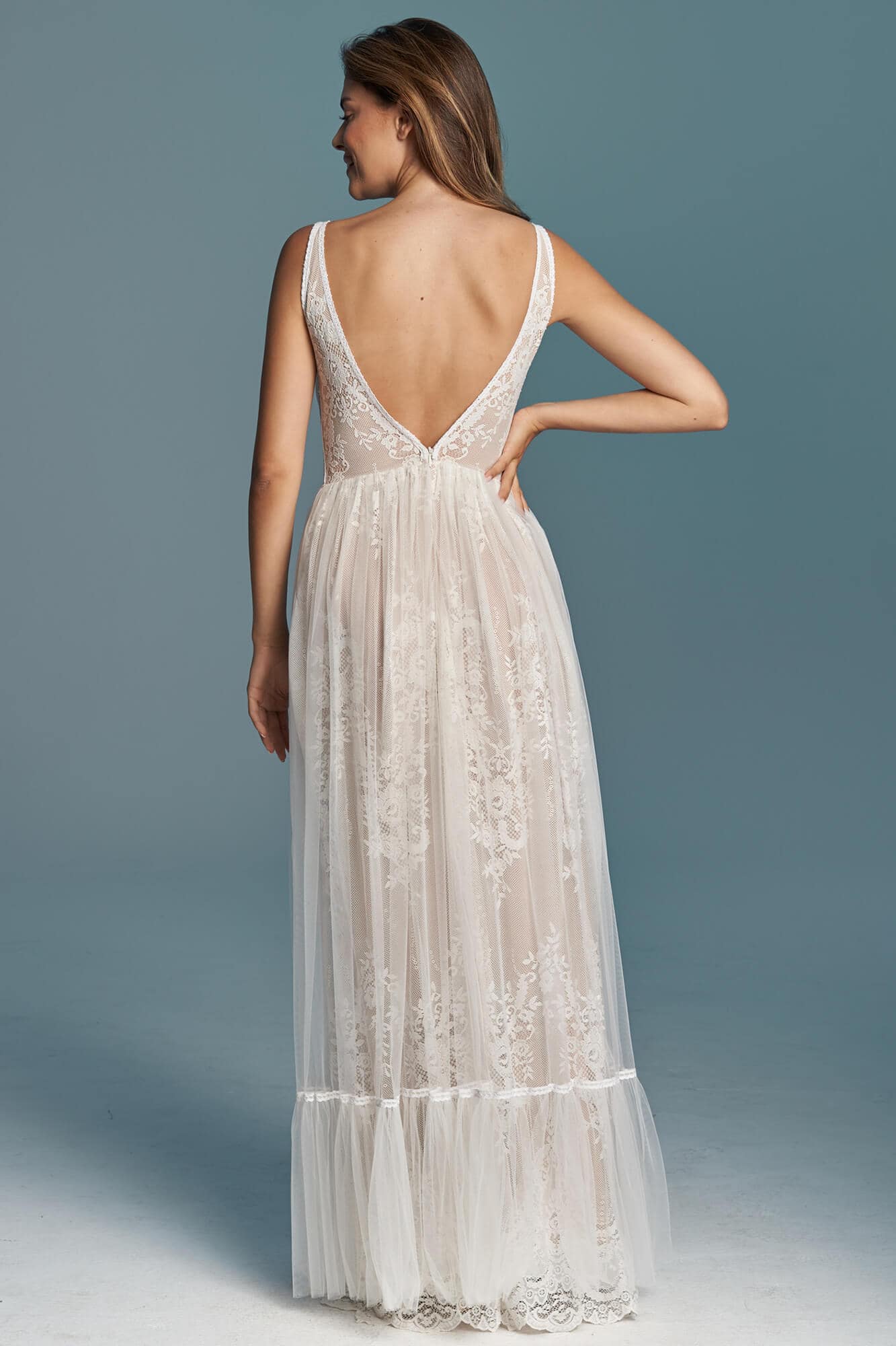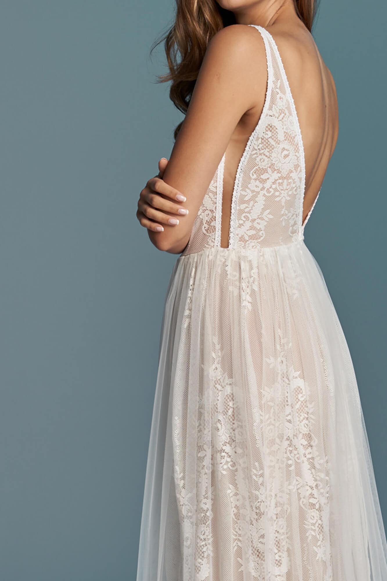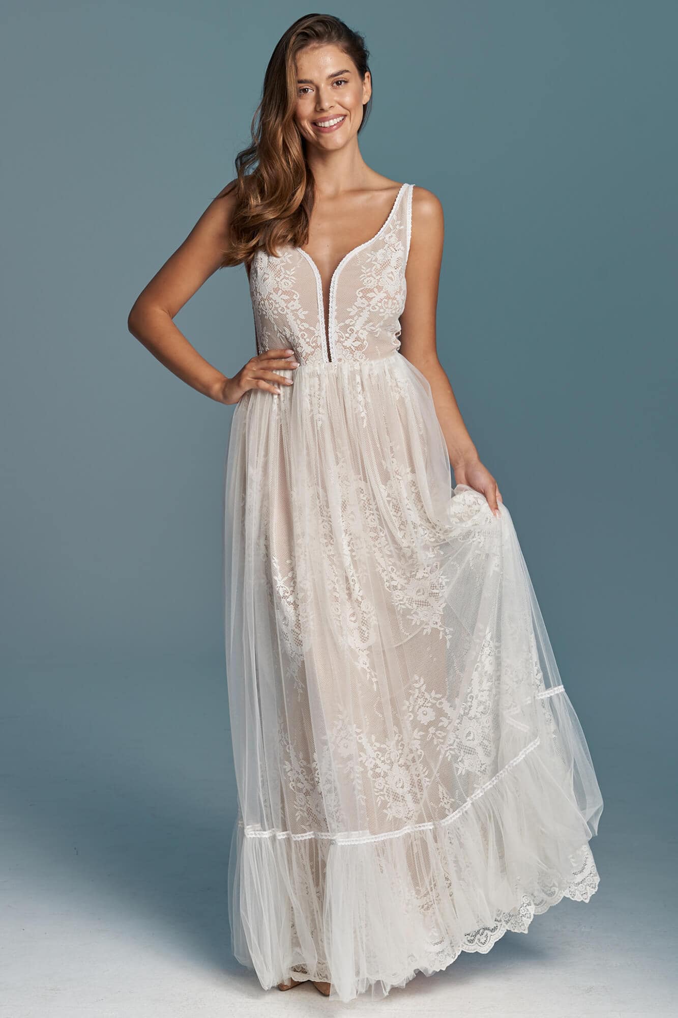 Uszyta ze sprawdzonych i przetestowanych przez nas materiałów. Używane przez nas koronki są mięciutkie, a dzięki swej lekkości cudownie układają się na sylwetce i pięknie wirują w tańcu. Ich elastyczność sprawia, że pracują z Twoim ciałem. Zapewniają komfort rosnącemu ciążowemu brzuszkowi. Praktycznie wszystkie nasze koronki są łatwe do prania w domowej pralce i niegniotące, dzięki czemu swoją suknię spokojnie możesz spakować do walizki i zabrać na romantyczną sesję poślubną.