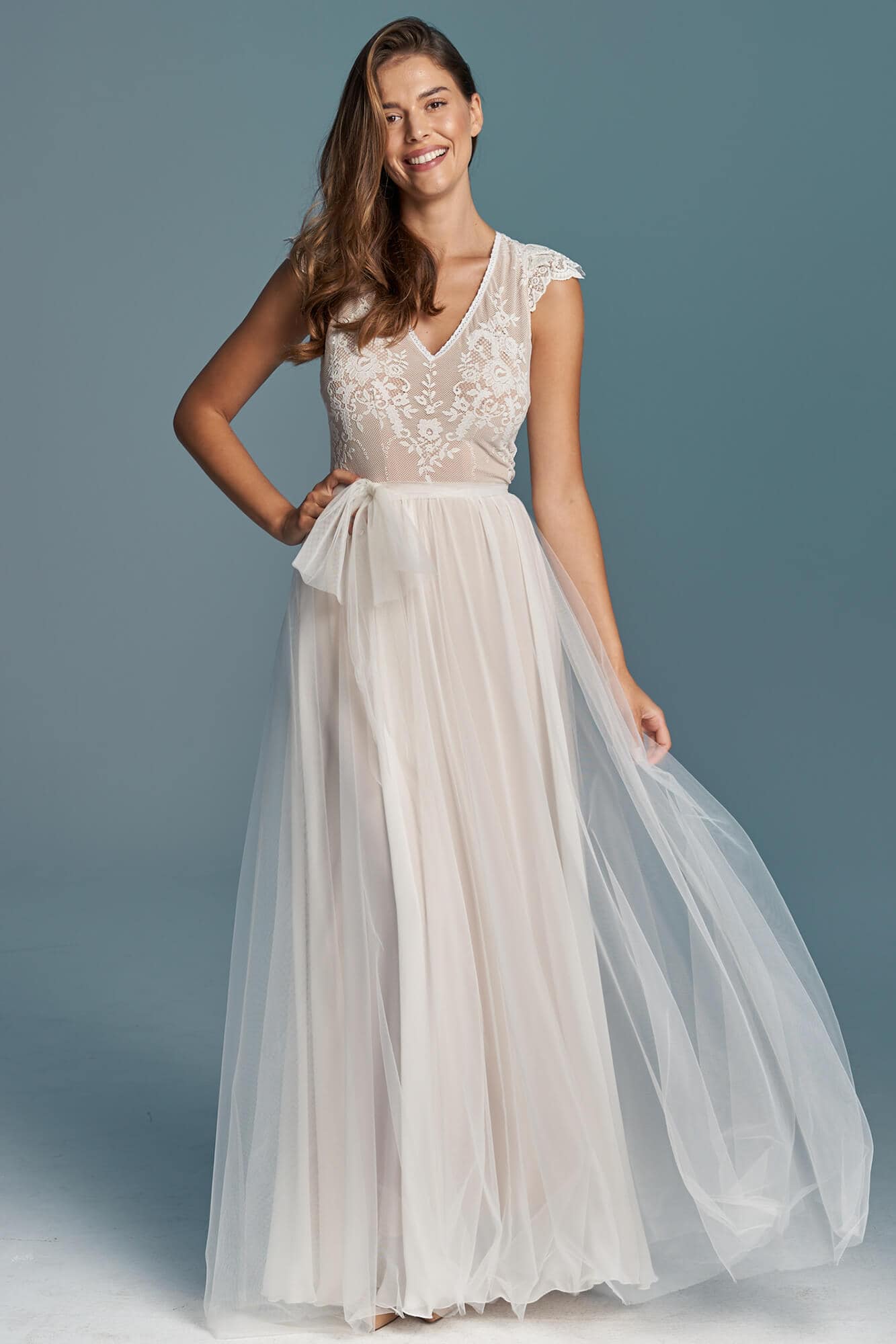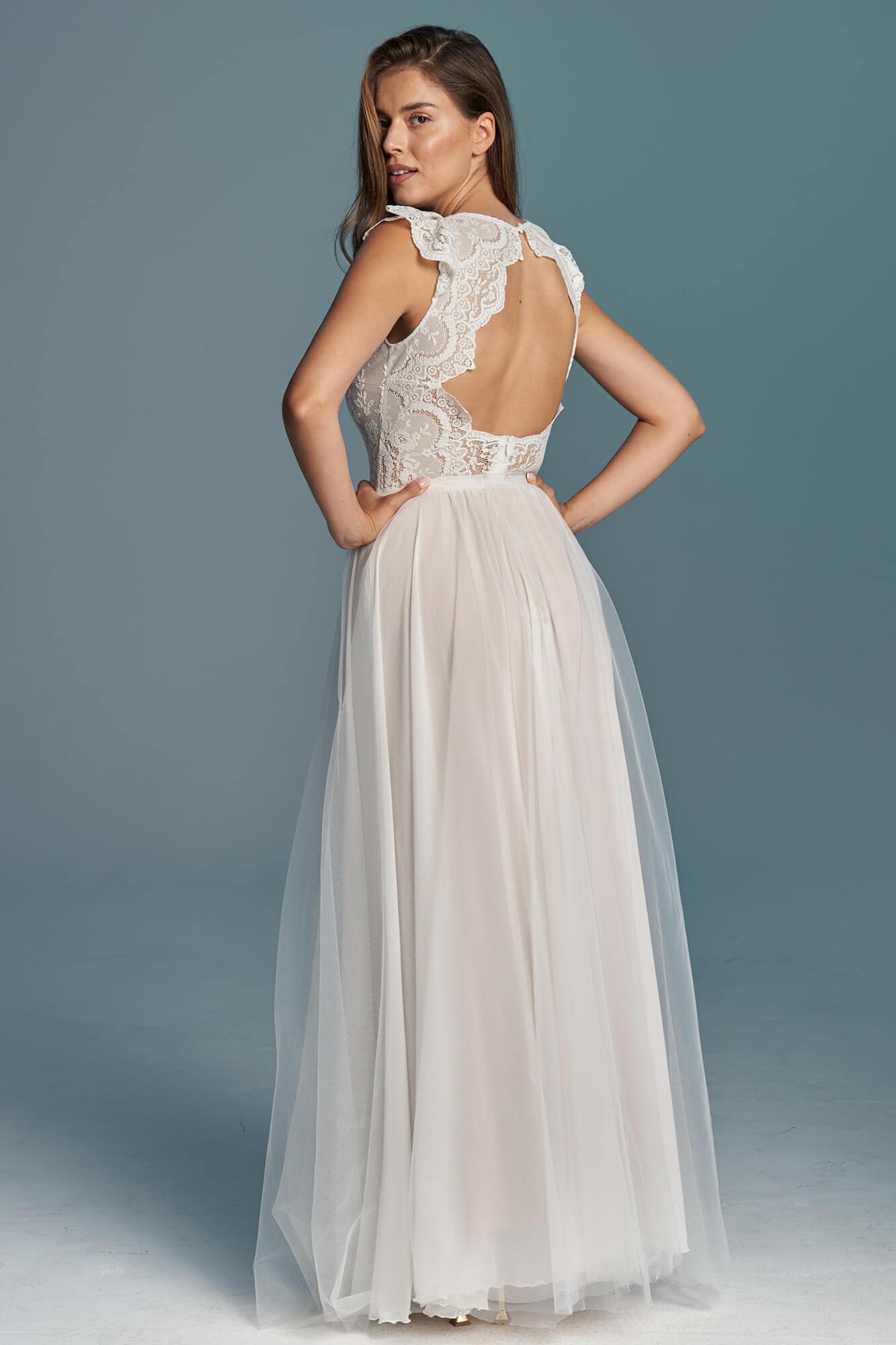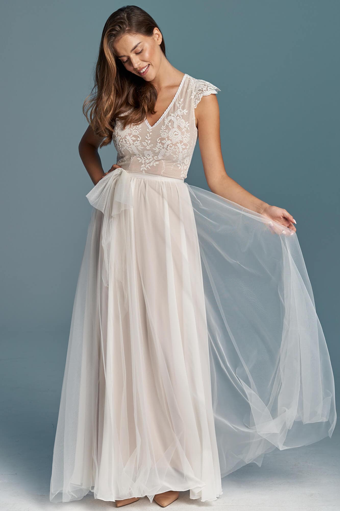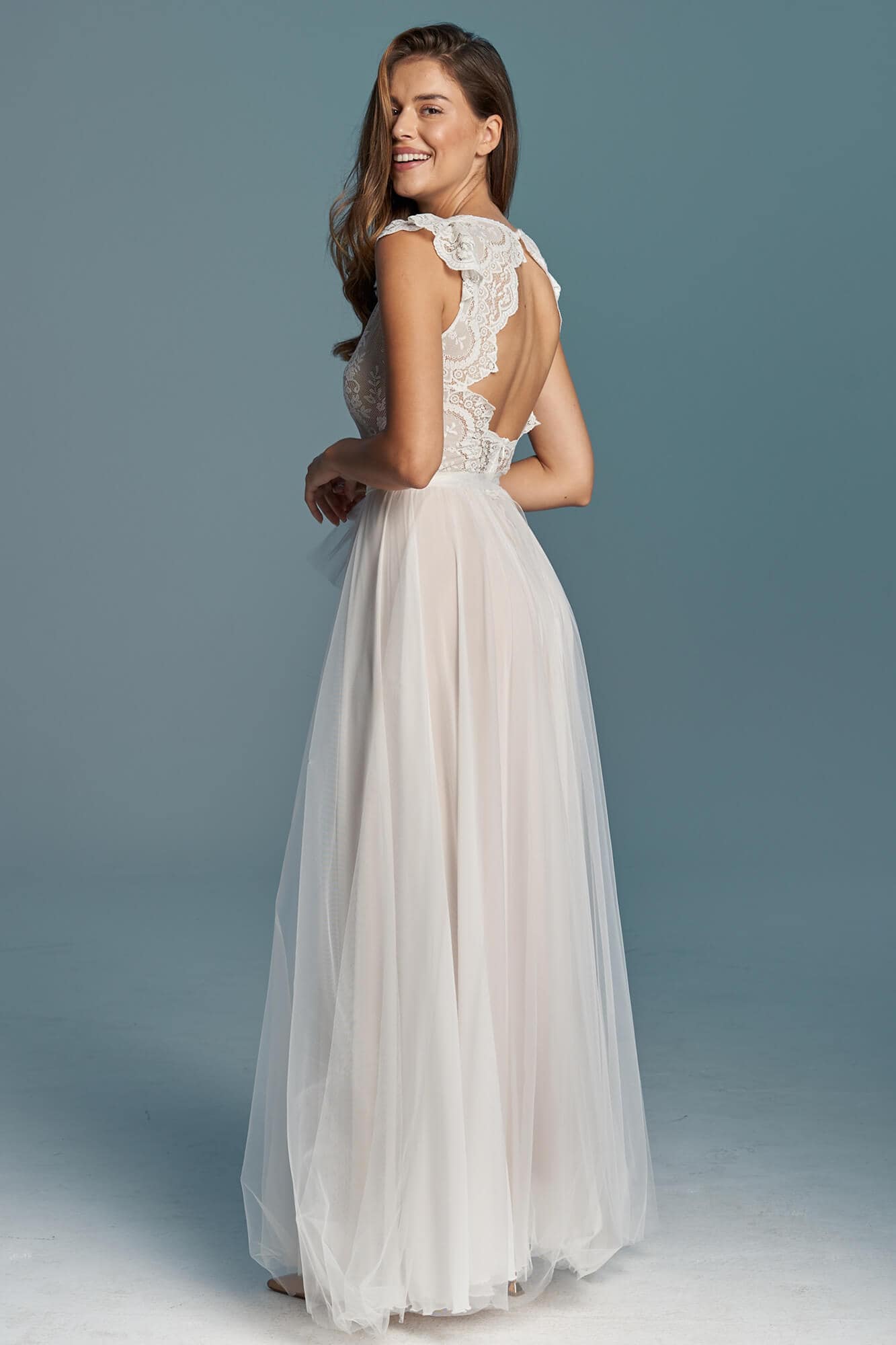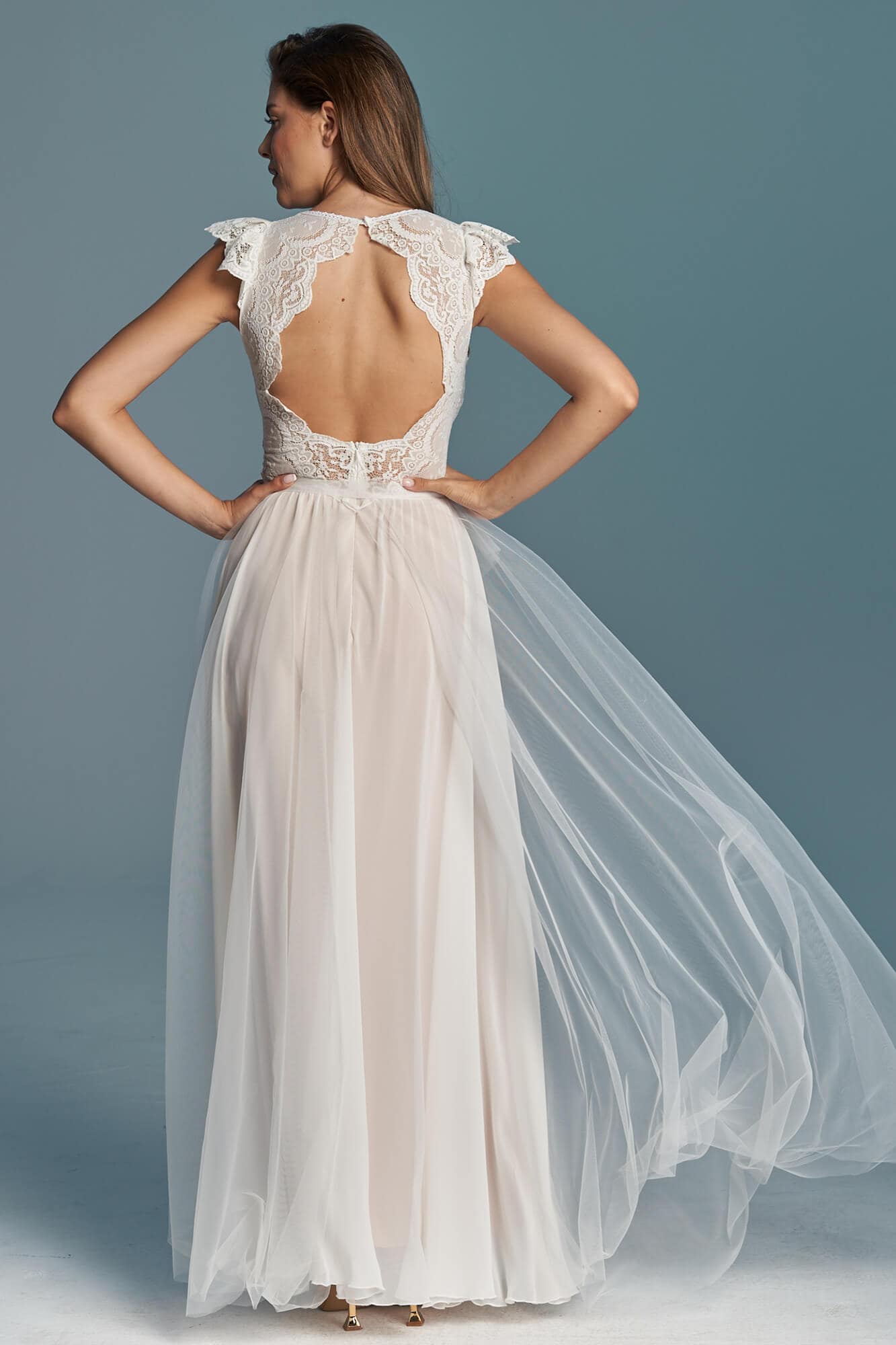 Ta suknia to model wyjściowy - możemy w niej zmienić praktycznie wszystko! Pogłębić lub spłycić dekolt, zmienić jego wykończenie, kształt, dodać lub odjąć falbankę czy frędzle. Rękawy mogą być dłuższe lub krótsze, mieć inny kształt niż te na zdjęciu. Może też nie być ich wcale. Tiul w spódnicy można dodać (lub odjąć) na wierzchu, albo pod spodem. Podszewka może być długa lub krótka w odcieniach bieli i beżu. Rozcięcie na nogę i tren można dodać lub usunąć praktycznie w każdym modelu.