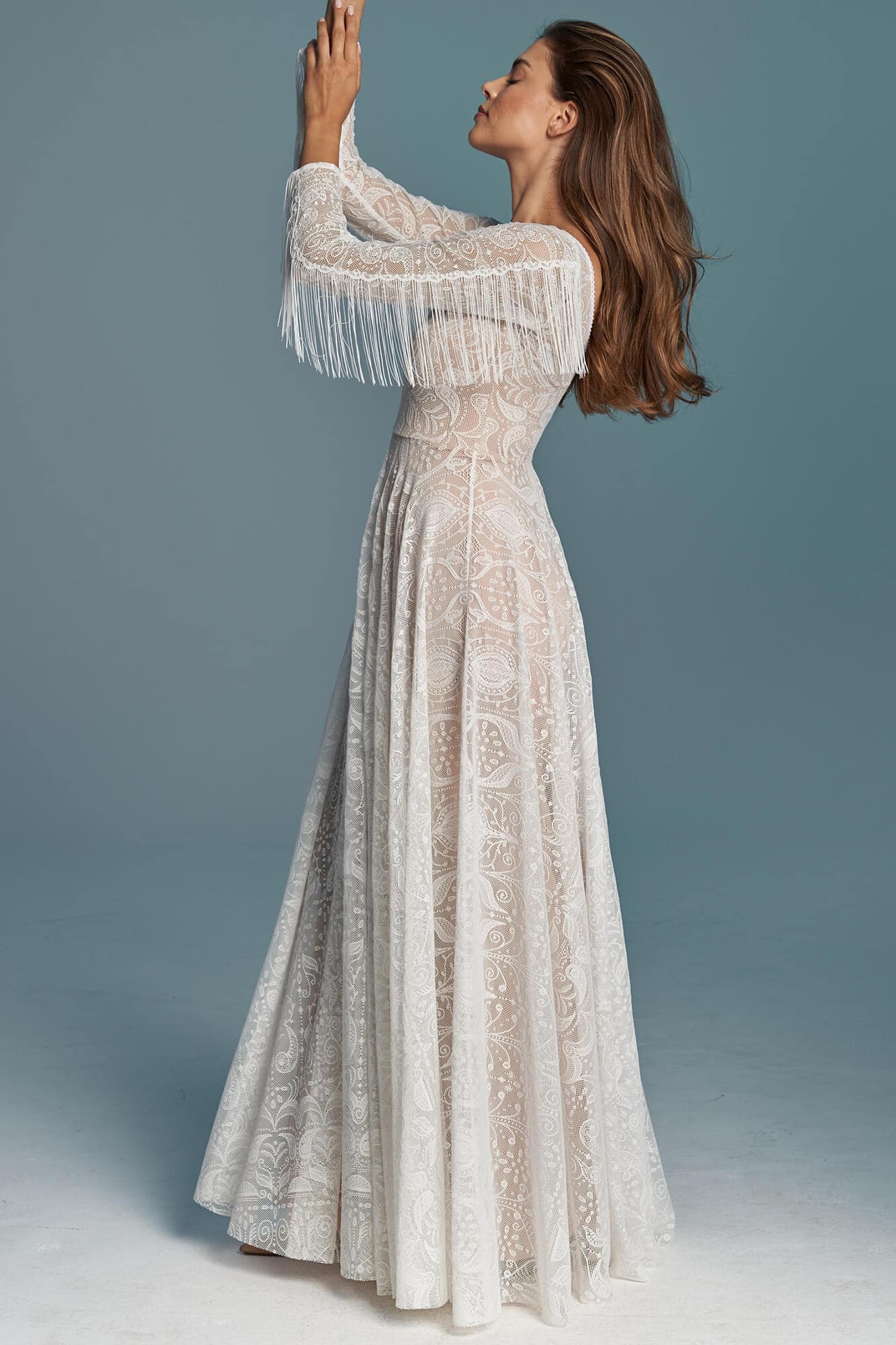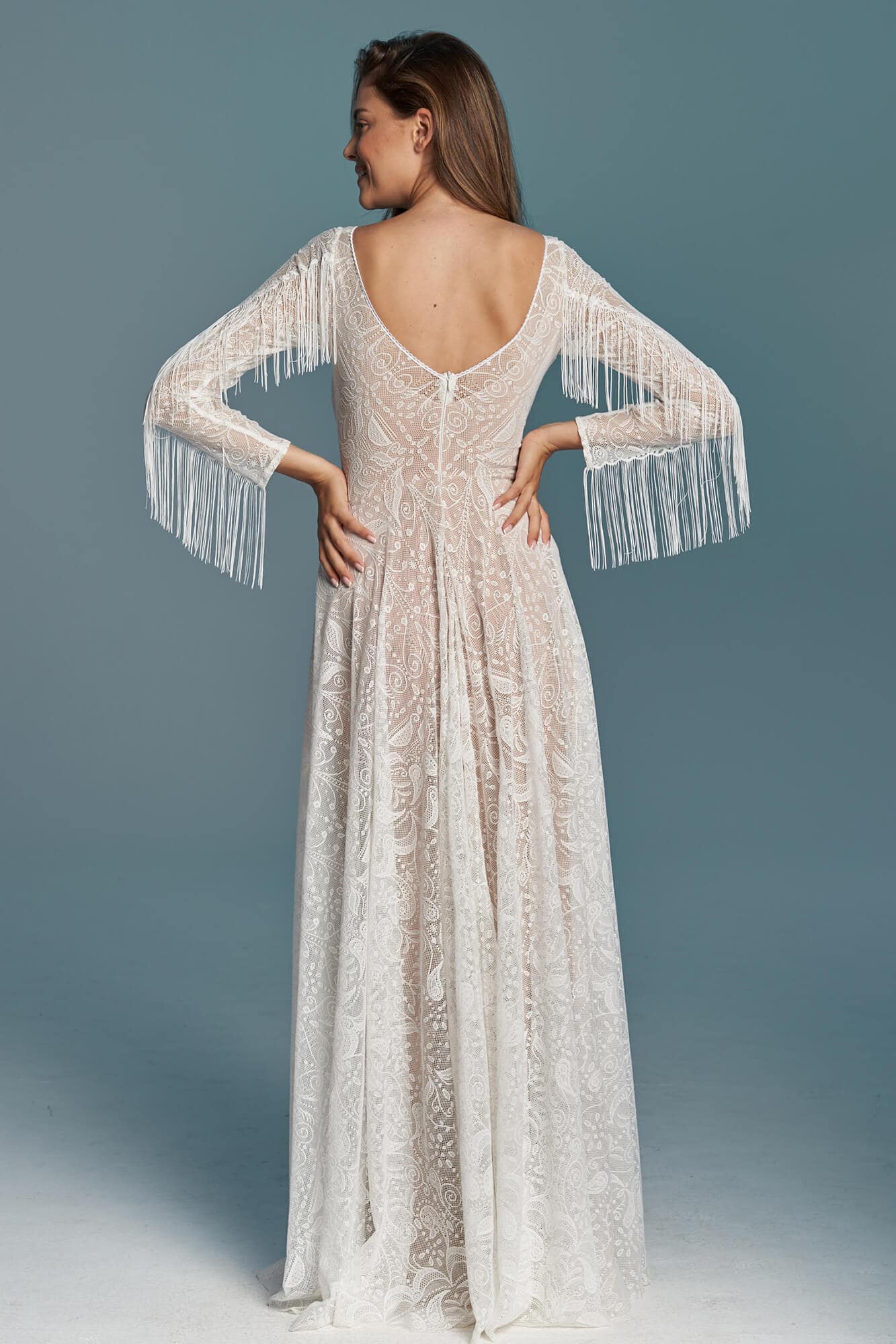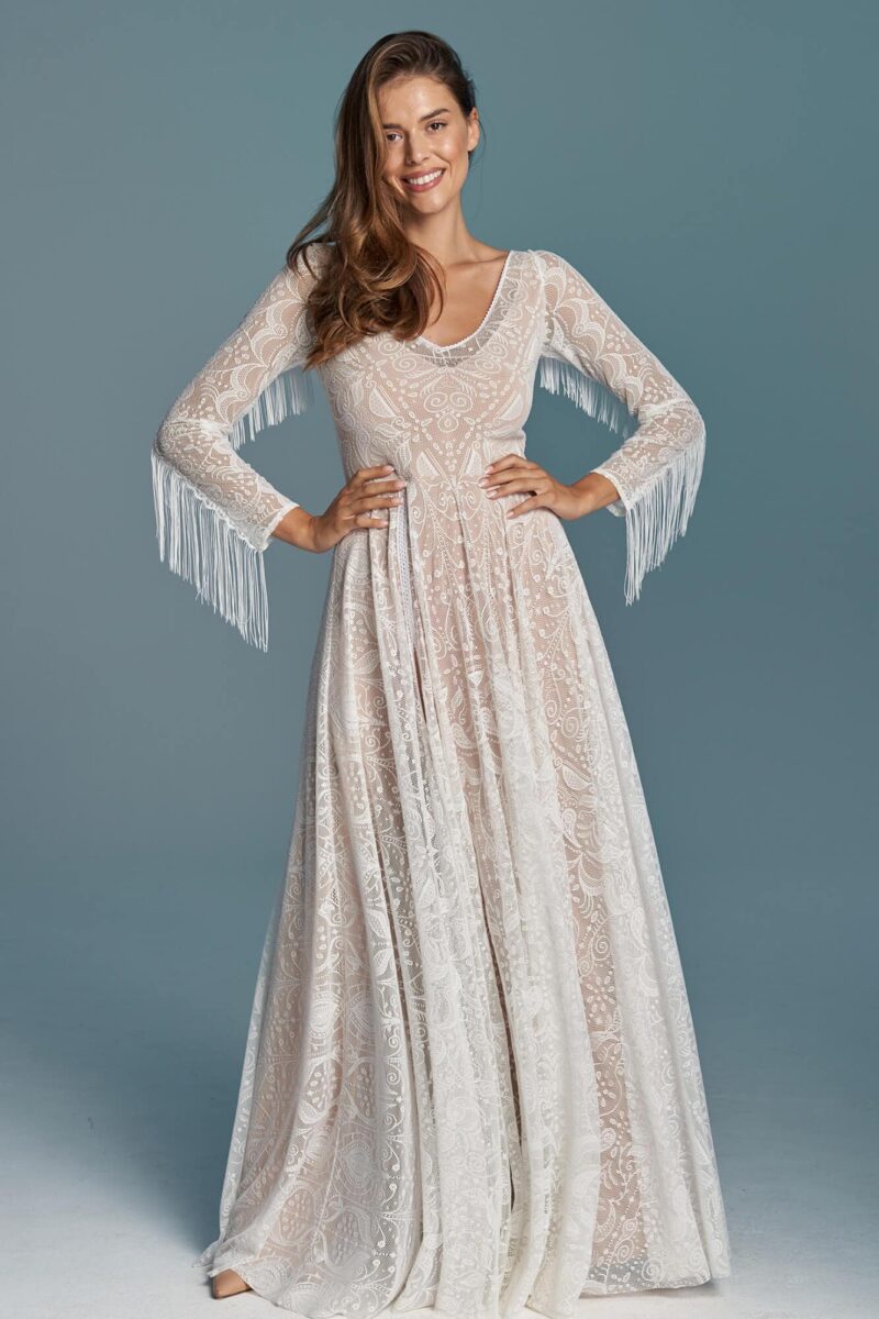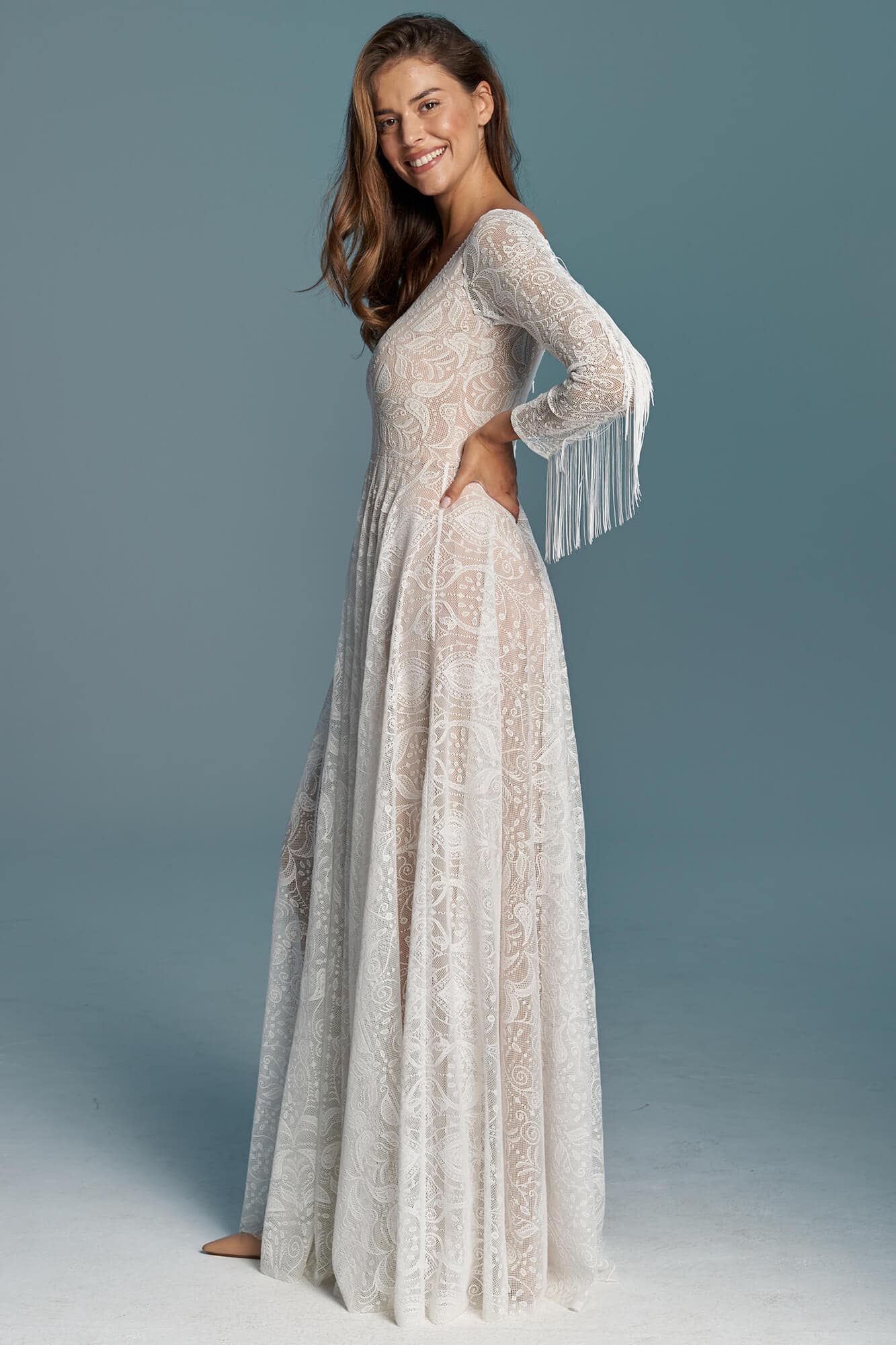 Ta suknia to model wyjściowy - możemy w niej zmienić praktycznie wszystko! Pogłębić lub spłycić dekolt, zmienić jego wykończenie, kształt, dodać lub odjąć falbankę czy frędzle. Rękawy mogą być dłuższe lub krótsze, mieć inny kształt niż te na zdjęciu. Może też nie być ich wcale. Tiul w spódnicy można dodać (lub odjąć) na wierzchu, albo pod spodem. Podszewka może być długa lub krótka w odcieniach bieli i beżu. Rozcięcie na nogę i tren można dodać lub usunąć praktycznie w każdym modelu.