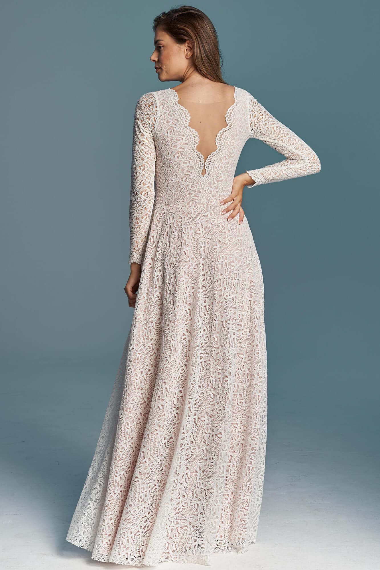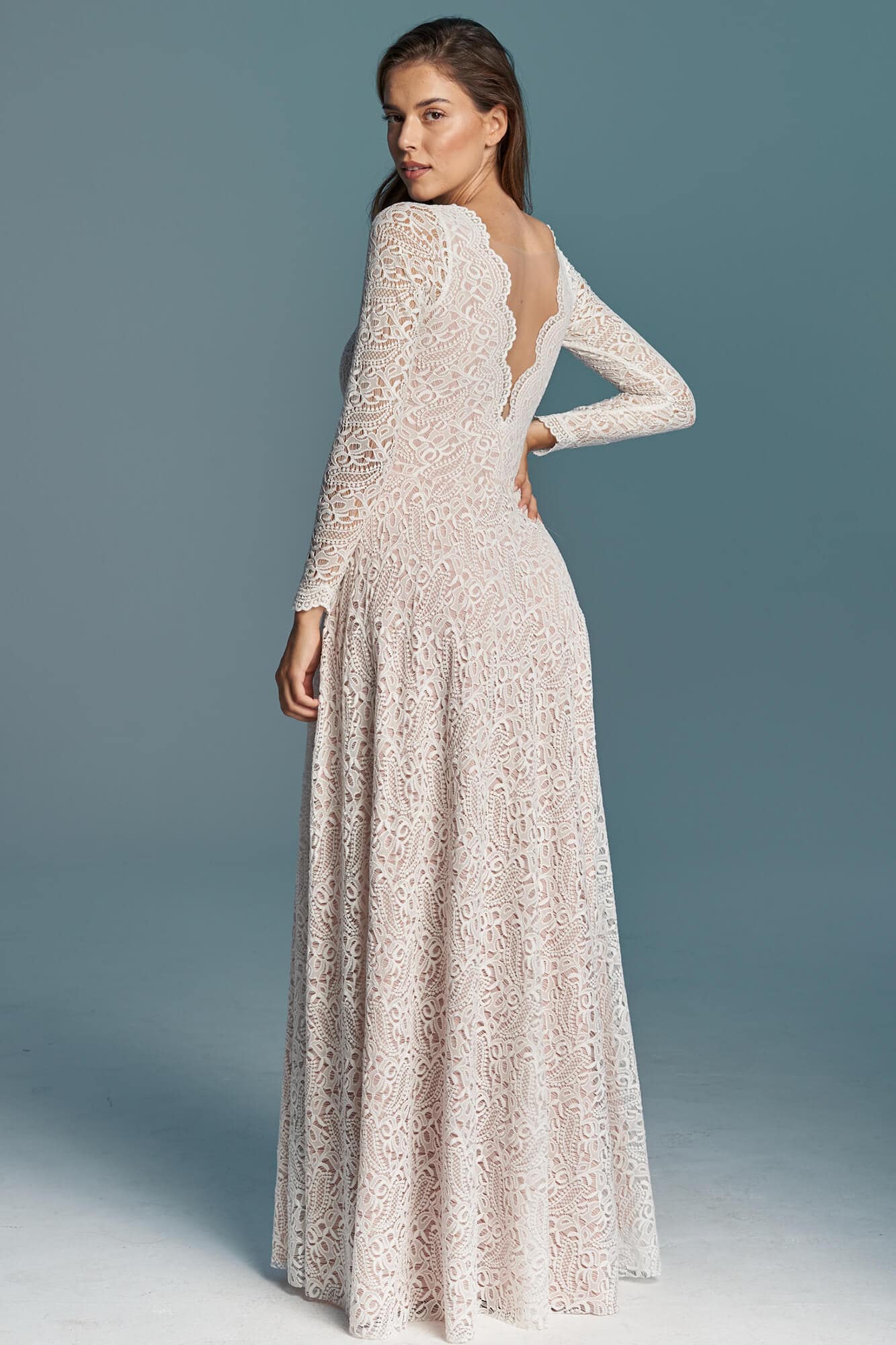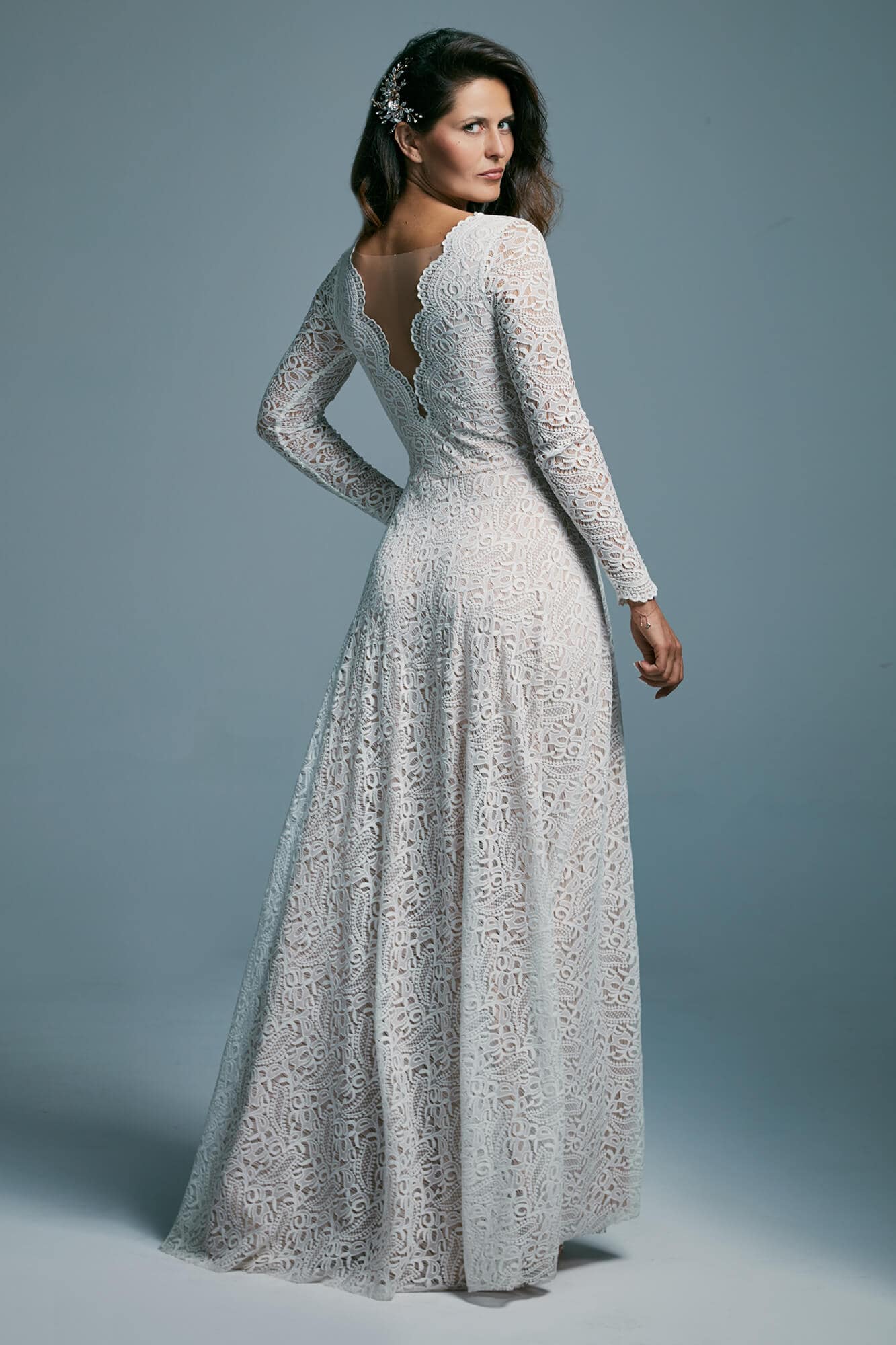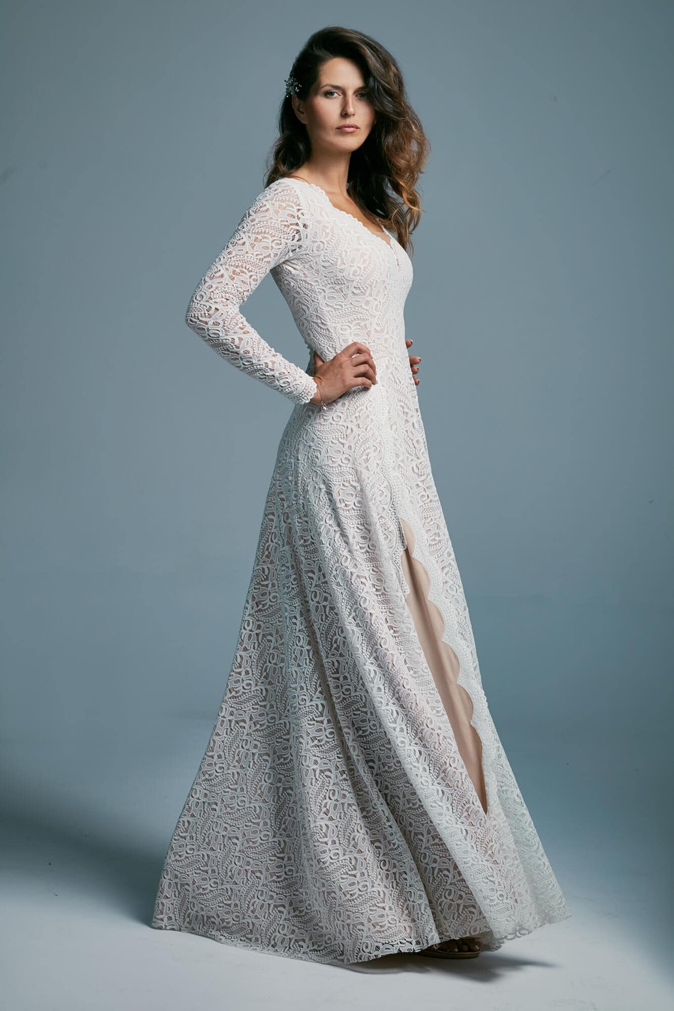 Ta suknia to model wyjściowy - możemy w niej zmienić praktycznie wszystko! Pogłębić lub spłycić dekolt, zmienić jego wykończenie, kształt, dodać lub odjąć falbankę czy frędzle. Rękawy mogą być dłuższe lub krótsze, mieć inny kształt niż te na zdjęciu. Może też nie być ich wcale. Tiul w spódnicy można dodać (lub odjąć) na wierzchu, albo pod spodem. Podszewka może być długa lub krótka w odcieniach bieli i beżu. Rozcięcie na nogę i tren można dodać lub usunąć praktycznie w każdym modelu.
