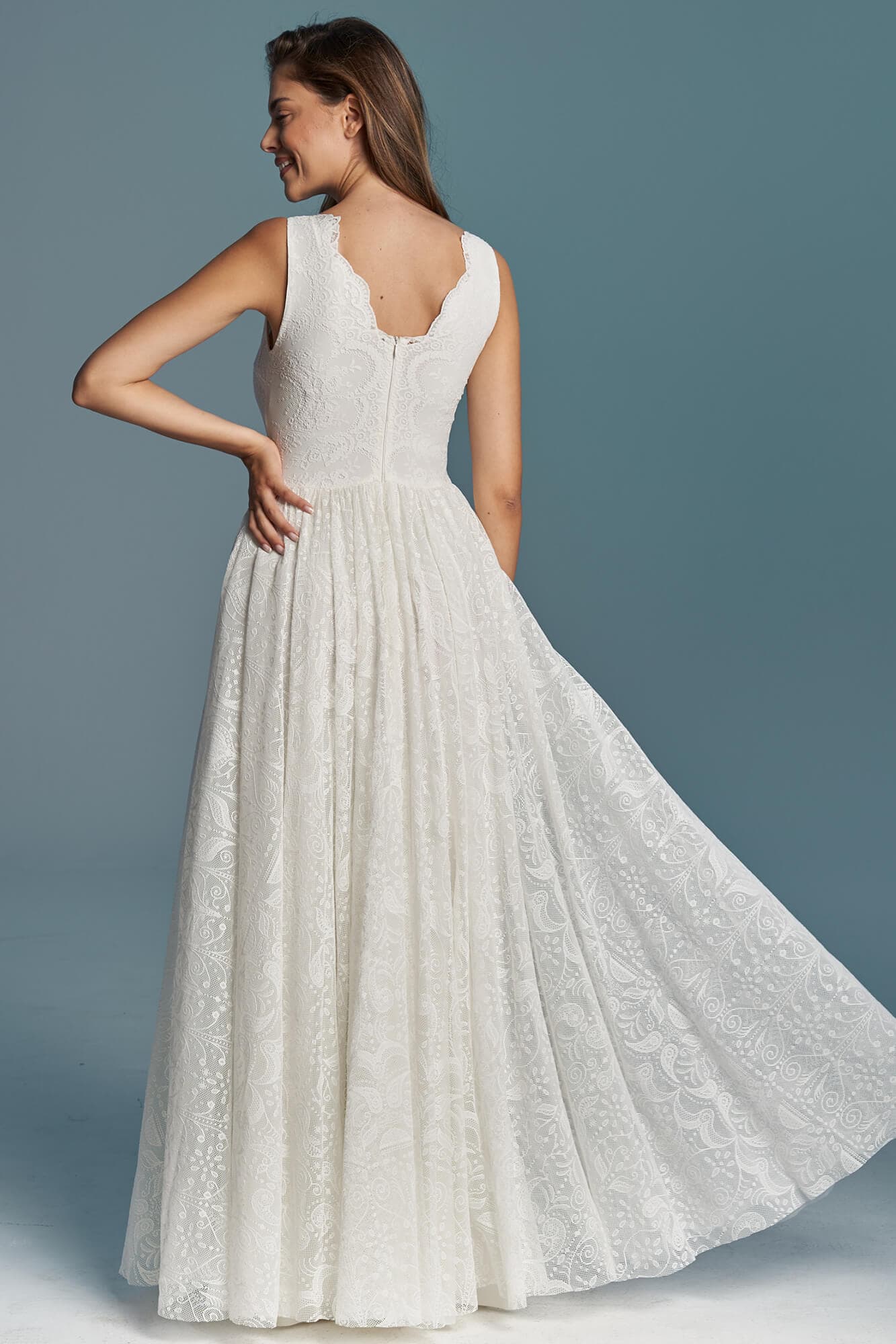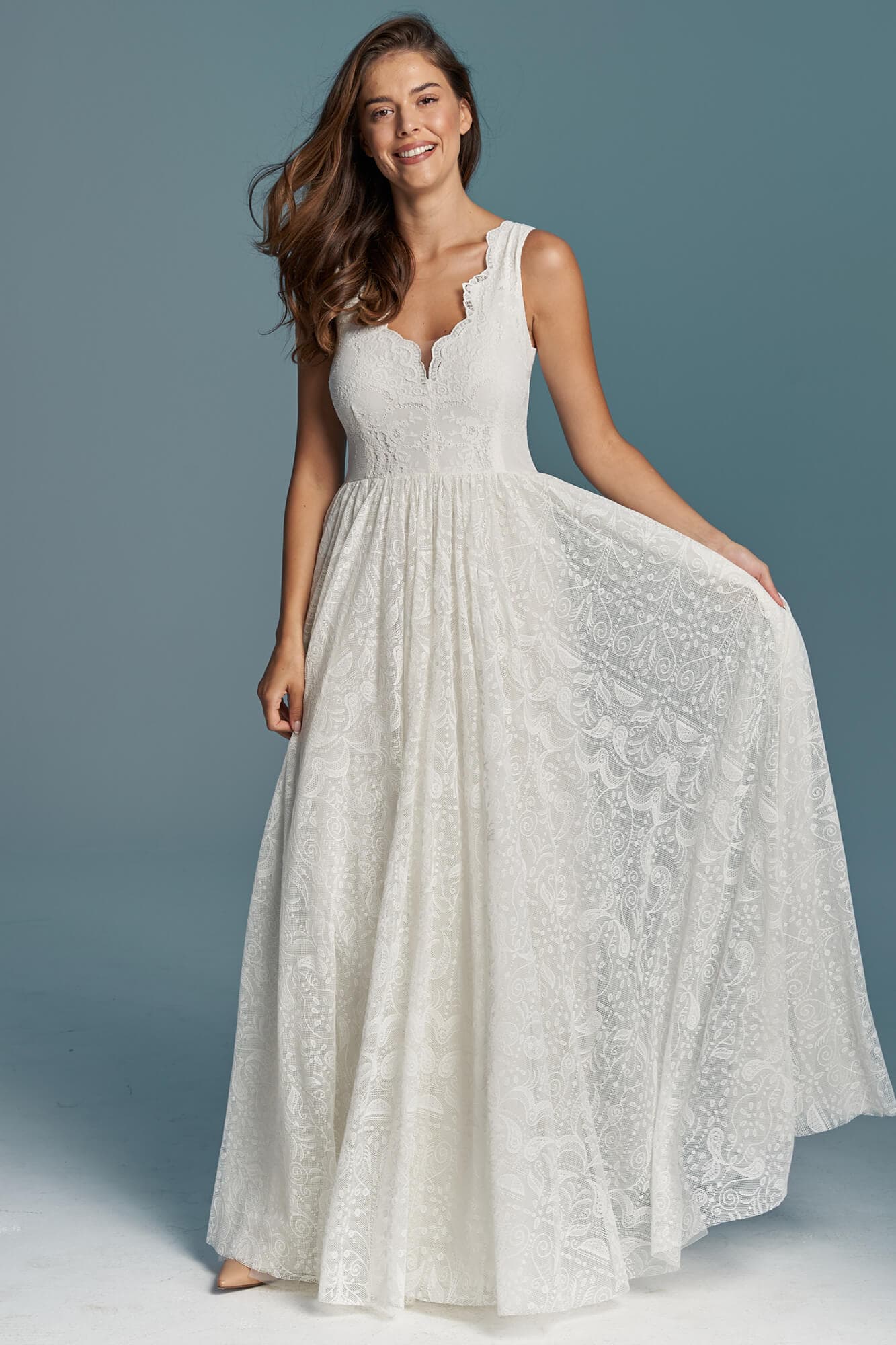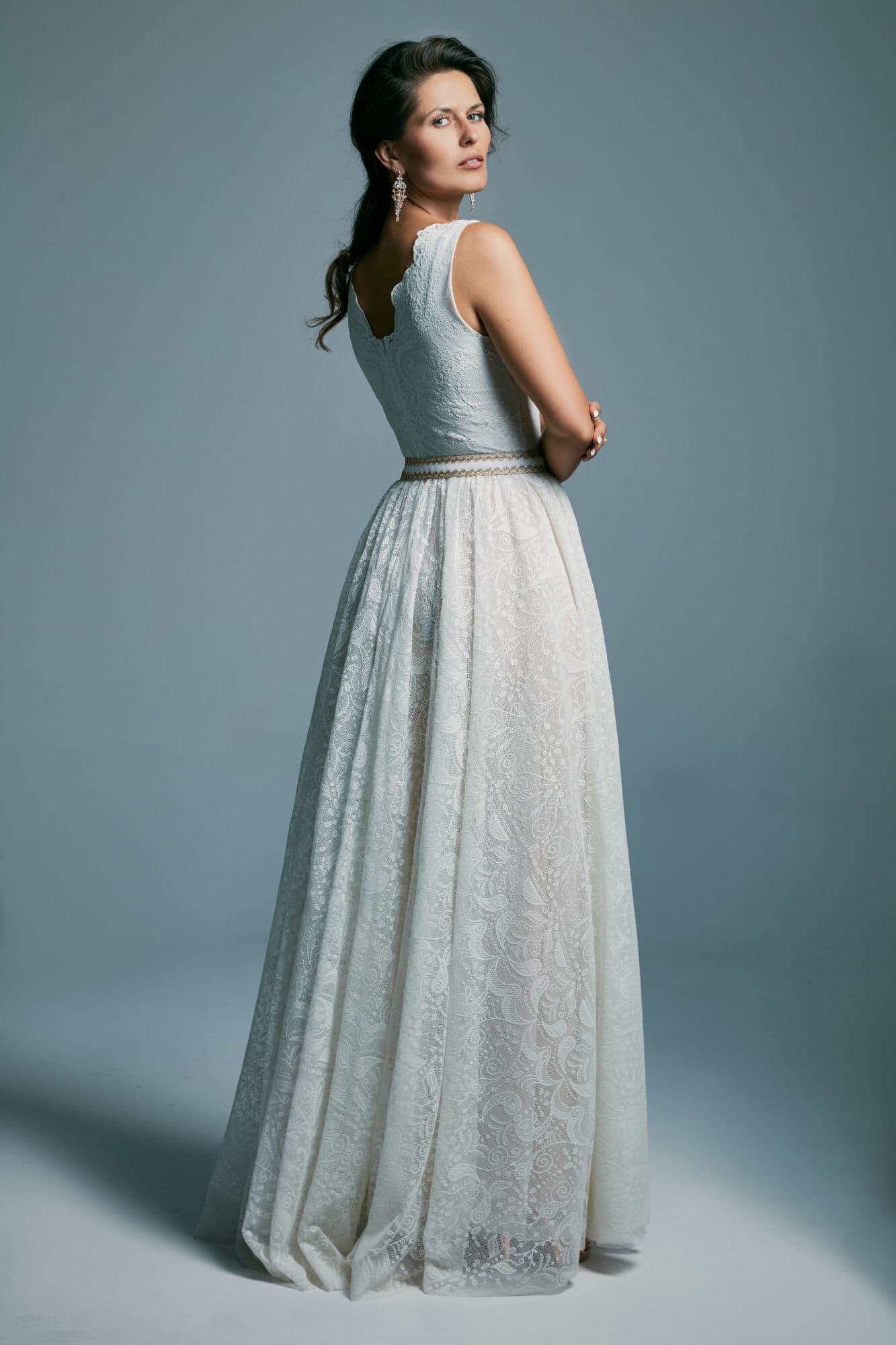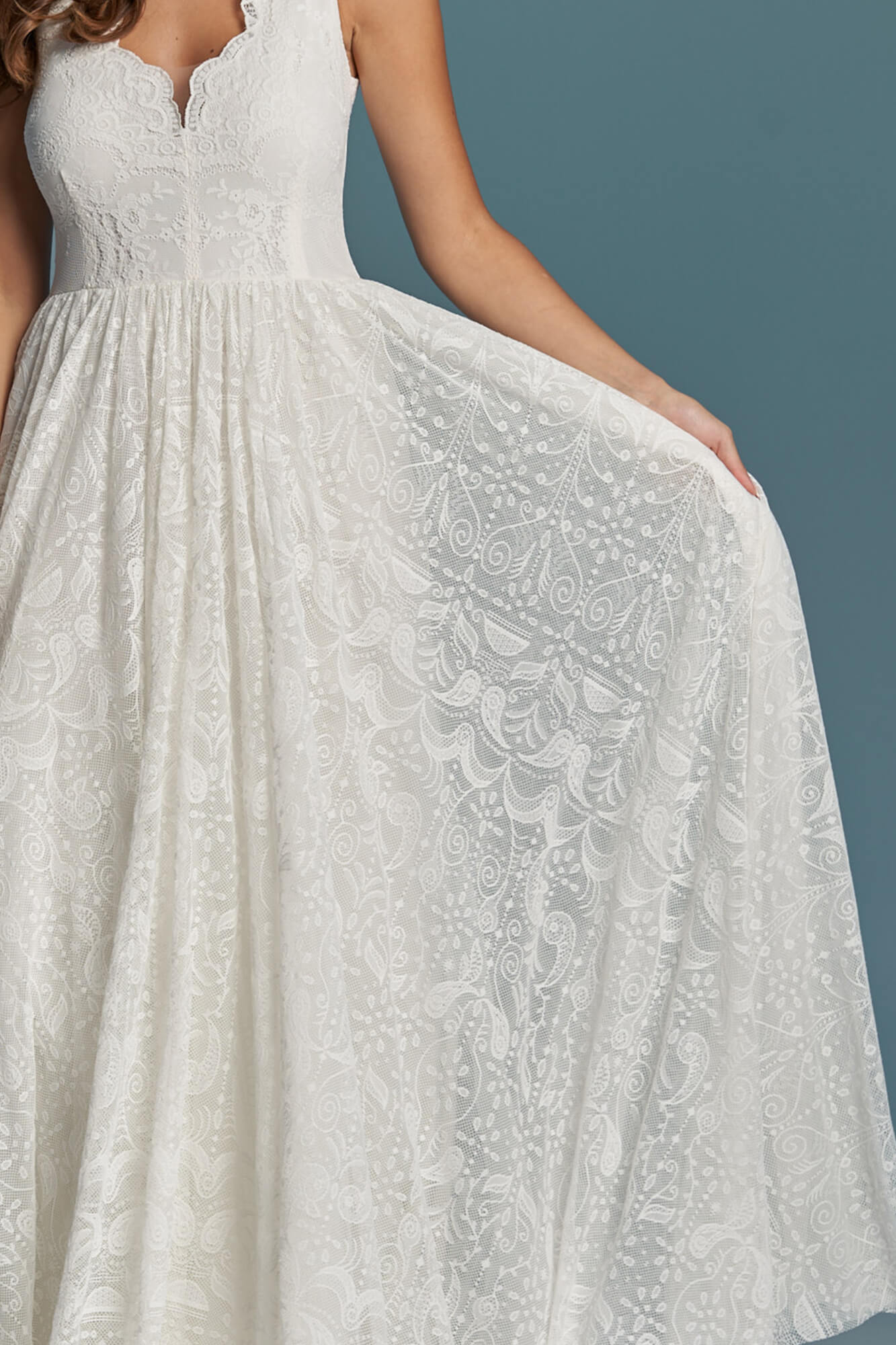 Uszyta ze sprawdzonych i przetestowanych przez nas materiałów. Używane przez nas koronki są mięciutkie, a dzięki swej lekkości cudownie układają się na sylwetce i pięknie wirują w tańcu. Ich elastyczność sprawia, że pracują z Twoim ciałem. Zapewniają komfort rosnącemu ciążowemu brzuszkowi. Praktycznie wszystkie nasze koronki są łatwe do prania w domowej pralce i niegniotące, dzięki czemu swoją suknię spokojnie możesz spakować do walizki i zabrać na romantyczną sesję poślubną.