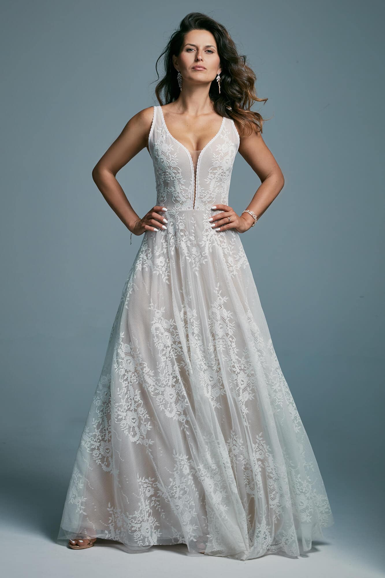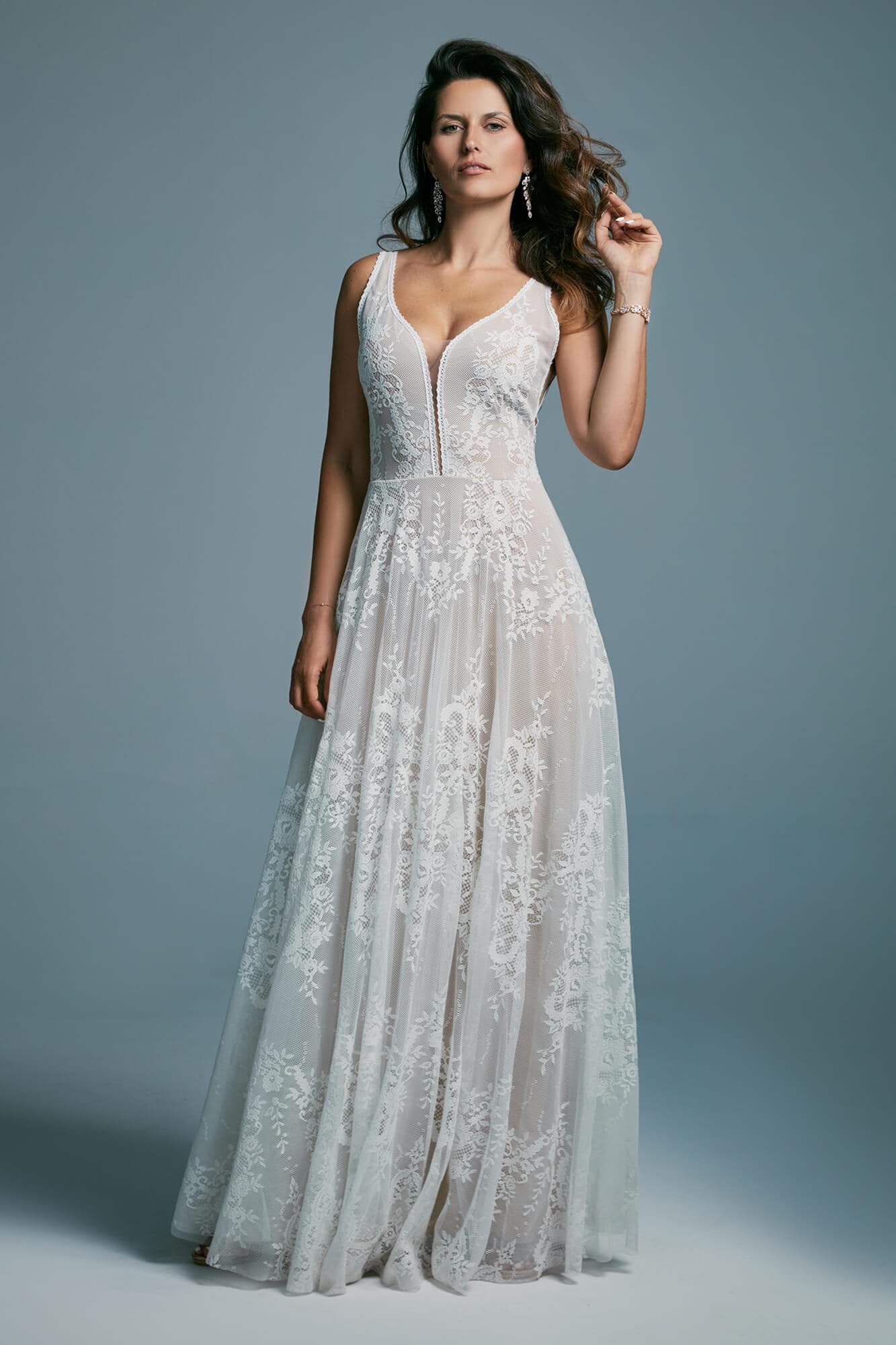 Ta suknia to model wyjściowy - możemy w niej zmienić praktycznie wszystko! Pogłębić lub spłycić dekolt, zmienić jego wykończenie, kształt, dodać lub odjąć falbankę czy frędzle. Rękawy mogą być dłuższe lub krótsze, mieć inny kształt niż te na zdjęciu. Może też nie być ich wcale. Tiul w spódnicy można dodać (lub odjąć) na wierzchu, albo pod spodem. Podszewka może być długa lub krótka w odcieniach bieli i beżu. Rozcięcie na nogę i tren można dodać lub usunąć praktycznie w każdym modelu.