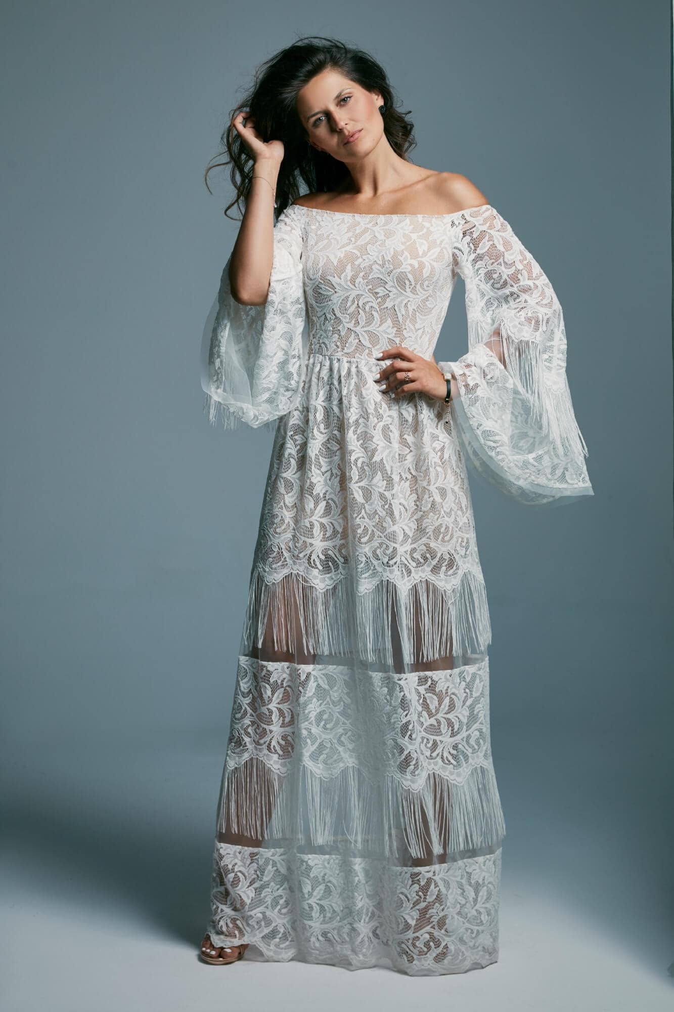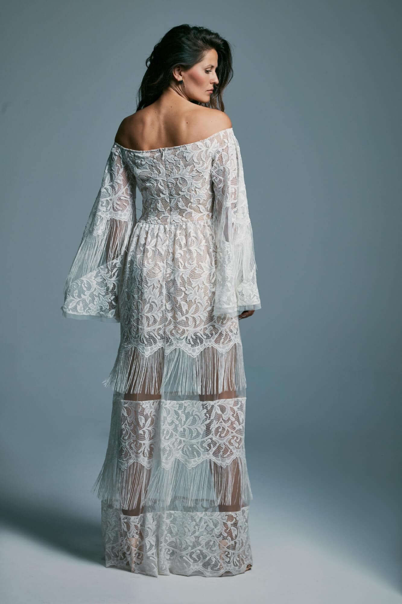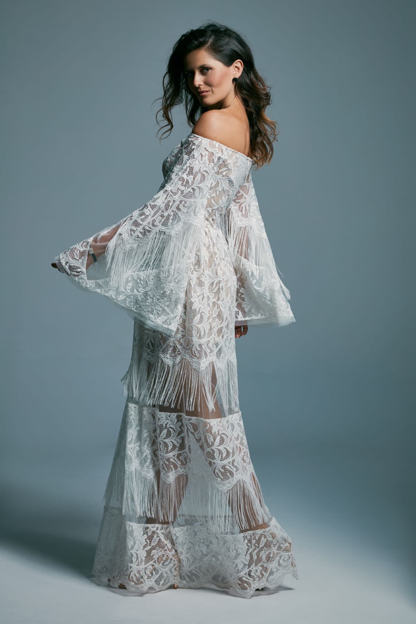 Ta suknia to model wyjściowy - możemy w niej zmienić praktycznie wszystko! Pogłębić lub spłycić dekolt, zmienić jego wykończenie, kształt, dodać lub odjąć falbankę czy frędzle. Rękawy mogą być dłuższe lub krótsze, mieć inny kształt niż te na zdjęciu. Może też nie być ich wcale. Tiul w spódnicy można dodać (lub odjąć) na wierzchu, albo pod spodem. Podszewka może być długa lub krótka w odcieniach bieli i beżu. Rozcięcie na nogę i tren można dodać lub usunąć praktycznie w każdym modelu.