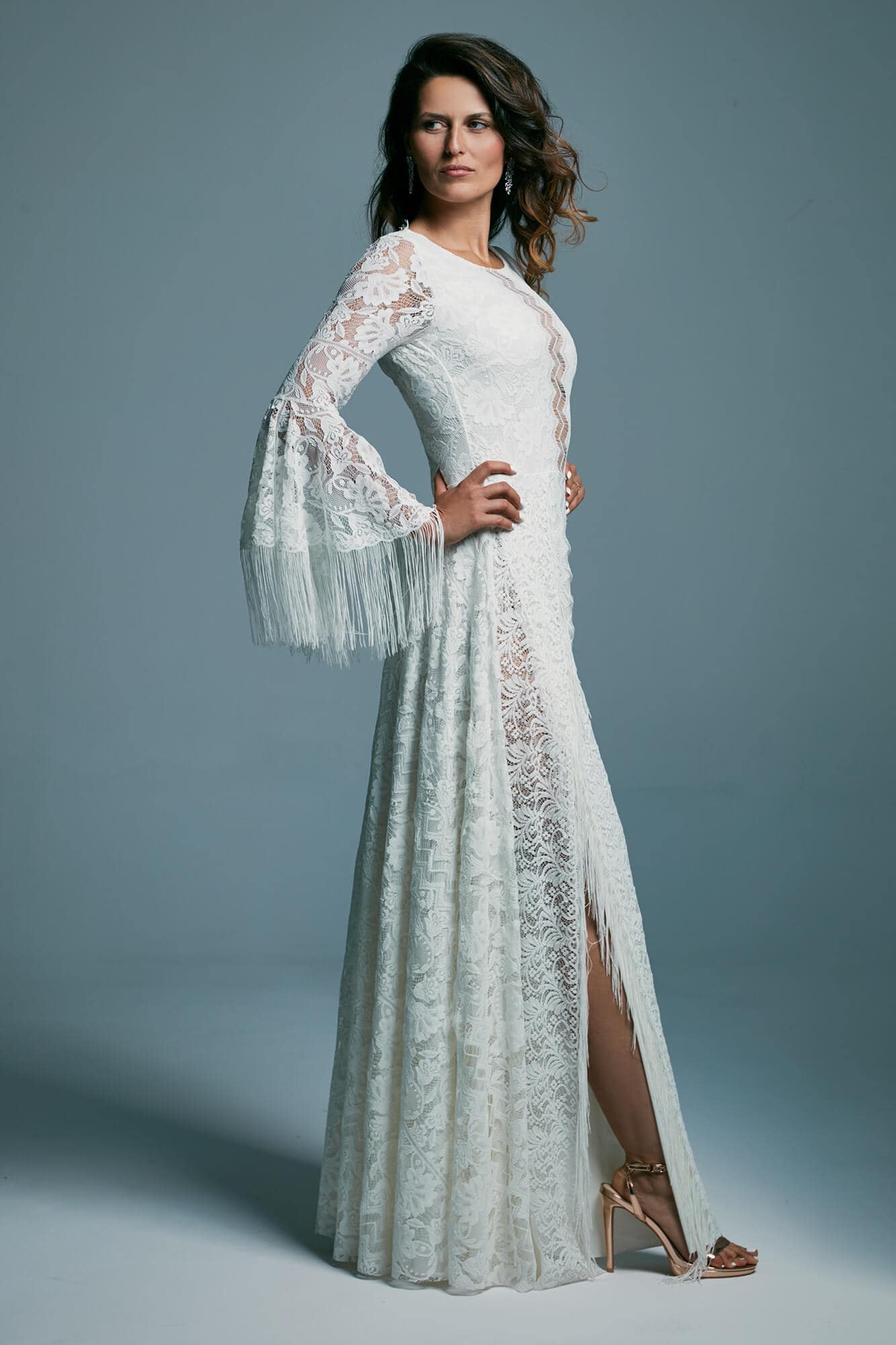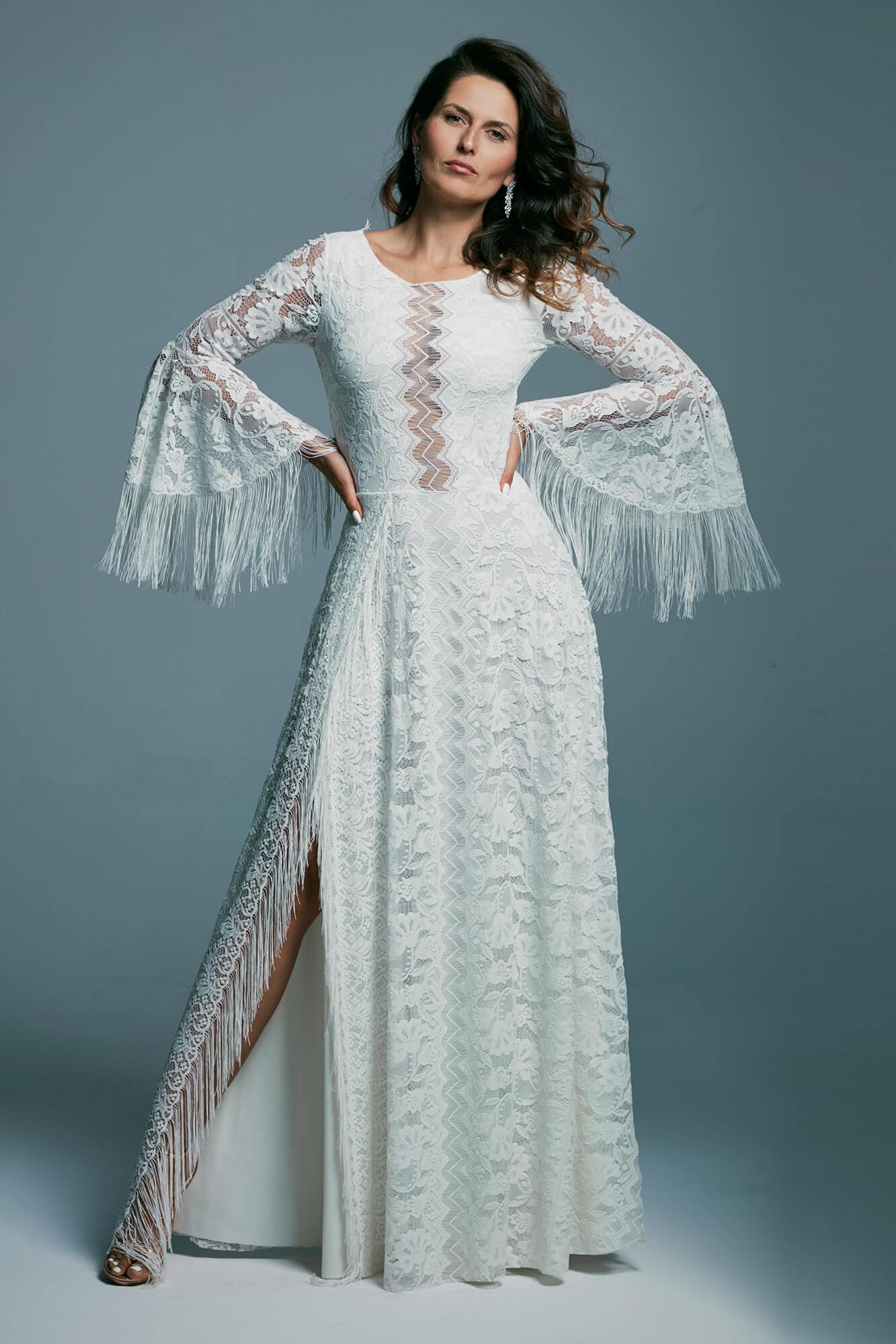 Ta suknia to model wyjściowy - możemy w niej zmienić praktycznie wszystko! Pogłębić lub spłycić dekolt, zmienić jego wykończenie, kształt, dodać lub odjąć falbankę czy frędzle. Rękawy mogą być dłuższe lub krótsze, mieć inny kształt niż te na zdjęciu. Może też nie być ich wcale. Tiul w spódnicy można dodać (lub odjąć) na wierzchu, albo pod spodem. Podszewka może być długa lub krótka w odcieniach bieli i beżu. Rozcięcie na nogę i tren można dodać lub usunąć praktycznie w każdym modelu.