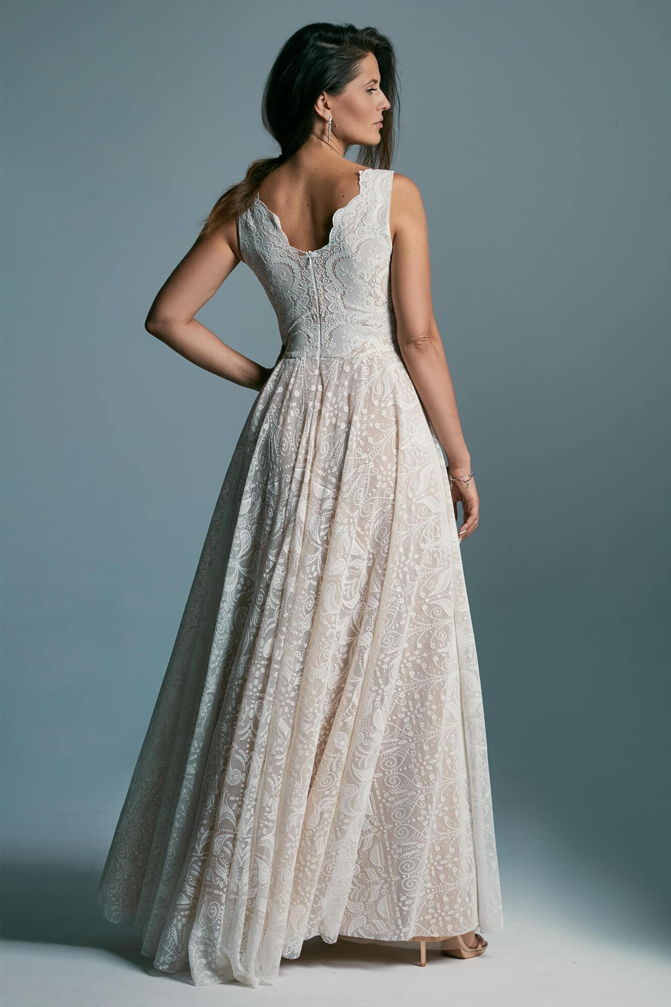 Ta suknia to model wyjściowy - możemy w niej zmienić praktycznie wszystko! Pogłębić lub spłycić dekolt, zmienić jego wykończenie, kształt, dodać lub odjąć falbankę czy frędzle. Rękawy mogą być dłuższe lub krótsze, mieć inny kształt niż te na zdjęciu. Może też nie być ich wcale. Tiul w spódnicy można dodać (lub odjąć) na wierzchu, albo pod spodem. Podszewka może być długa lub krótka w odcieniach bieli i beżu. Rozcięcie na nogę i tren można dodać lub usunąć praktycznie w każdym modelu.