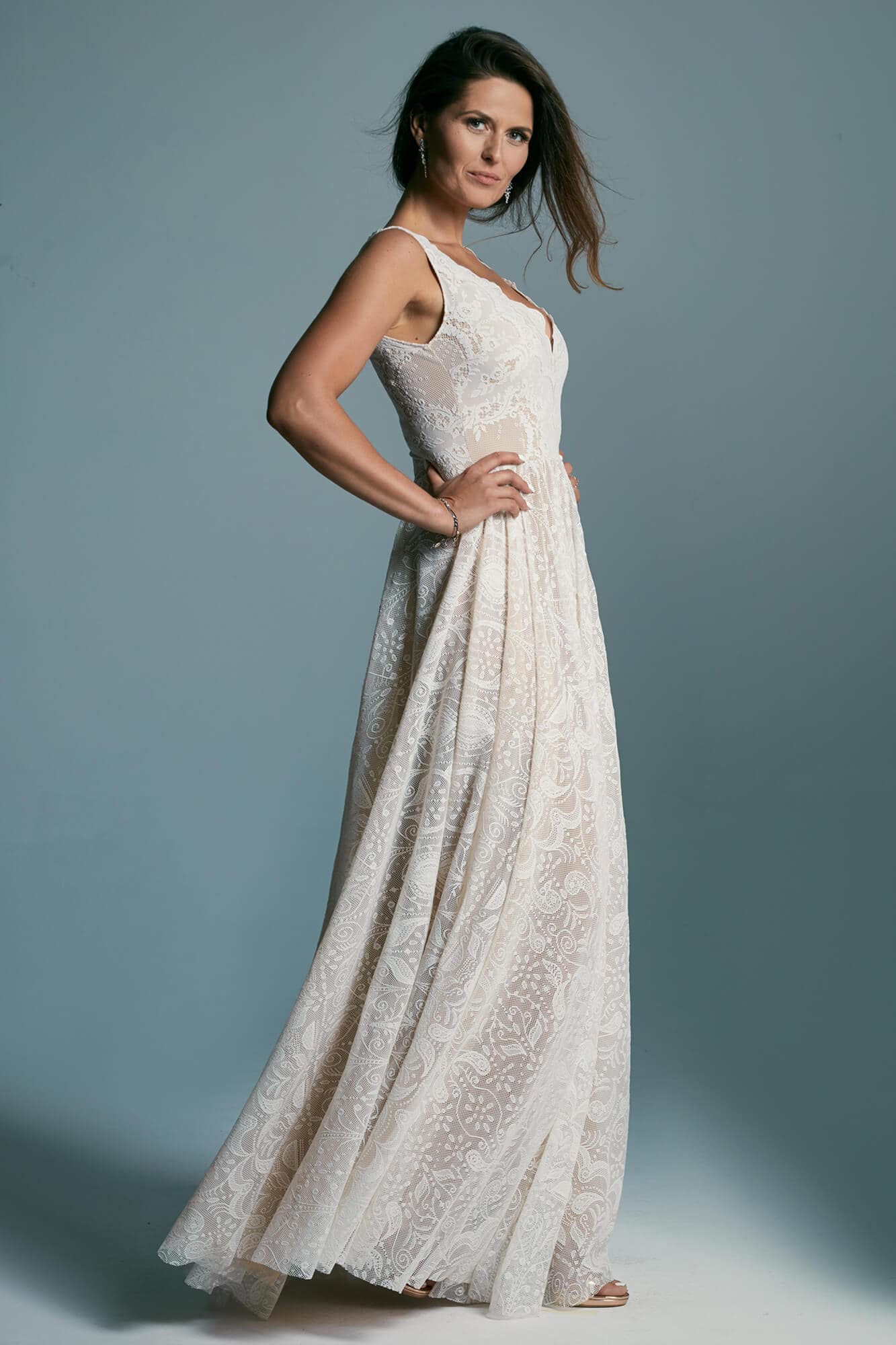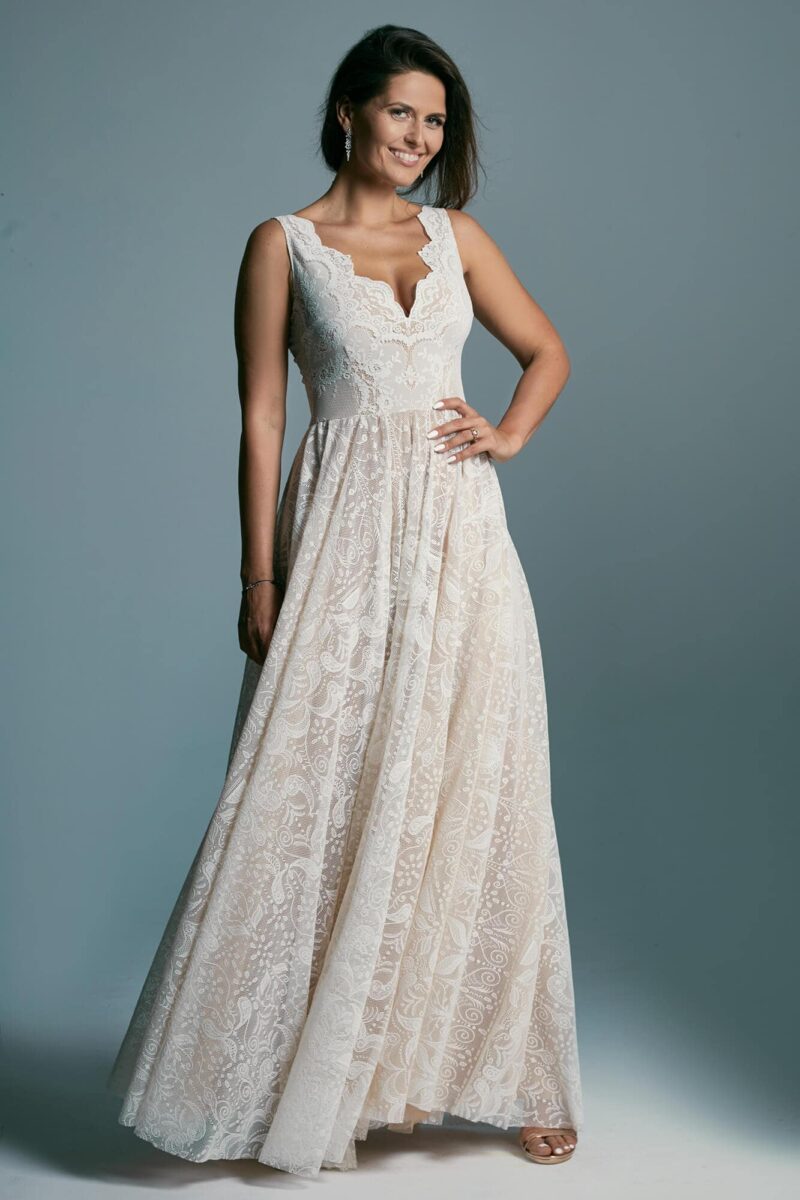 Uszyta ze sprawdzonych i przetestowanych przez nas materiałów. Używane przez nas koronki są mięciutkie, a dzięki swej lekkości cudownie układają się na sylwetce i pięknie wirują w tańcu. Ich elastyczność sprawia, że pracują z Twoim ciałem. Zapewniają komfort rosnącemu ciążowemu brzuszkowi. Praktycznie wszystkie nasze koronki są łatwe do prania w domowej pralce i niegniotące, dzięki czemu swoją suknię spokojnie możesz spakować do walizki i zabrać na romantyczną sesję poślubną.