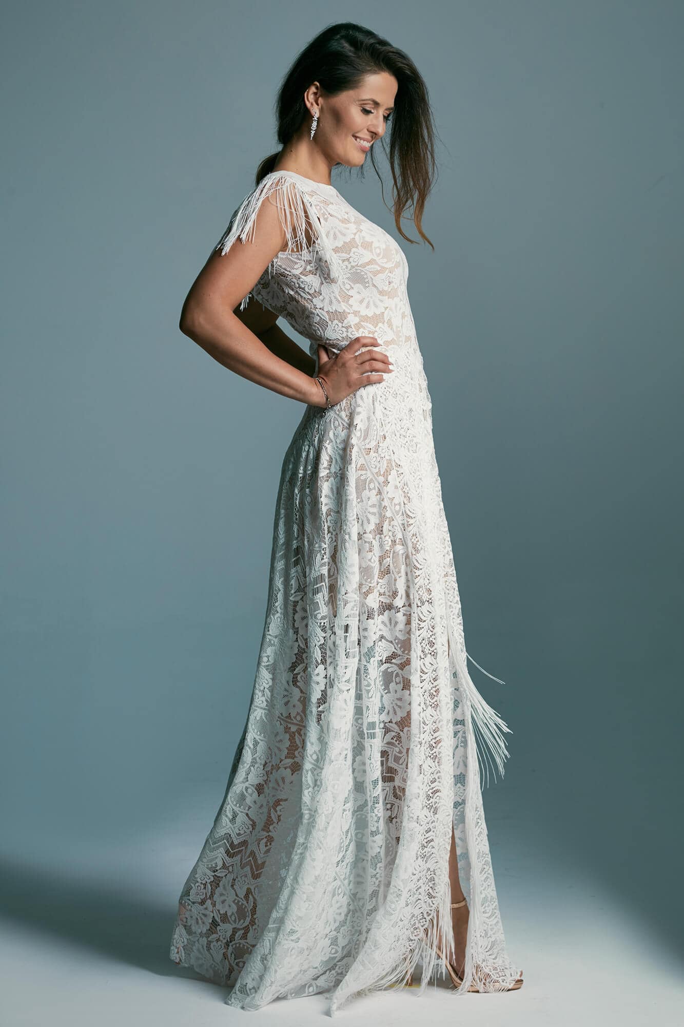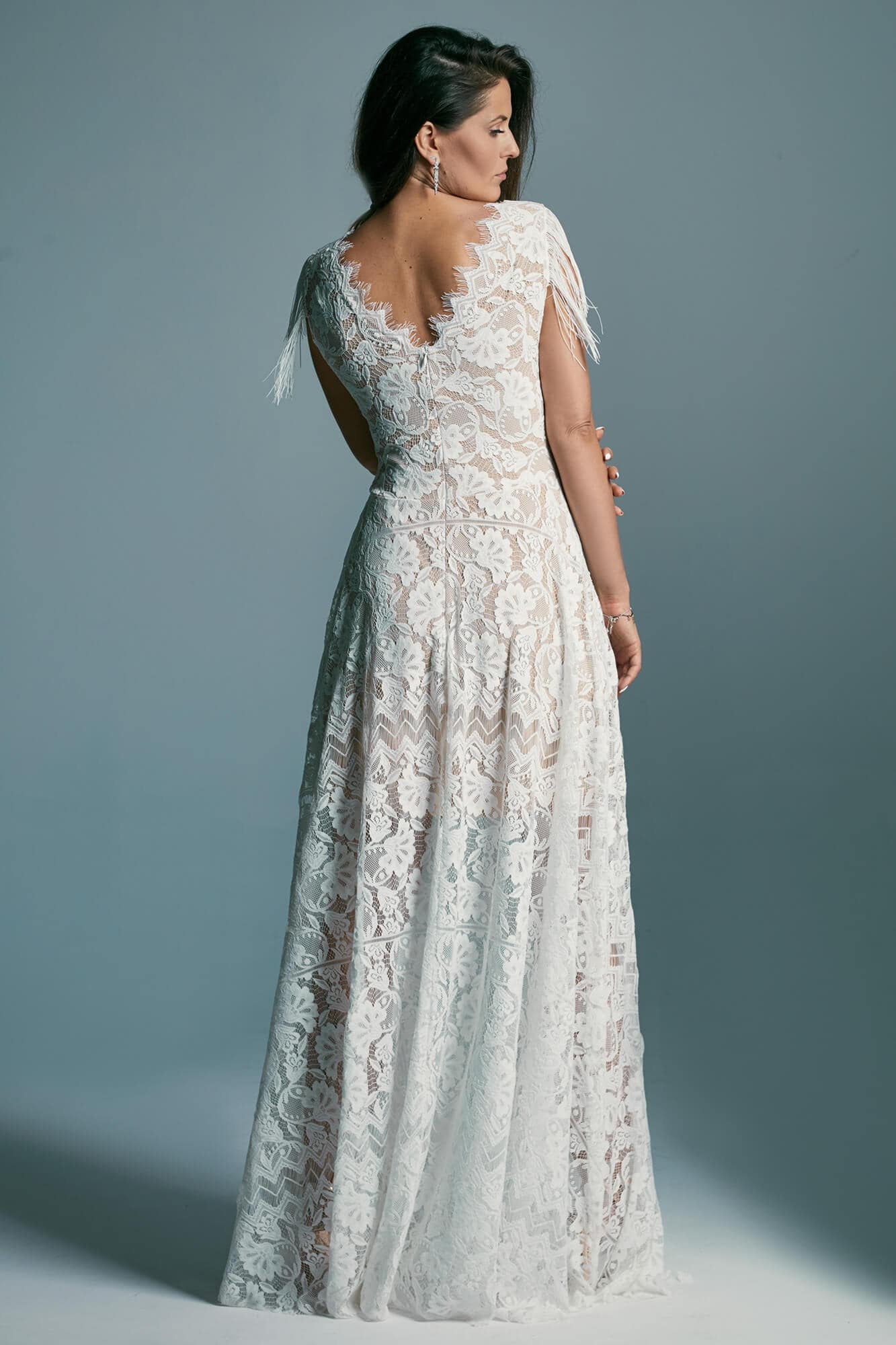 Ta suknia to model wyjściowy - możemy w niej zmienić praktycznie wszystko! Pogłębić lub spłycić dekolt, zmienić jego wykończenie, kształt, dodać lub odjąć falbankę czy frędzle. Rękawy mogą być dłuższe lub krótsze, mieć inny kształt niż te na zdjęciu. Może też nie być ich wcale. Tiul w spódnicy można dodać (lub odjąć) na wierzchu, albo pod spodem. Podszewka może być długa lub krótka w odcieniach bieli i beżu. Rozcięcie na nogę i tren można dodać lub usunąć praktycznie w każdym modelu.