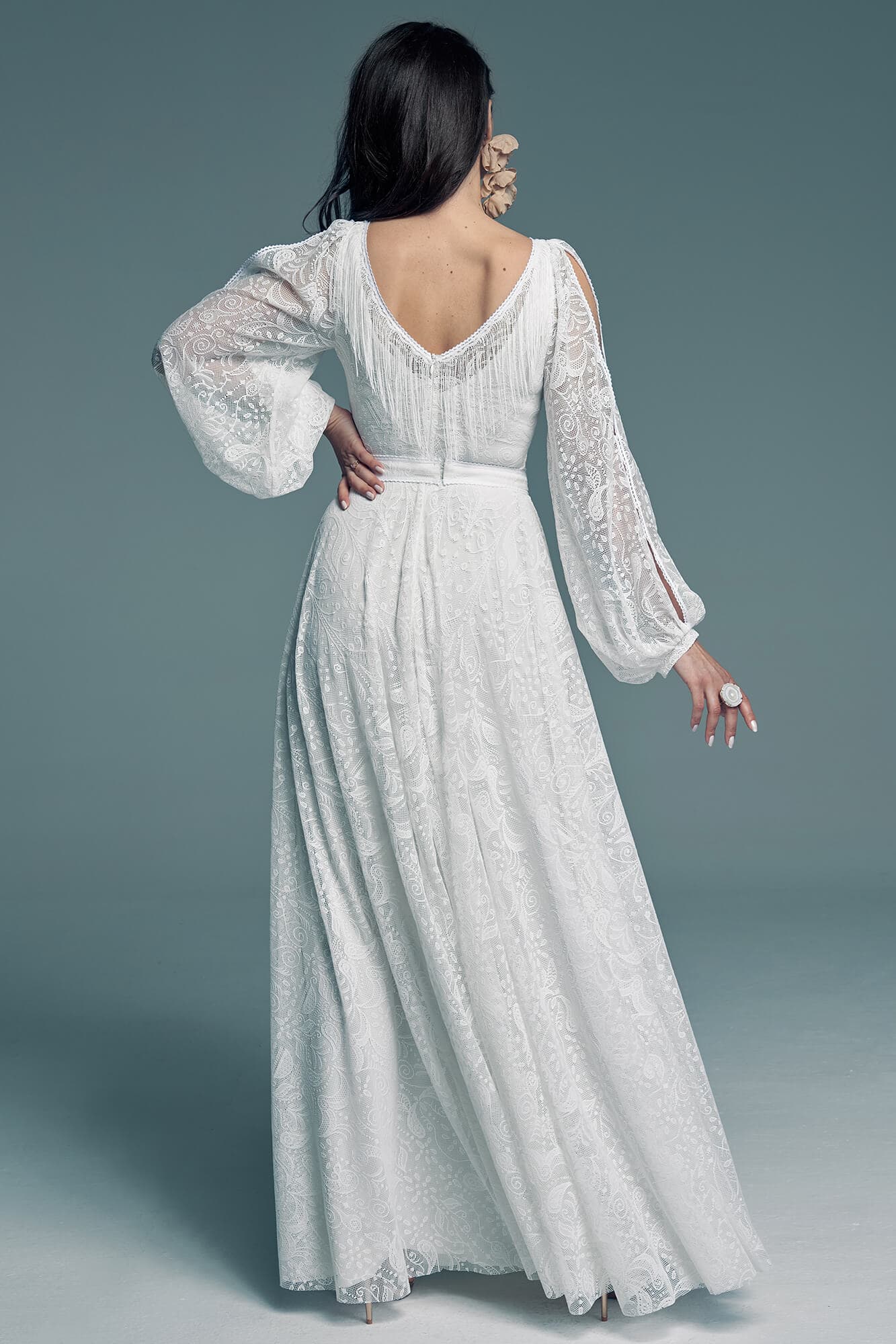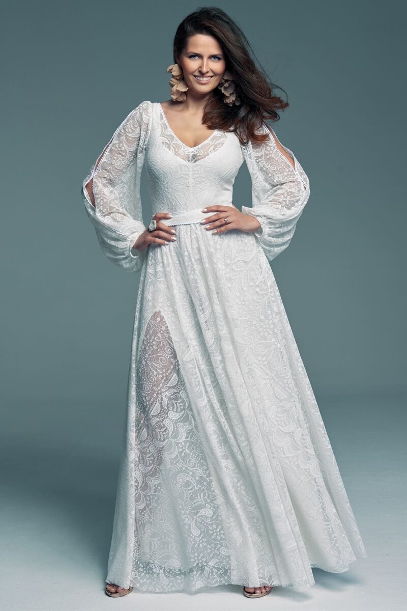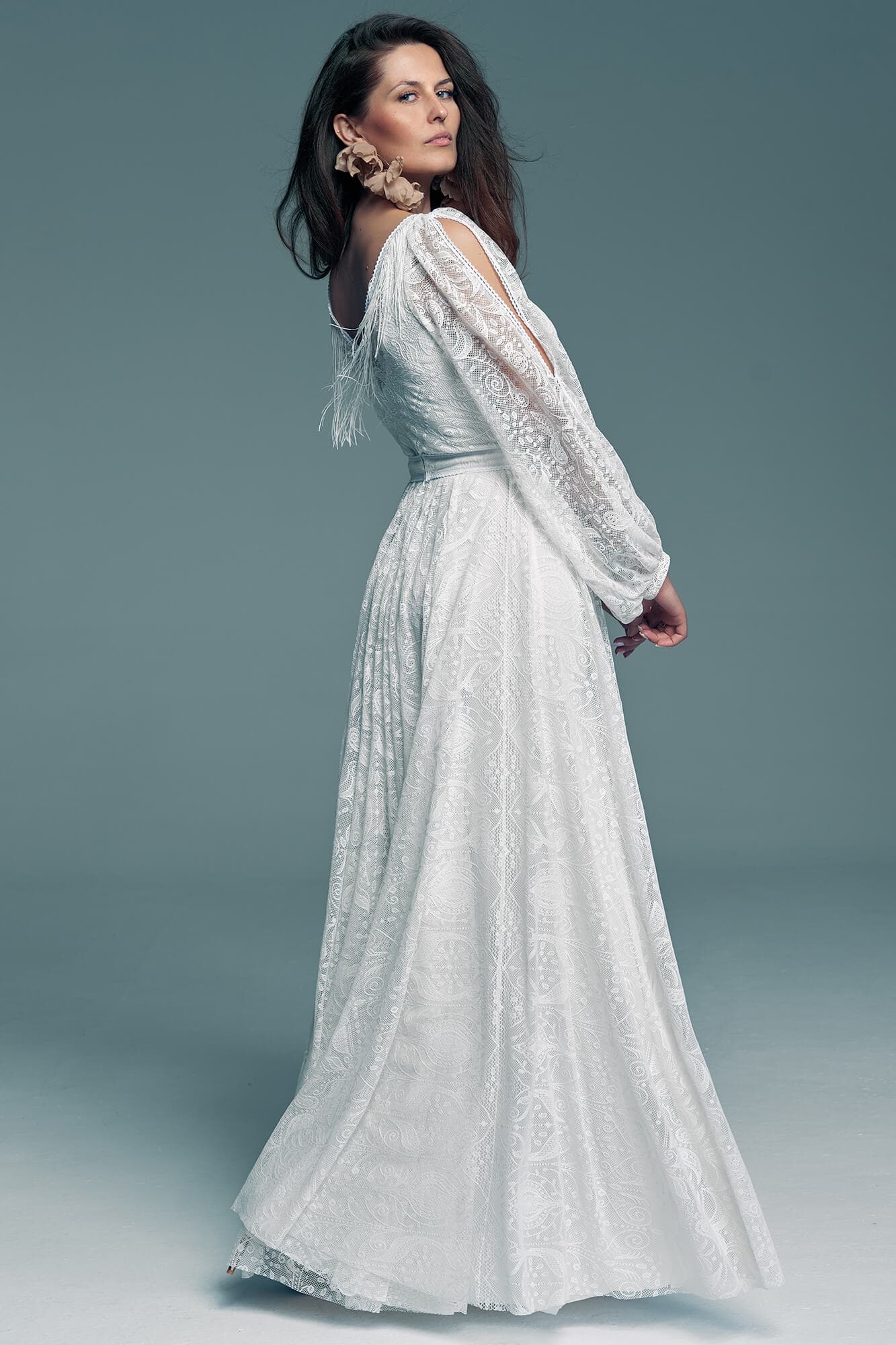 Ta suknia to model wyjściowy - możemy w niej zmienić praktycznie wszystko! Pogłębić lub spłycić dekolt, zmienić jego wykończenie, kształt, dodać lub odjąć falbankę czy frędzle. Rękawy mogą być dłuższe lub krótsze, mieć inny kształt niż te na zdjęciu. Może też nie być ich wcale. Tiul w spódnicy można dodać (lub odjąć) na wierzchu, albo pod spodem. Podszewka może być długa lub krótka w odcieniach bieli i beżu. Rozcięcie na nogę i tren można dodać lub usunąć praktycznie w każdym modelu.