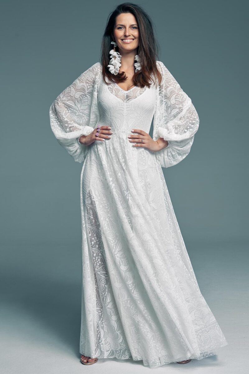 Ta suknia to model wyjściowy - możemy w niej zmienić praktycznie wszystko! Pogłębić lub spłycić dekolt, zmienić jego wykończenie, kształt, dodać lub odjąć falbankę czy frędzle. Rękawy mogą być dłuższe lub krótsze, mieć inny kształt niż te na zdjęciu. Może też nie być ich wcale. Tiul w spódnicy można dodać (lub odjąć) na wierzchu, albo pod spodem. Podszewka może być długa lub krótka w odcieniach bieli i beżu. Rozcięcie na nogę i tren można dodać lub usunąć praktycznie w każdym modelu.