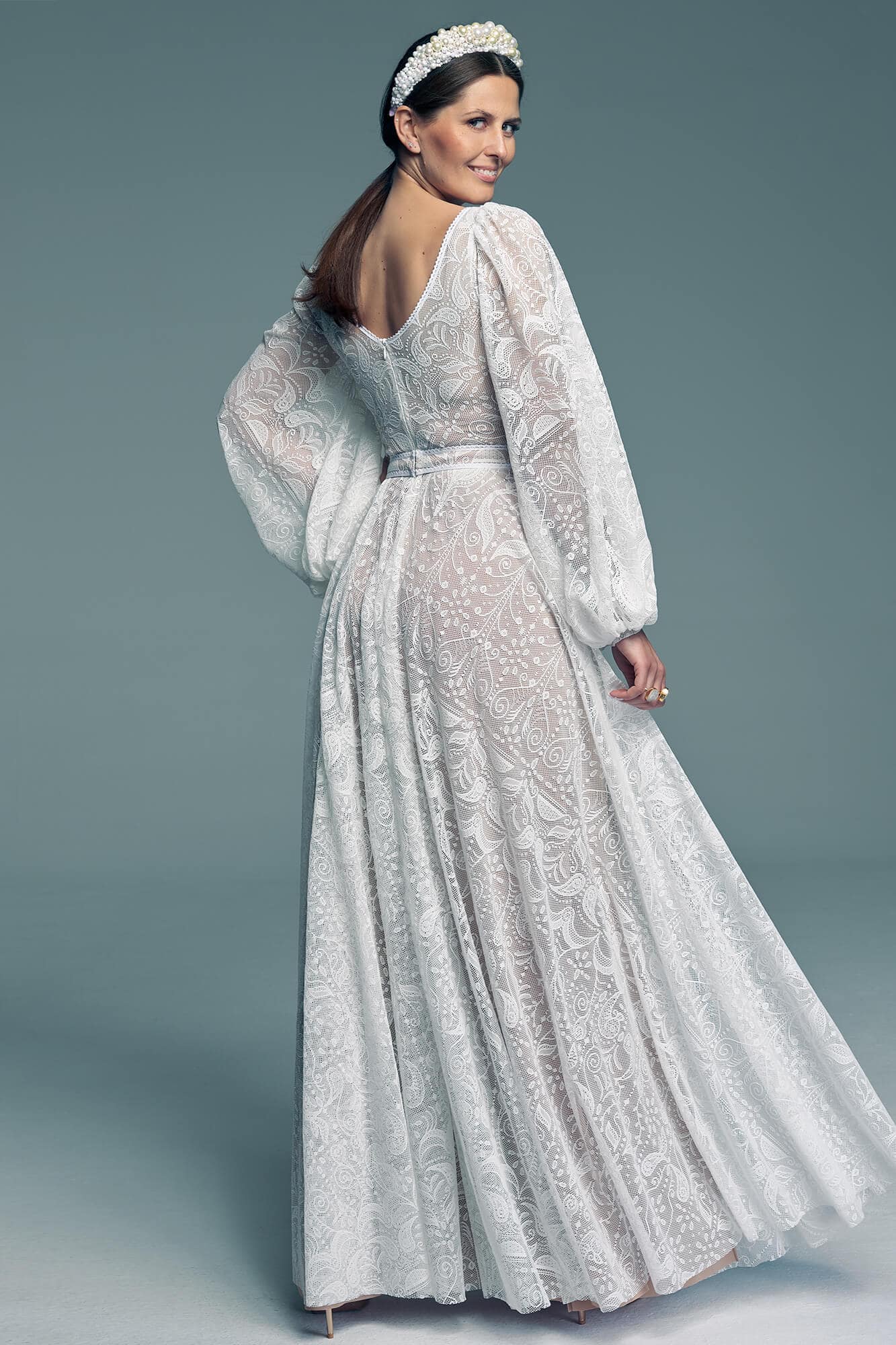 Ta suknia to model wyjściowy - możemy w niej zmienić praktycznie wszystko! Pogłębić lub spłycić dekolt, zmienić jego wykończenie, kształt, dodać lub odjąć falbankę czy frędzle. Rękawy mogą być dłuższe lub krótsze, mieć inny kształt niż te na zdjęciu. Może też nie być ich wcale. Tiul w spódnicy można dodać (lub odjąć) na wierzchu, albo pod spodem. Podszewka może być długa lub krótka w odcieniach bieli i beżu. Rozcięcie na nogę i tren można dodać lub usunąć praktycznie w każdym modelu.