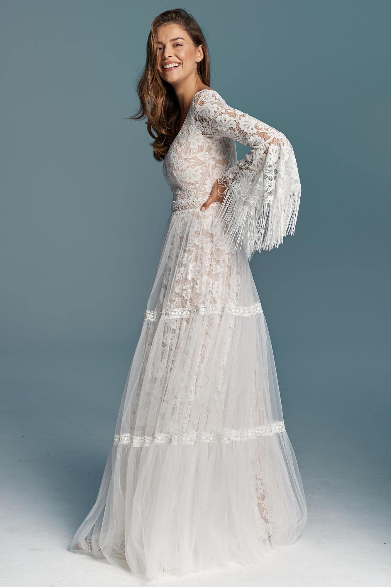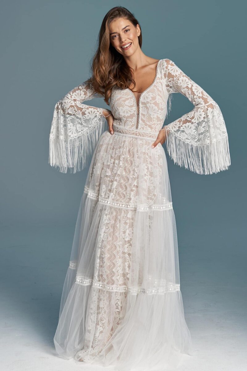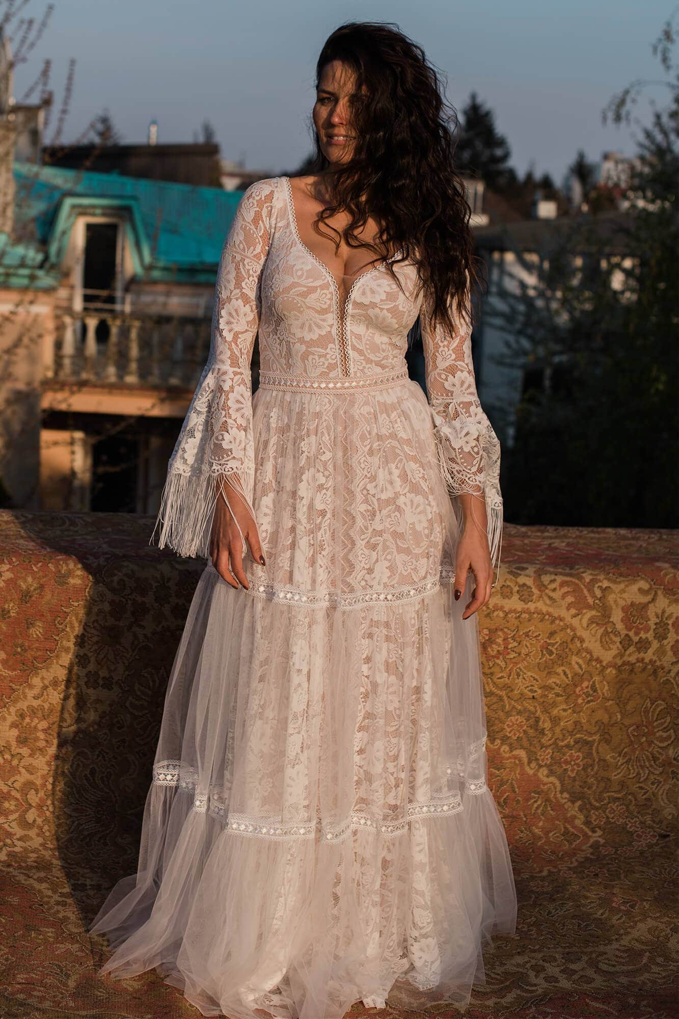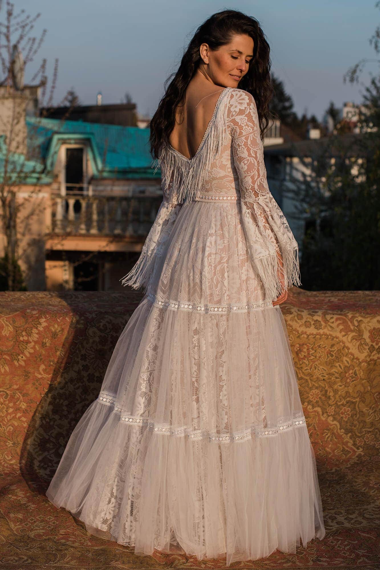 Ta suknia to model wyjściowy - możemy w niej zmienić praktycznie wszystko! Pogłębić lub spłycić dekolt, zmienić jego wykończenie, kształt, dodać lub odjąć falbankę czy frędzle. Rękawy mogą być dłuższe lub krótsze, mieć inny kształt niż te na zdjęciu. Może też nie być ich wcale. Tiul w spódnicy można dodać (lub odjąć) na wierzchu, albo pod spodem. Podszewka może być długa lub krótka w odcieniach bieli i beżu. Rozcięcie na nogę i tren można dodać lub usunąć praktycznie w każdym modelu.