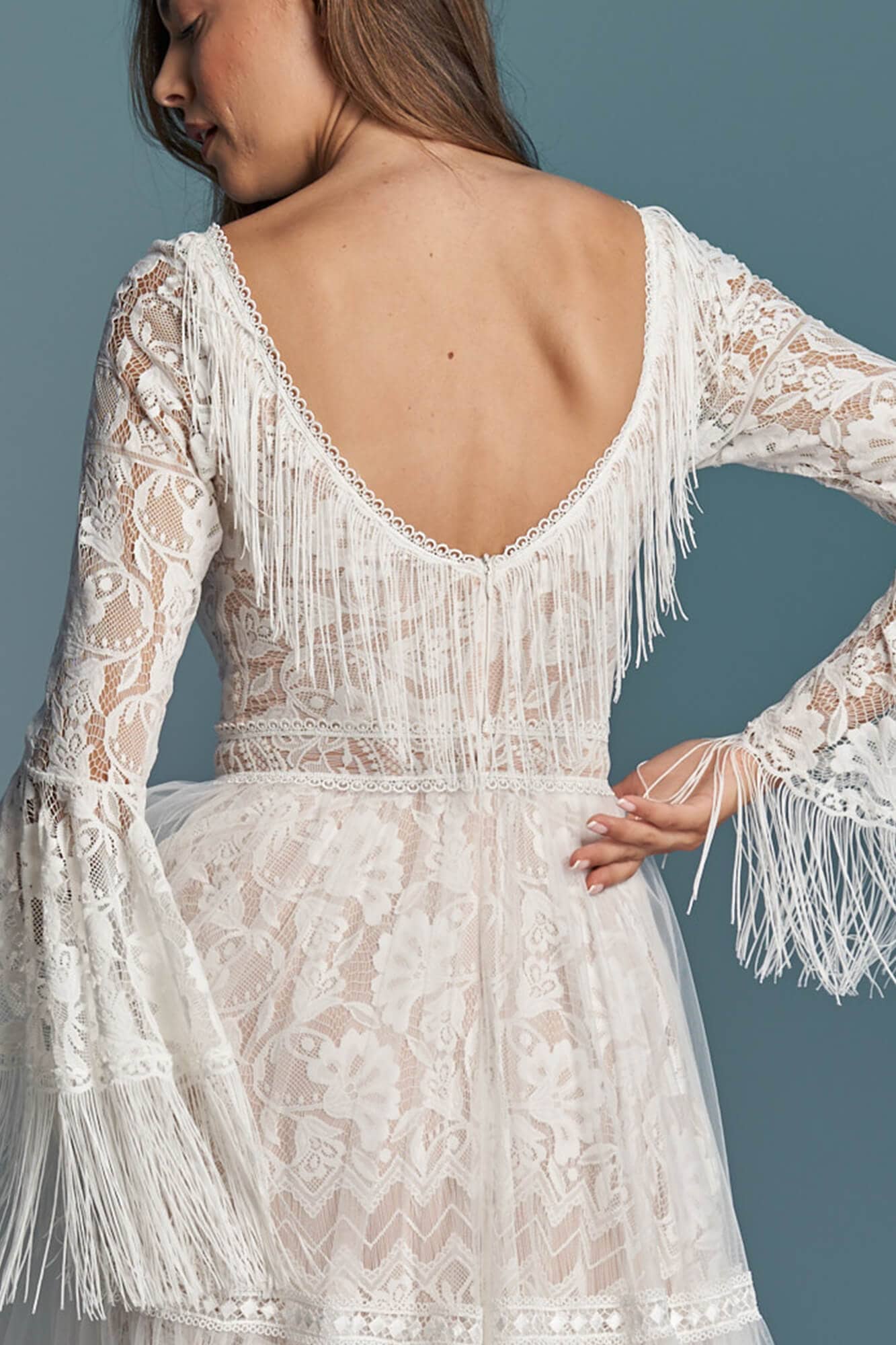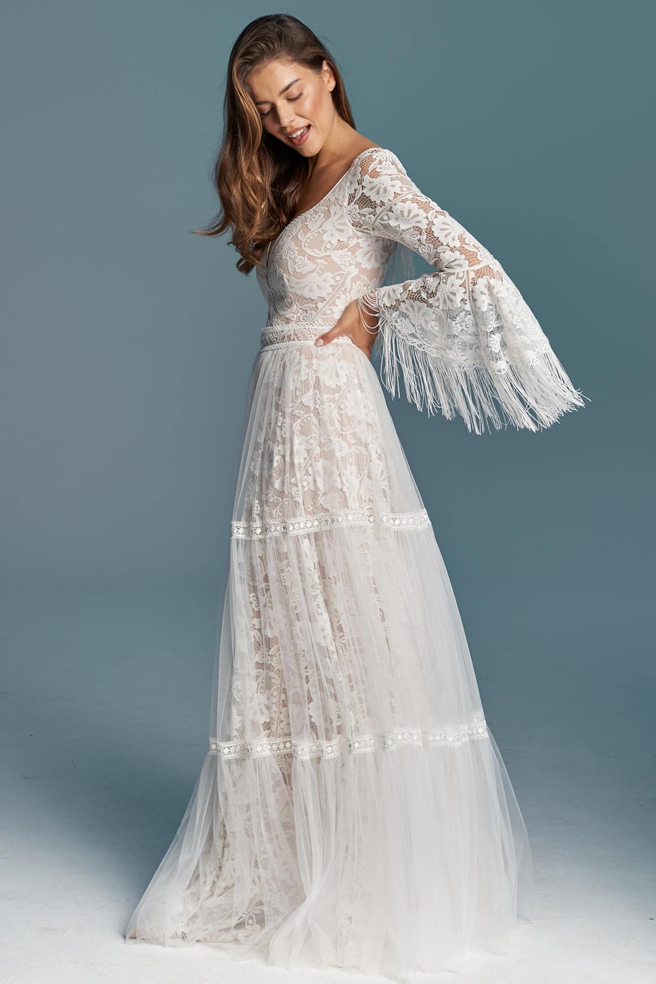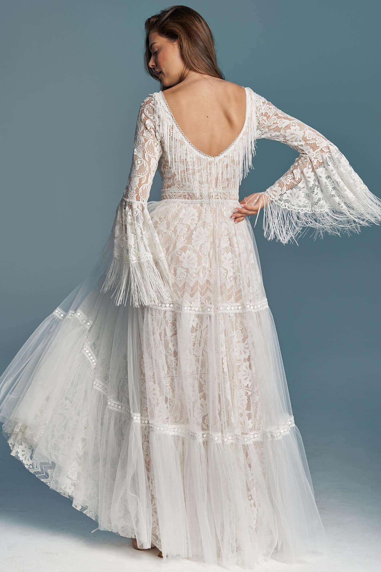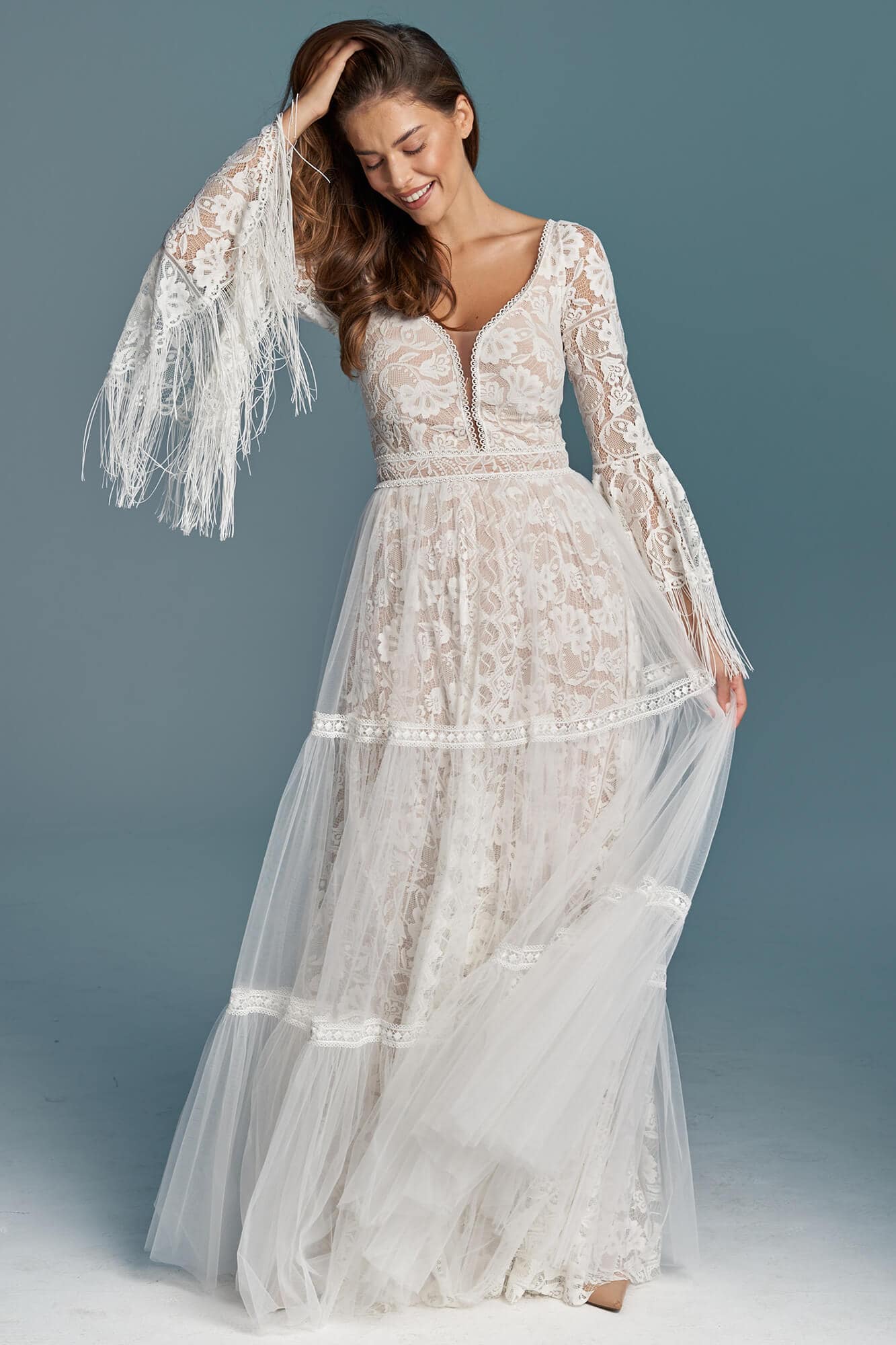 Ta suknia to model wyjściowy - możemy w niej zmienić praktycznie wszystko! Pogłębić lub spłycić dekolt, zmienić jego wykończenie, kształt, dodać lub odjąć falbankę czy frędzle. Rękawy mogą być dłuższe lub krótsze, mieć inny kształt niż te na zdjęciu. Może też nie być ich wcale. Tiul w spódnicy można dodać (lub odjąć) na wierzchu, albo pod spodem. Podszewka może być długa lub krótka w odcieniach bieli i beżu. Rozcięcie na nogę i tren można dodać lub usunąć praktycznie w każdym modelu.