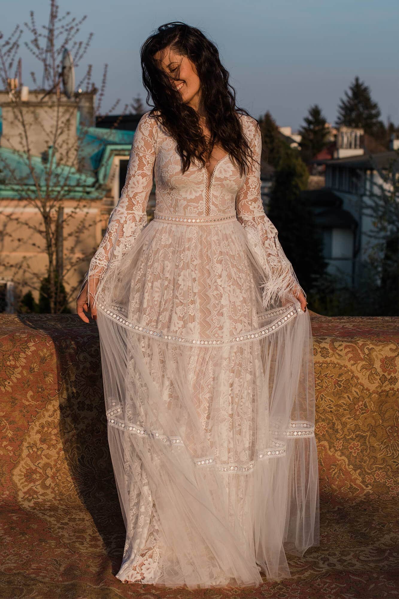 Uszyta ze sprawdzonych i przetestowanych przez nas materiałów. Używane przez nas koronki są mięciutkie, a dzięki swej lekkości cudownie układają się na sylwetce i pięknie wirują w tańcu. Ich elastyczność sprawia, że pracują z Twoim ciałem. Zapewniają komfort rosnącemu ciążowemu brzuszkowi. Praktycznie wszystkie nasze koronki są łatwe do prania w domowej pralce i niegniotące, dzięki czemu swoją suknię spokojnie możesz spakować do walizki i zabrać na romantyczną sesję poślubną.